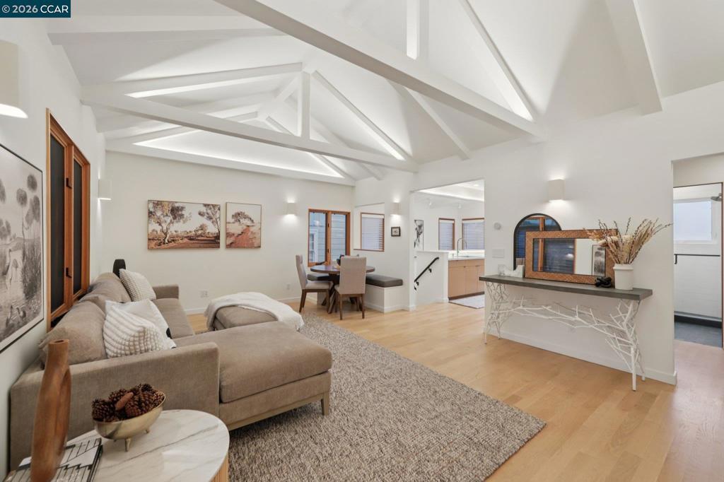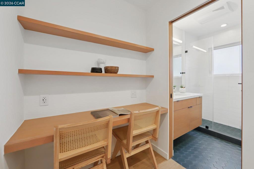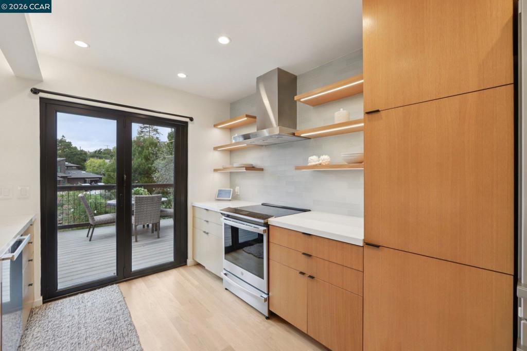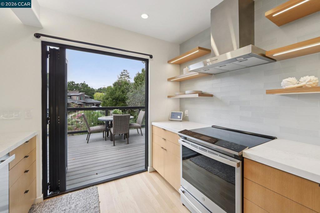 Discover eco-modern living in this 3BR/2BA Berkeley Hills home, where smart technology meets comfort. A Google Nest system, six-zone radiant heating/cooling, and passive ventilation ensure an ideal climate. Vaulted ceilings and soft LED lighting create a bright, welcoming atmosphere, while the chef’s kitchen features custom cabinetry, high-end appliances, and open shelving. The main level includes a bedroom with peaceful views, a home office with built-in desk, and a spa-inspired bathroom. An attached garage with EV charger is finished as additional living space. The lower level offers a family room perfect for entertaining, opening to a ~400 SF patio and multi-tier, low-maintenance yard, along with two bedrooms, a full bath, laundry, and storage. Ideally located near UC Berkeley, Kensington shops, Solano Avenue, Tilden Park, and AC Transit. - Home Energy Score Deferral until 6/29/31.