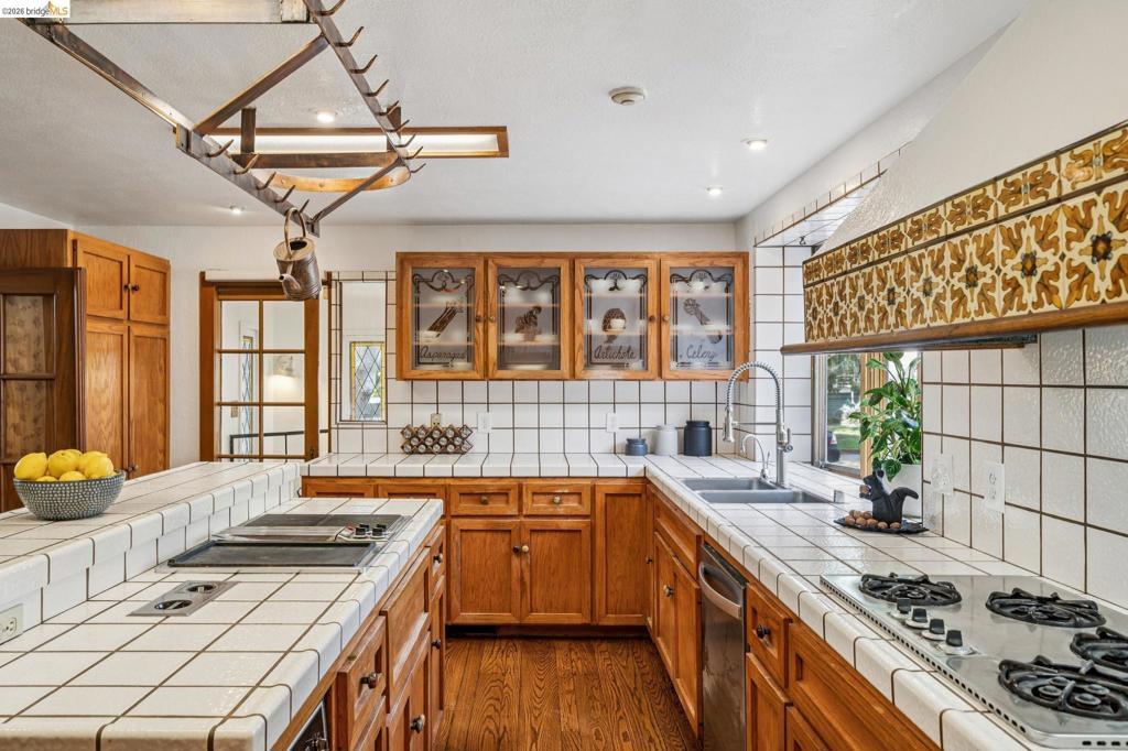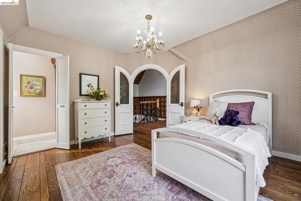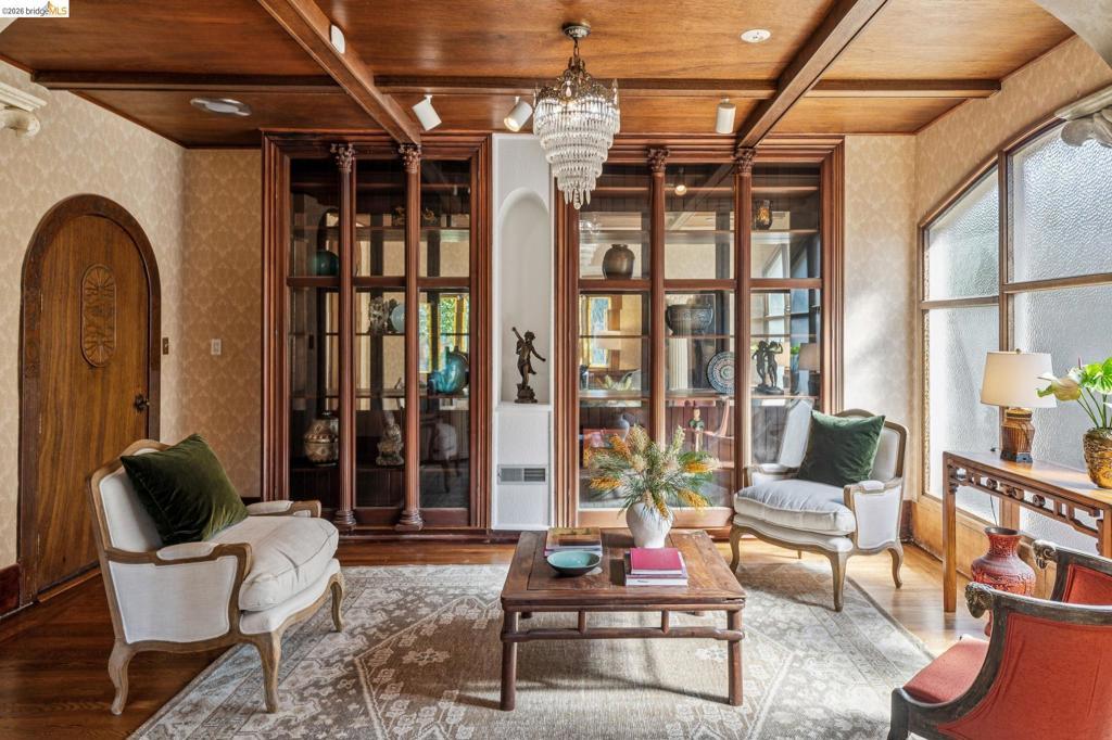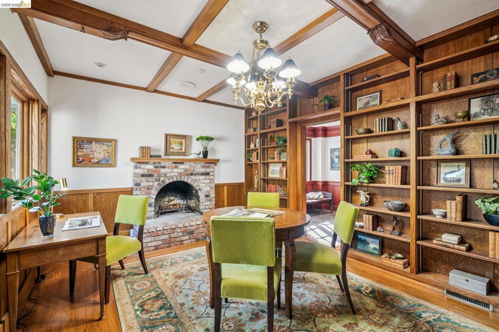 There are times when a property exudes so much character and charm that you are compelled to explore it. This is one such home and it truly delights the senses. Welcome to 824 Paru Street, an enchanting 1910 Storybook home in Alameda’s coveted Gold Coast—just one block to the lagoon and Franklin Park/Franklin Elementary. Behind a brick garden wall and gated entry, this whimsical 3,523 SqFt home showcases steep gables, sweeping curved rooflines, arched doorways, stained glass, and classic English cottage charm—a rare and beautifully preserved example of early 20th century design. Inside, the living room is a true centerpiece with rich wood paneling, leaded glass windows, and a striking fireplace with custom millwork, while classical wainscoting lines the halls leading to a dramatic second-floor landing beneath the steep roofline. Upstairs, new red oak floors complement three primary bedrooms, each with an ensuite bath (2.5 total), while original white oak floors in the living and dining rooms have been thoughtfully restored. The backyard patio invites quiet moments under a wisteria-draped gazebo. Public record notes five bedrooms; the lower level lives as a spacious family room with copper fireplace and a refined library or office with adjacent full bath. This home is truly a gem!