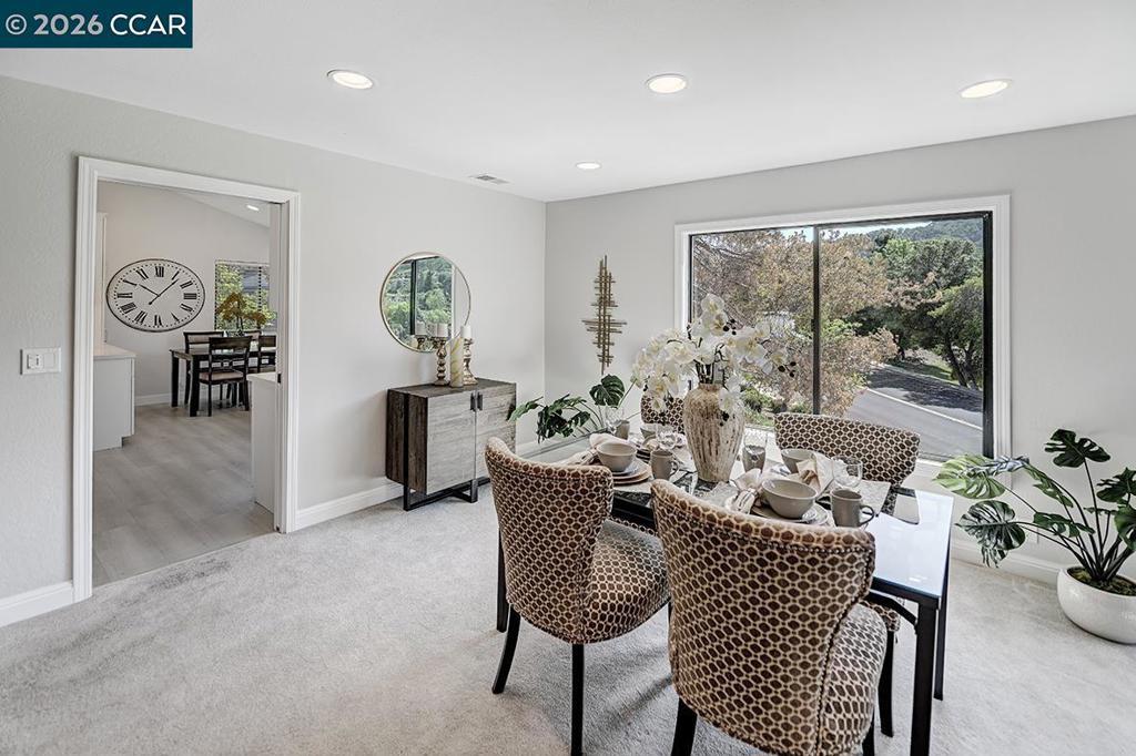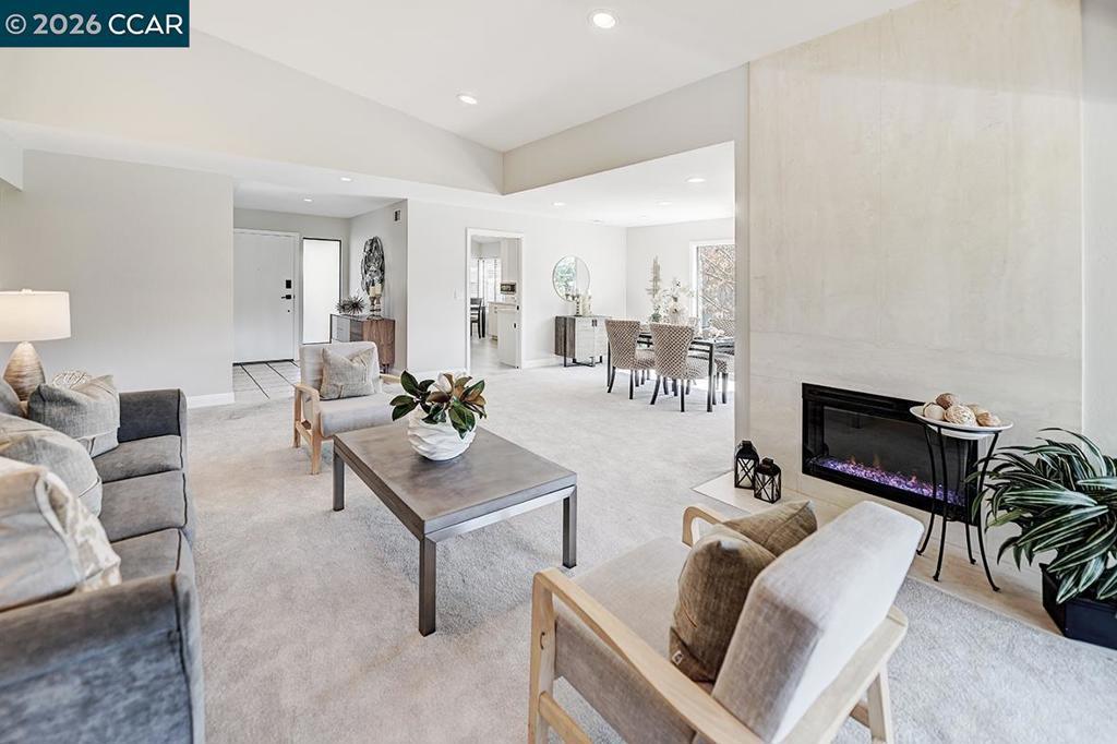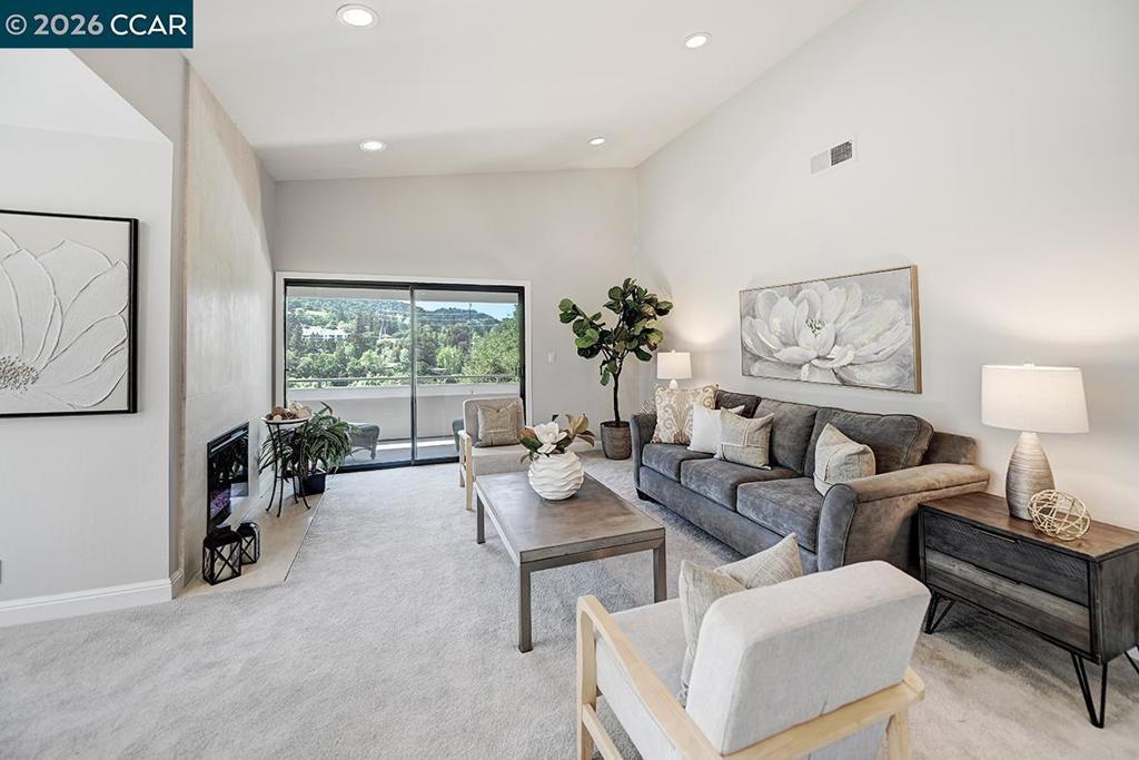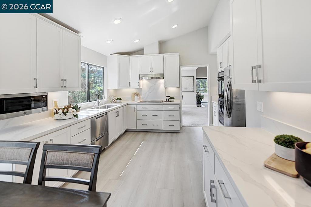 Discover elevated living in this desirable Cascade model, featuring a spacious great room–style living and dining area that opens to a wraparound deck with sweeping views of Rossmoor’s Dollar Ranch golf course, rolling hills, and serene valley. Vaulted ceilings in both the living area and eat-in kitchen create a light, airy ambiance, enhanced by recessed lighting and updated flooring throughout. The inviting living room features a beautiful stone fireplace with an electric insert. The updated kitchen offers quartz countertops, newer custom cabinetry, stainless steel appliances, and a double-drawer dishwasher with ample storage. Both bathrooms are stylishly remodeled with new vanities, custom stone, and designer tile. A separate laundry area includes full-size washer and dryer with added cabinetry. Complete with a detached garage and nearby parking, this home blends comfort, style, and convenience. Views: Ridge