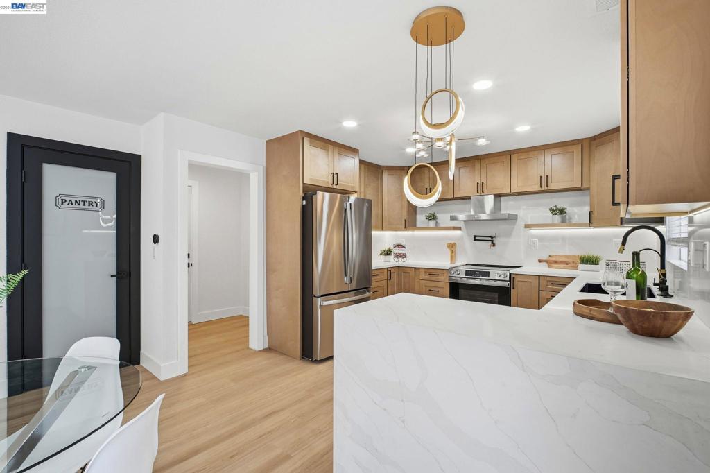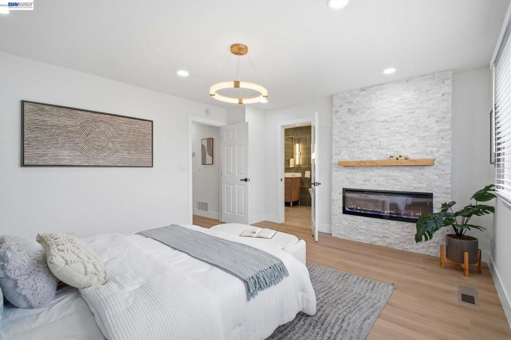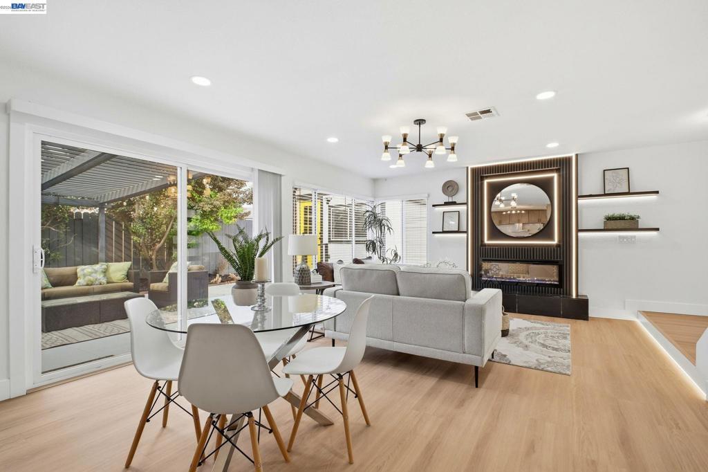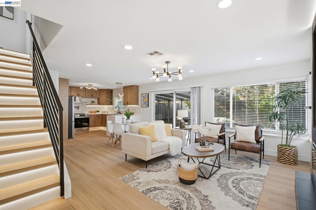 Welcome to a truly standout home in the heart of Union City, where modern design meets everyday comfort. This beautifully upgraded 3-bedroom, 2.5 bath residence features a refined, contemporary aesthetic throughout. The fully remodeled kitchen is anchored by a striking quartz waterfall peninsula, complemented by brand-new GE appliances and integrated LED cabinet lighting for a clean, elevated look. The open-concept living space is enhanced by two sleek, modern fireplaces—both pre-wired for seamless TV installation creating warm, functional gathering areas. A custom open-rail staircase with illuminated LED steps adds a distinctive architectural touch. Upstairs, spacious bedrooms and updated bathrooms finished with Italian tile provide both comfort and style. The fully finished garage includes premium Vevor flooring along with a new GE washer and dryer. Outside, enjoy a large driveway with parking for up to four vehicles, plus professionally landscaped front and backyard spaces featuring a pergola, swings, and a private setting ideal for relaxing or entertaining. Conveniently located near top-rated schools, shopping, dining, and BART, this home offers both accessibility and lifestyle. Homes with this level of finish and design rarely come available for an opportunity like this.