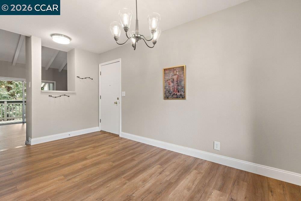 Modern Condo Living in the Heart of Walnut Creek. Welcome to this beautifully updated 1-bedroom, 1-bathroom condominium located in the highly desirable Walnut Park community. Offering 729 sq. ft. of thoughtfully designed living space, this home perfectly blends modern style with suburban convenience. The bright, open-concept living room features stylish laminate flooring and a cozy fireplace, ideal for relaxing evenings. A chef's delight, the kitchen boasts solid surface/quartz countertops, a subway tile backsplash, and a functional breakfast bar. It comes fully equipped with a refrigerator, electric range, dishwasher, and even a built-in wine refrigerator. Large windows and a private balcony overlook the serene community pool area, providing a peaceful outdoor escape. Enjoy the convenience of a wall furnace for heat, a spacious bedroom with mirrored closet doors, and an updated bathroom featuring tile flooring and a shower-over-tub. This condo puts you at the center of everything Walnut Creek has to offer: Minutes from Walnut Creek BART and easy access to the I-680/Hwy 24 interchange. Walking distance to Downtown Walnut Creek, renowned for world-class shopping at Broadway Plaza and exceptional dining. Top rated schools within the prestigious Walnut Creek School District