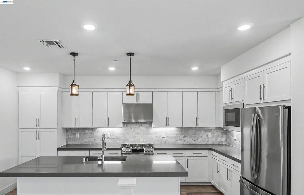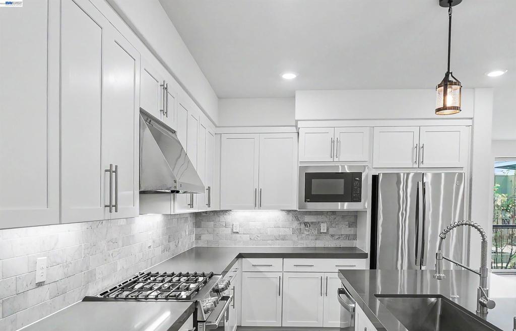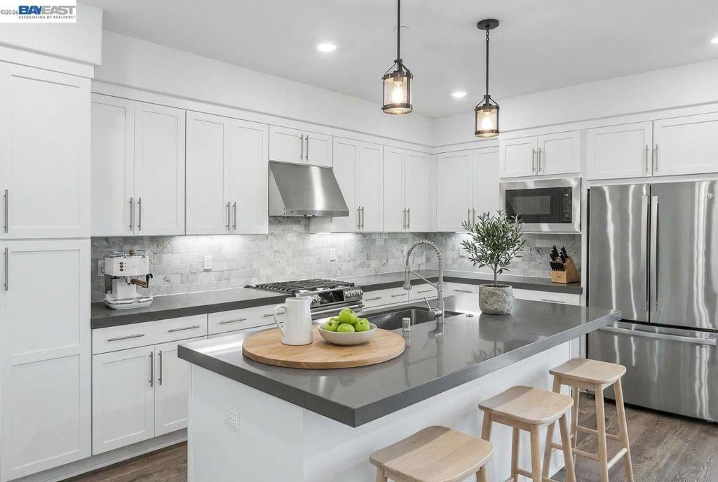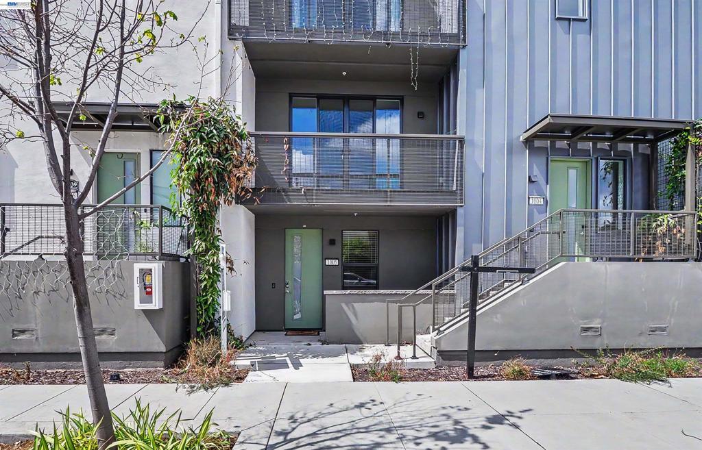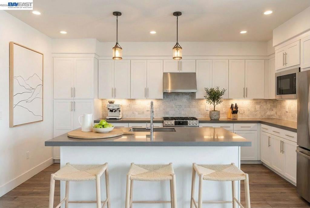 Welcome to this stunning home in Fremont's sought-after Innovation Community, offering one of the best floor plans. Built in 2020, this modern residence features 3 beds, 3 baths, 2 story home, 1798 sqft of bright open living space, and attached 2-car side-by-side garage. The main level includes a private bedroom with ensuite-ideal for guests or a home office. Upstairs showcases a gourmet kitchen with quartz countertops, subway backsplash, oversized island, and premium appliances, flowing into spacious living and dining areas filled with natural light. Enjoy a wraparound balcony perfect for relaxing or entertaining. The primary suite offers a spa-like bath and custom walk-in closet. Upgrades include owned solar panels, EV charger, tankless water heater, water softener, smart home features, Ring doorbell, and a WiFi-enabled garage. Community amenities include pool, gym, clubhouse, and parks. Prime location near BART, major commute routes, and directly across from Lila Bringhurst Elementary School (offers a Mandarin immersion program).