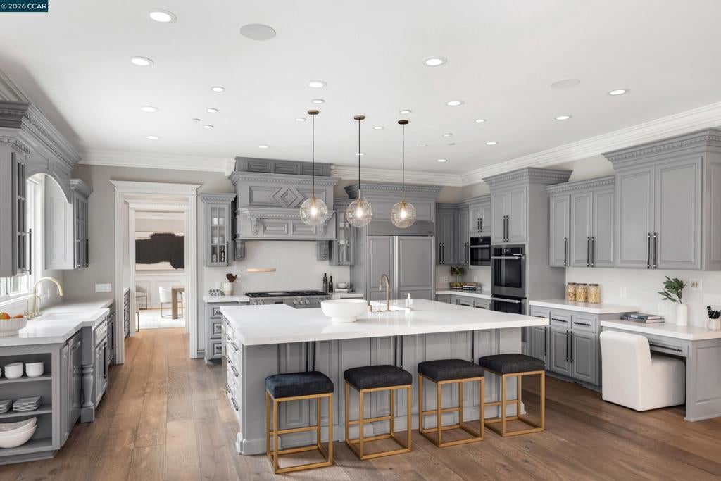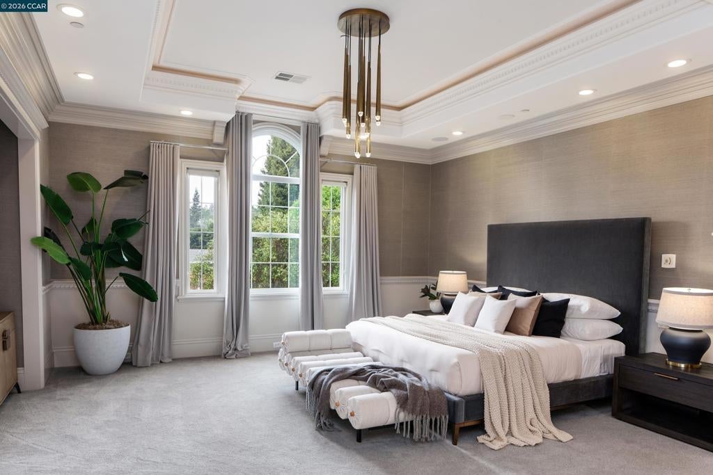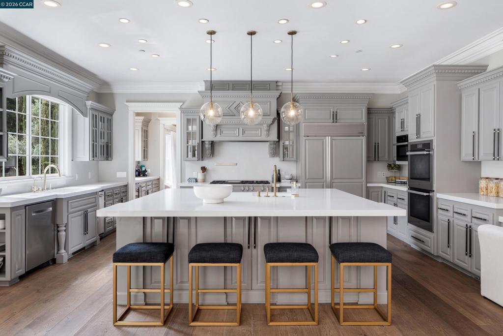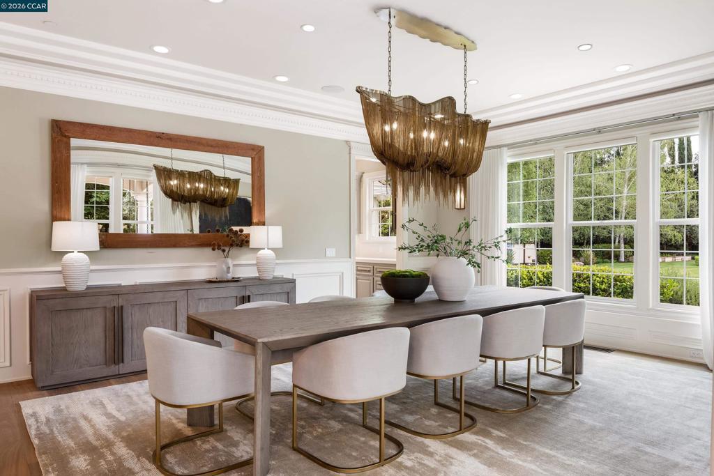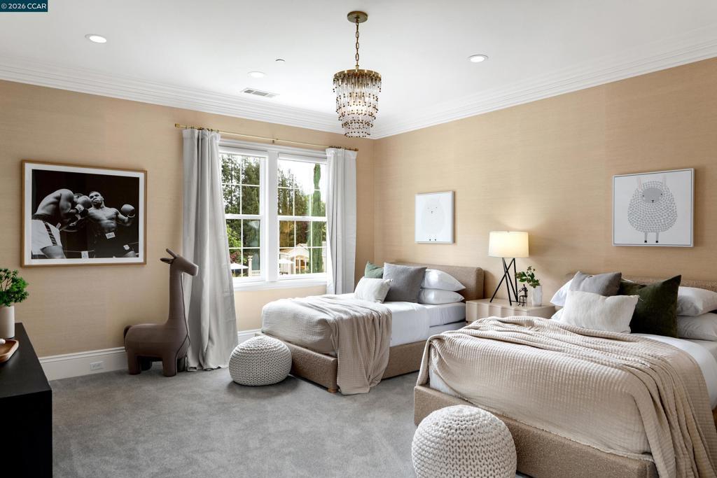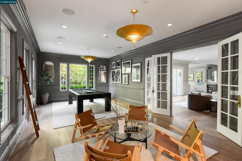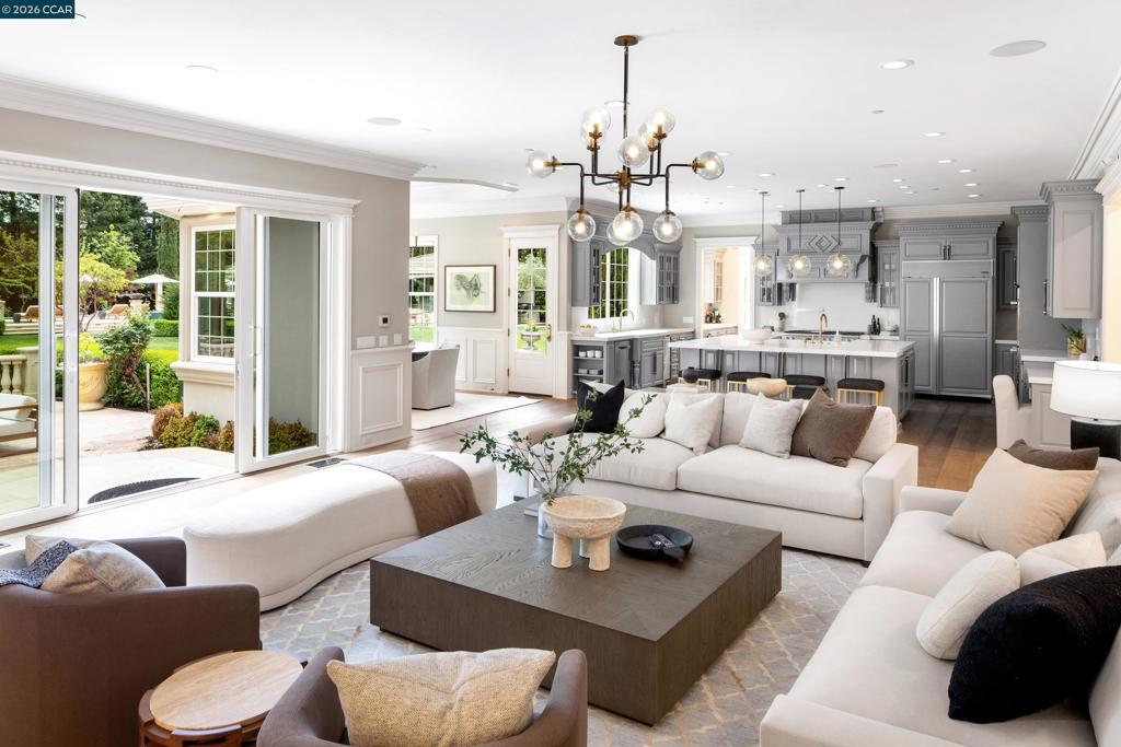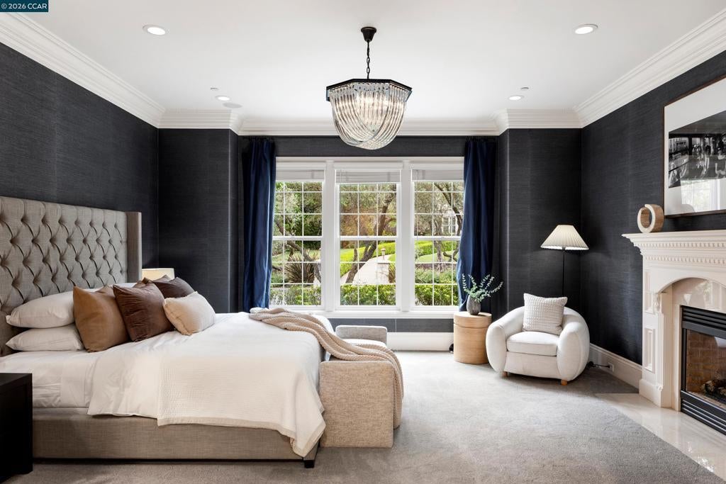 Warriors’ superstar Steph Curry made this estate his home; now it can be yours. Its heart is the expansive open-concept kitchen and family room. The kitchen offers elite appliances, quartzite countertops, a butler’s pantry, an island with seating for 4, and a breakfast nook with garden views seating 6 more. A striking 2-sided fireplace links the living and dining rooms. A spacious office makes work from home a pleasure. Four spacious bedrooms lie upstairs, each with en-suite baths and generous closets, centered around a large media/play room. The principal suite has a fireplace, wet bar, sitting room and 3 immense walk-in closets. The spa-inspired bath features a shower with dual shower heads, a bench, and a stand-alone soaking tub, all within the shower’s glass walls. The 5th bedroom, ideal for guests, lies downstairs, assuring privacy. The back yard is roughly a flat acre, with more than 50 redwoods, 30 Italian cypress trees, cherry trees, imported olive trees, fountains, firepit, shaded lounge areas, putting green, playhouse, and stunning entertainment pavilion with fireplace, heaters, fans, and grill. A pool house offers another bedroom, 2 full baths, kitchen, laundry and sauna. The 6-car garage and motor court provide abundant parking.