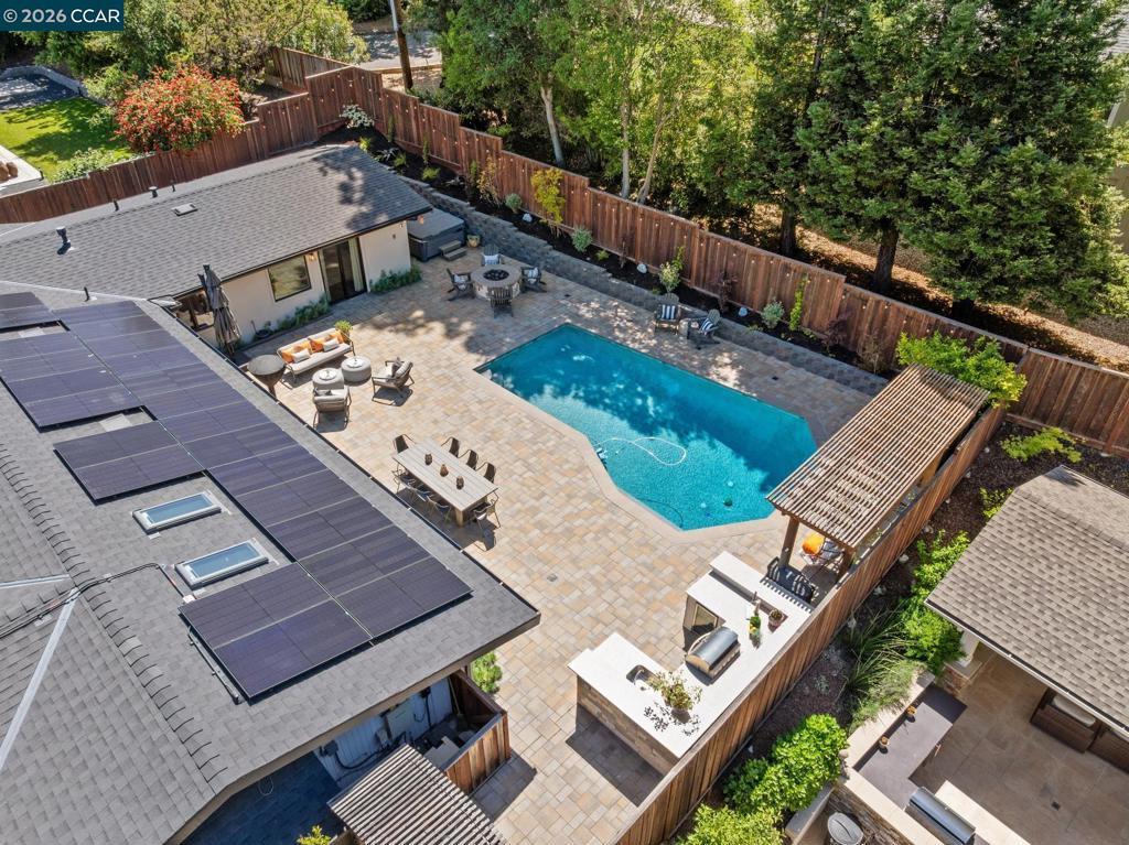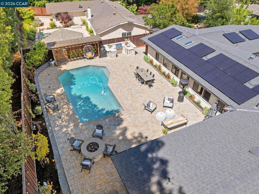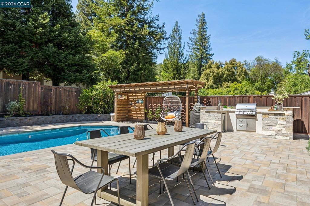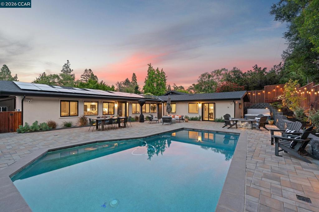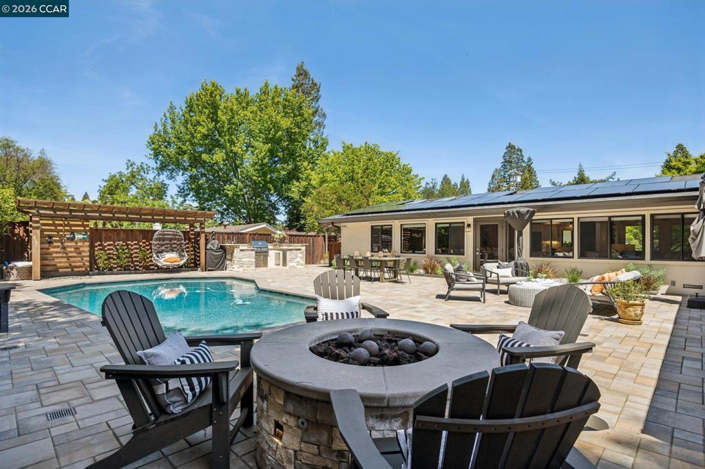 Stunning single-level home in sought-after Westside Alamo, moments from the Iron Horse Trail. Tucked on a private court, this beautifully remodeled 3-bedroom, 2.5-bath home features an open-concept layout, over $600K in updates, and a designer kitchen with an oversized island, high-end appliances, and custom cabinetry. The resort-style backyard is built for California living with a saltwater pool, spa, paver patio, outdoor kitchen, outdoor shower, and gas fire pit. A private bedroom wing includes a serene primary suite with backyard views, sliding glass doors, a remodeled bath, and a walk-in closet. Additional features include FULLY OWNED SOLAR, newer roof, French drains, tankless water heater, and skylights. Close to parks, trails, top-rated SRV schools, and local amenities.