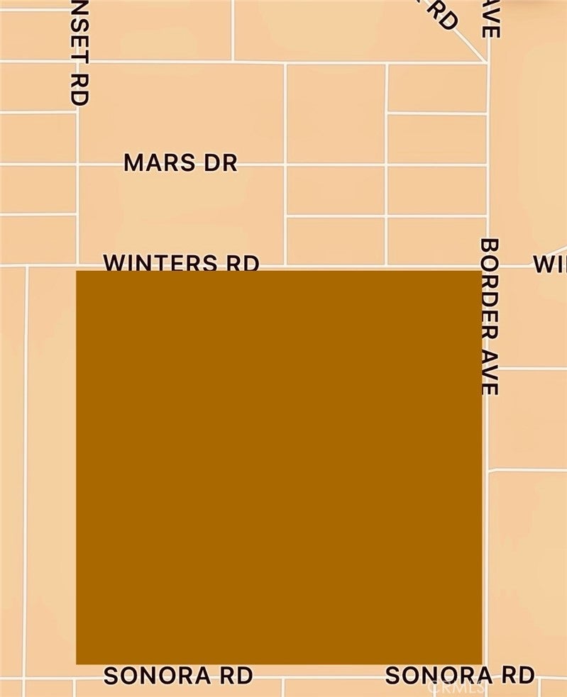 A developer's dream. This is the largest parcel available on the market in Joshua Tree. One square mile. About 22 miles northwest of the Joshua Tree National Park which over 3 million tourists visit every year. This part of the park is home to over 8000 climbing routes, making Joshua Tree a world-famous destination for rock climbers.Two separate parcels 0631-151-03-0000 (480 acres) & 0631-151-04-0000(160 acres) total 640 acres with one mile of paved main road.Check with the city for building codes and more possibilities. Located between Border Ave, Winters Rd, Sunset Rd & Sonora Rd. Take Highway 62 to Sunburst Ave, then turn right on Border Ave to land.