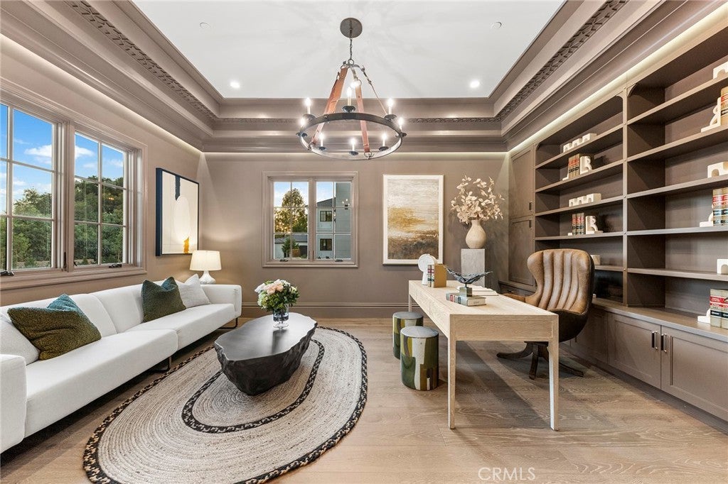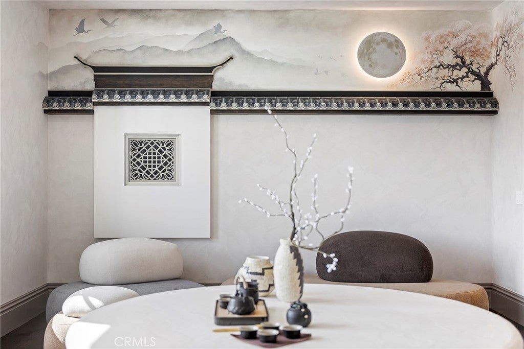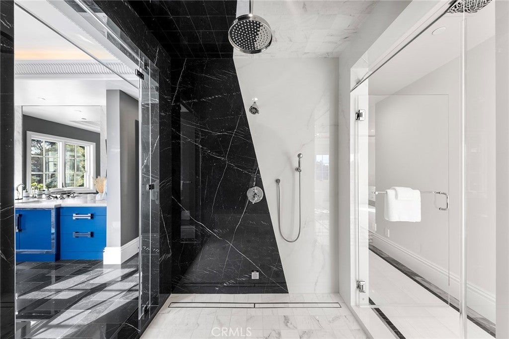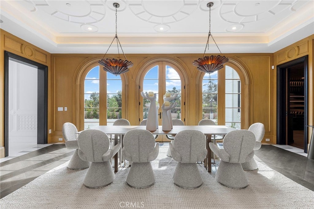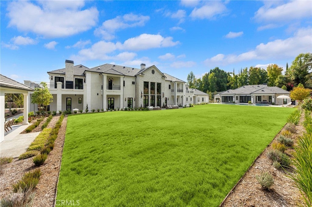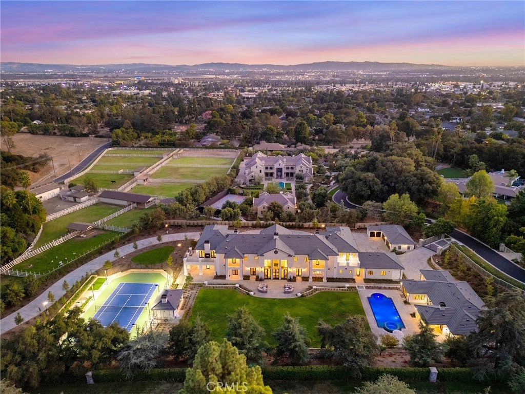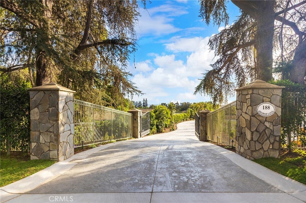 Nestled in the exclusive, 24/7 guard-gated enclave of Bradbury Estates, this estate offers an unparalleled gateway to a life of exceptional luxury and distinction, perfect for those seeking an escape from the ordinary. Set on an expansive 116,164 SF square lot, this mansion offers a expansive, level landscape with sweeping views from every angle. The 14,780 SF main building features a rectangular symmetry that allows for excellent natural light and integrated flow. With common areas in the center and bedrooms on both sides, the layout provides both functional convenience and enhanced privacy for its residents. The house dazzles with a bold Hollywood Regency style, blending sleek, sophisticated designs with striking contrasts. Gleaming gold accents, bold decorative touches, and chic organic modern influences form the heart of the home's show-stopping aesthetic. In the connected space encompassing the foyer, living room, formal dining room, family room, powder room, kitchen, and entertainment room, the cohesive design seamlessly ties these areas together in perfect harmony. The thoughtful selection and installation of stone and wood, combined with a clean, high-contrast color palette, creates a striking sense of design. The extensive use of wood elements infuses warmth, elevating the inviting atmosphere of the entire space. The mansion’s park-like grounds feature a resort-style pool, complemented by a sleek, modern 2,450 SF pool house. The stylishly designed space includes an open kitchen, living room, 2 en-suite bedrooms, a powder room, a poolside bathroom, massage room, sauna, steam room, dipping room, and a cabana with a fireplace. It also is adorned with a professionally lit tennis court. This extraordinary property stands as a timeless gem, poised to become a cherished family heirloom.