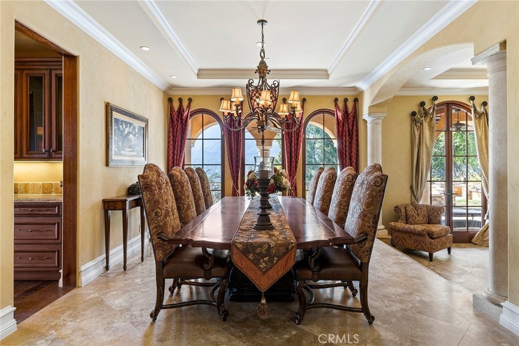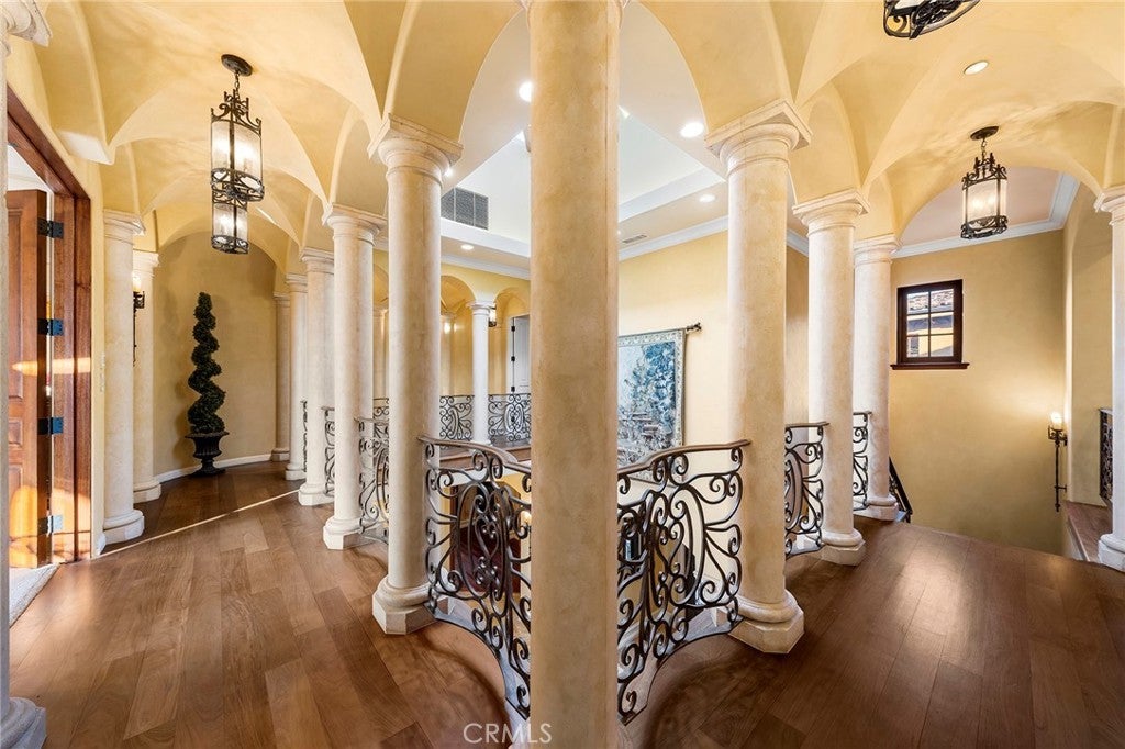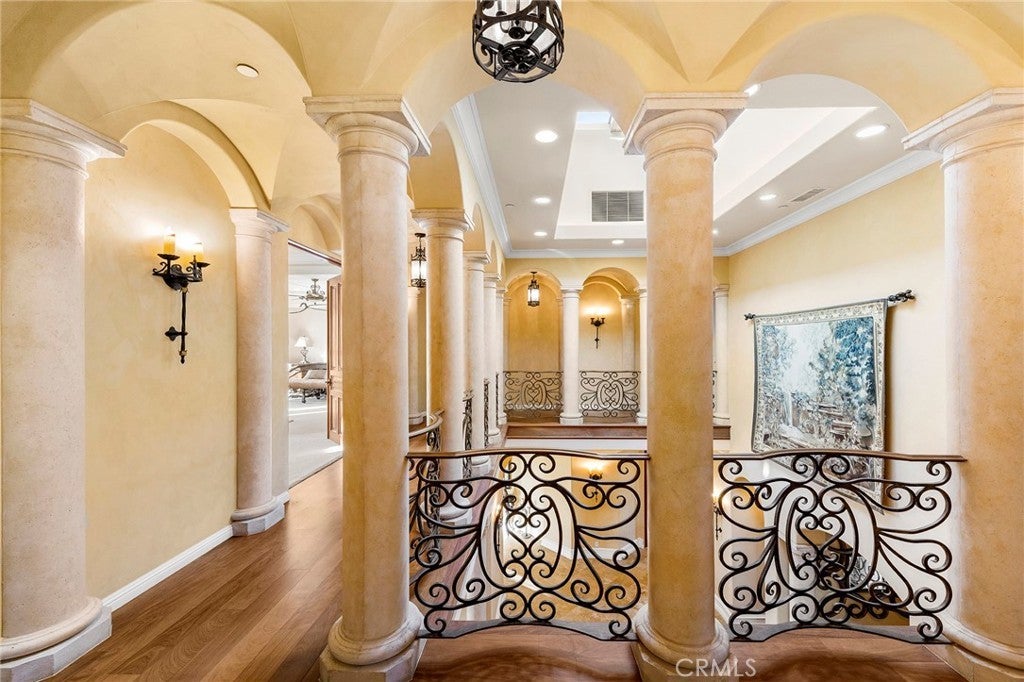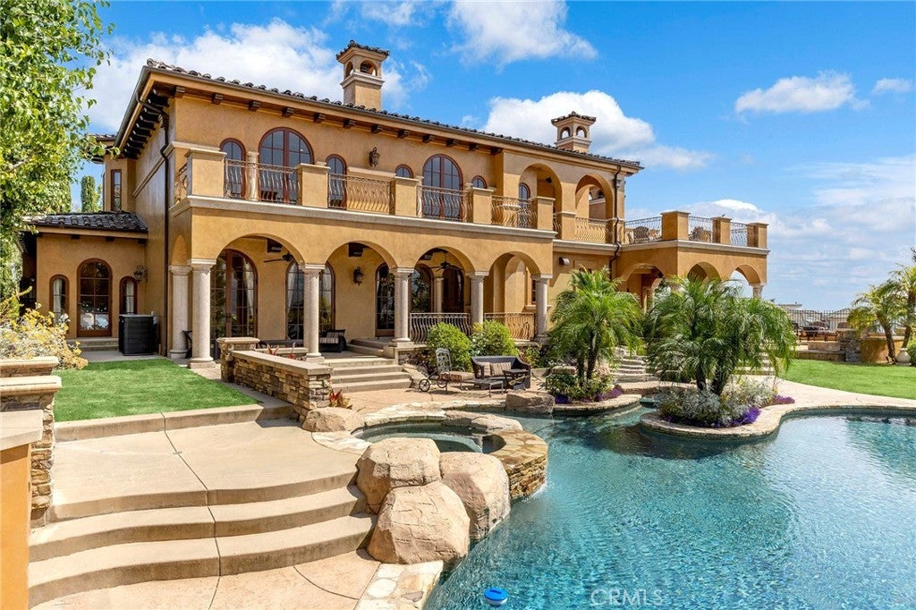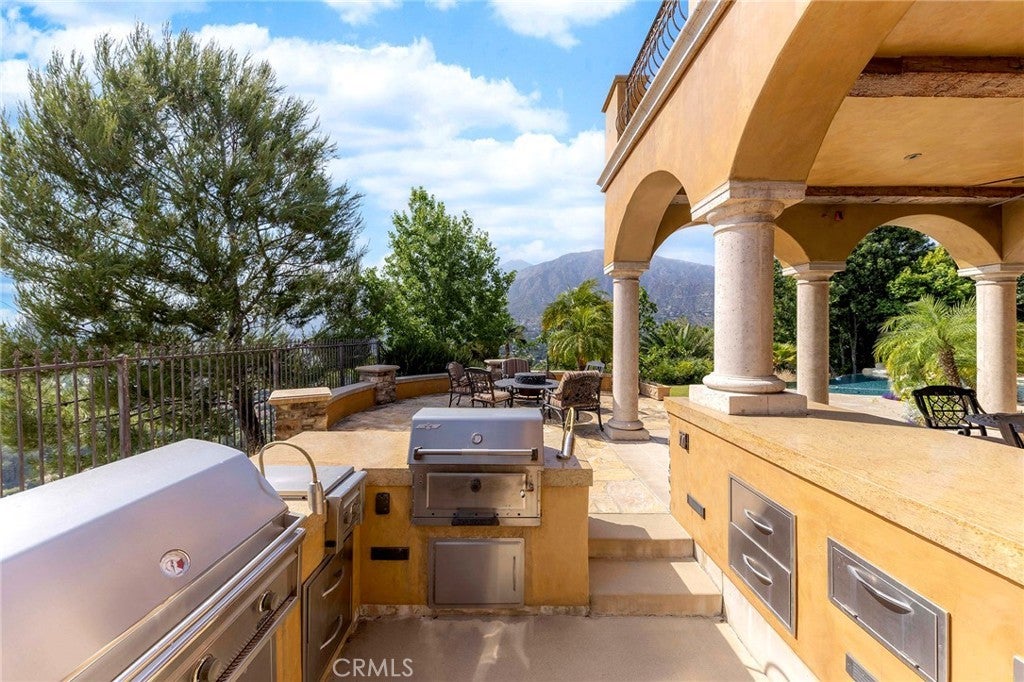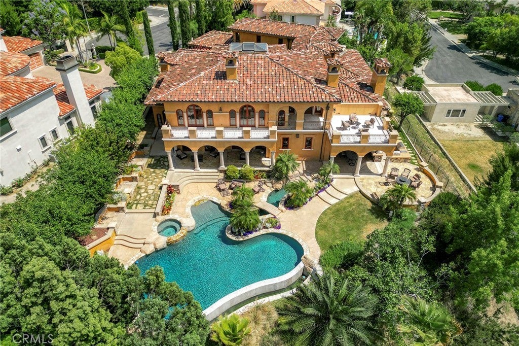 Welcome to an exceptional opportunity to own a custom estate in the exclusive Whispering Pines Summit—a premier gated community in Arcadia, offering 24-hour security, serene mountain surroundings, and access to award-winning schools. With only 49 luxury residences, this neighborhood is designed for the most discerning homeowners seeking privacy, elegance, and prestige. Positioned on a generous 1.02-acre lot (44,431 sq ft), this Mediterranean Revival estate was thoughtfully built in 2007 and spans 6,526 sq ft of refined living space. Gated and privately hedged, a charming Saltillo-tiled veranda leads to an impressive entry, unveiling a home rich in character and quality. The thoughtfully designed floor plan features 5 en-suite bedrooms and a versatile den, with ideal separation of space for multi-generational living or guests. On the main level, you’ll find a private guest suite, a spacious den area, a second en-suite bedroom with a dedicated office, providing flexibility for in-home work or extended family stays. Upstairs, the primary master suite offers a retreat-like experience with panoramic 360-degree mountain and city views from its private balcony, and is enhanced by a built-in Miele coffee station for the ultimate luxury morning routine. An additional corner suite bedroom with master-size proportions and a third en-suite bedroom complete the upper level accommodations. Crafted with premium Texas Oak wood throughout, the home exudes timeless sophistication. Entertain with ease in the formal and informal living areas, a dedicated cigar room, entertainment lounge, gourmet kitchen with Wolf appliances, separate wok kitchen, and a 24-hour temperature-controlled wine cellar. A private elevator ensures easy access to all levels—ideal for seniors or those seeking convenience. Outside, the resort-style backyard boasts an infinity-edge pool overlooking the scenic hills of Los Angeles—perfect for relaxation or entertaining under the stars. Additional features include a whole-house water softening system, surround sound speakers, intelligent lighting controls, and a four-car garage. This exquisite residence offers an unmatched combination of privacy, luxury, and elegance—perfectly suited for those seeking the ultimate Arcadia lifestyle.