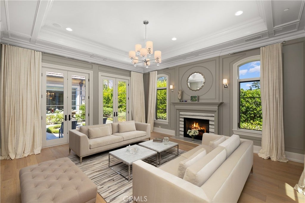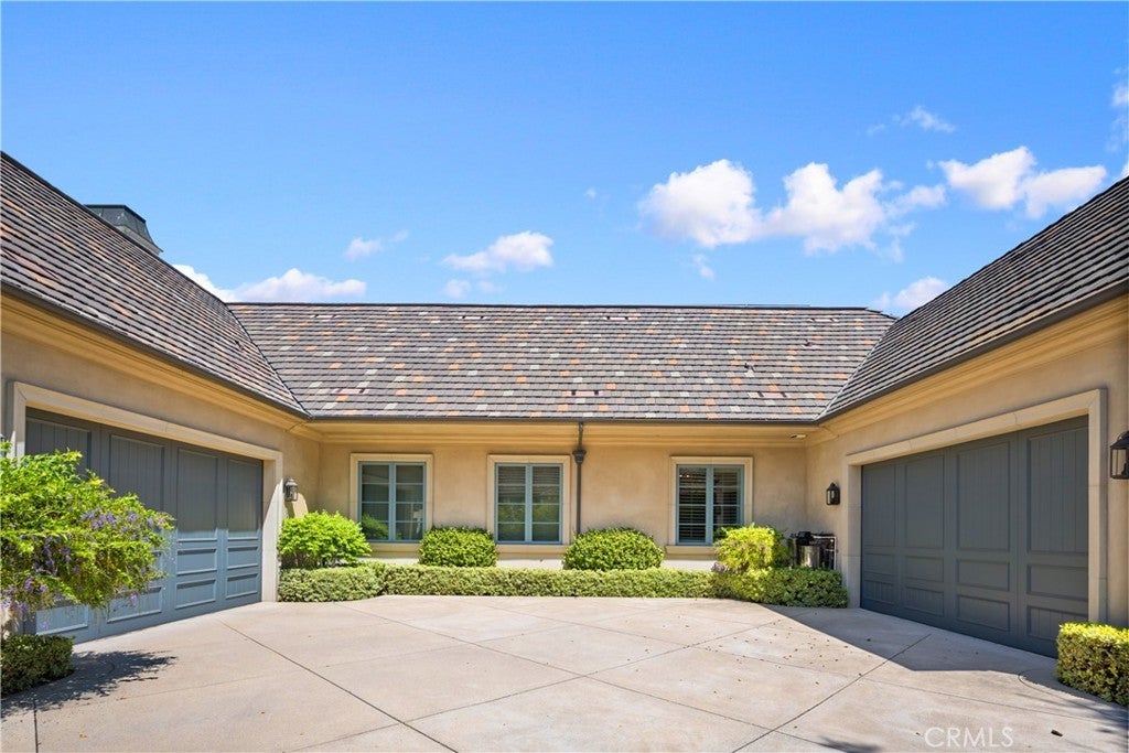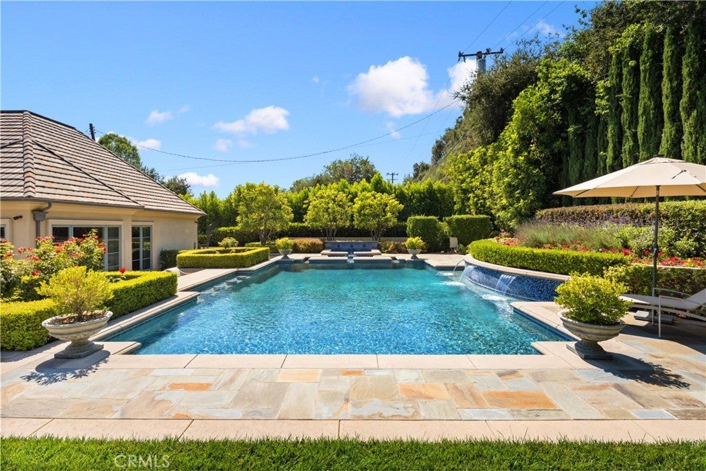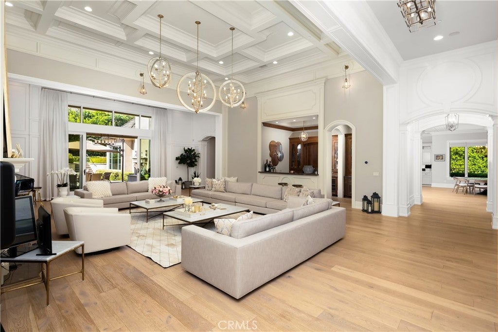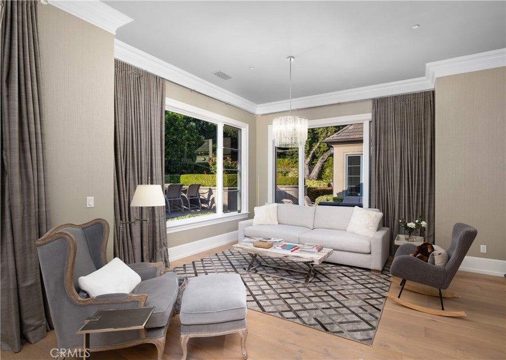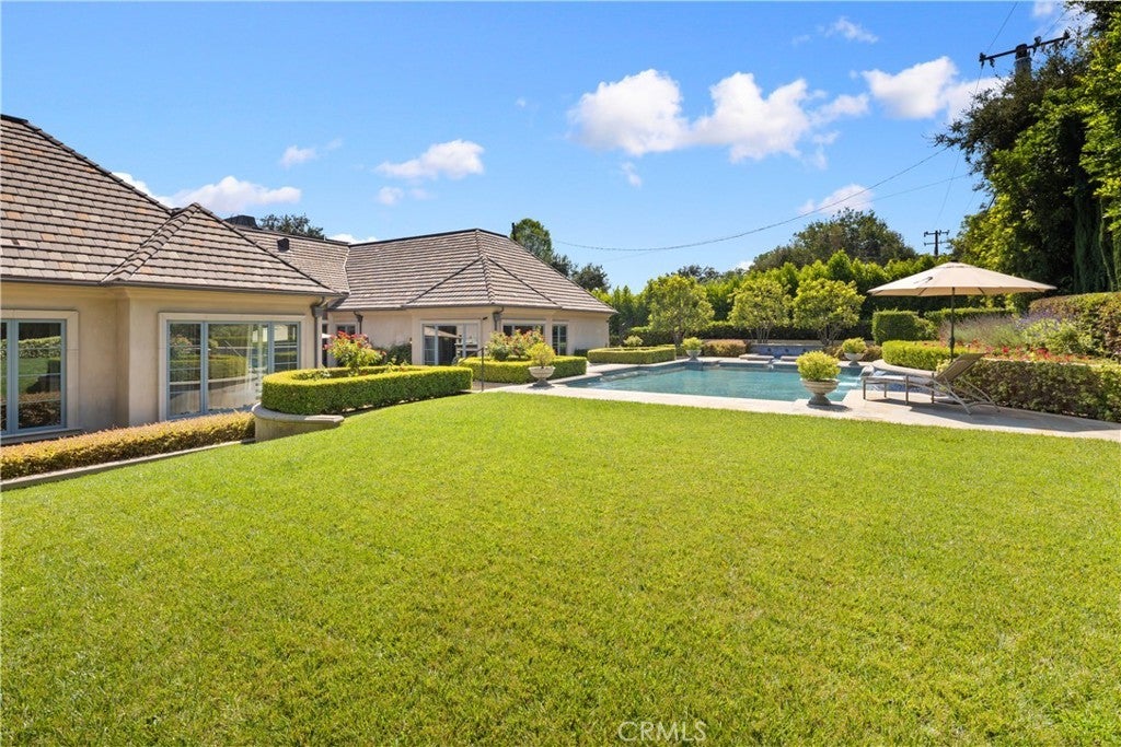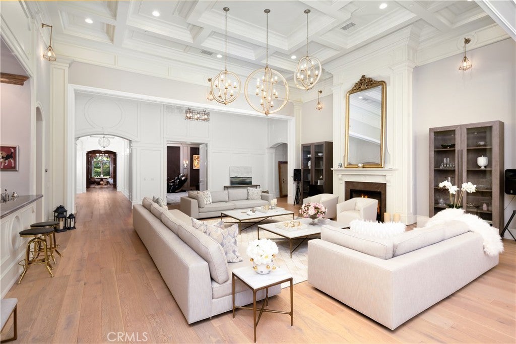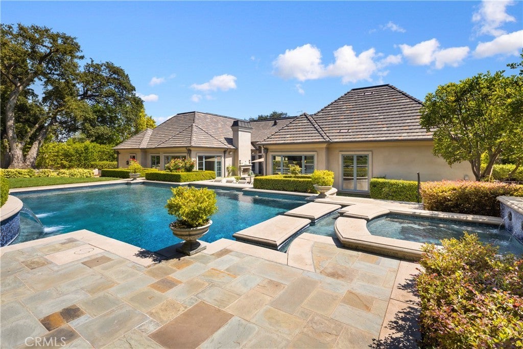 A Rare 10,422-Square-Foot French Estate in Prestigious Santa Anita Oaks, Set within Arcadia’s esteemed Upper Rancho Area of Arcadia, this extraordinary French-inspired estate presents over 10,000 square feet of rare single-level living on nearly an acre of beautifully landscaped grounds. Designed by the reputable Robert Tong and built by Mur-Sol Construction, this residence embodies timeless elegance, modern luxury, and superior craftsmanship. Behind its stately façade behind multiple large hedges and gated circular driveway, interiors unfold with grand proportions, soaring ceilings, and exquisite detailing throughout. The magnificent family room, crowned by a Cathedral High coffered ceiling and illuminated by a Gold Czech crystal chandelier, serves as the dramatic centerpiece of the home. Formal living and dining rooms offer refined settings for entertaining, while a richly appointed paneled study, an expansive home theater, and a private fitness room with sauna provide a wealth of lifestyle amenities. Throughout the home, custom designer draperies add sophistication and warmth to every space. At the heart of the estate, the gourmet kitchen impresses with dual marble-topped islands, professional-grade appliances, and bespoke cabinetry, paired with a fully equipped secondary wok kitchen for seamless entertaining. Six ensuite bedrooms, including a serene and extremely large primary suite with a spa-inspired bath of imported marble and European finishes, provide privacy and comfort for family and guests. The estate’s outdoor setting is equally remarkable, designed as a private resort retreat. Mature oak trees and lush landscaping frame a vast grassy lawn, an entertainer’s saltwater pool and spa, and an elegant stone terrace with outdoor fireplace. A circular driveway and a four-car attached garage ensure both prestige and convenience, with parking capacity for more than ten additional cars on the grounds. Enhancing the property’s value and efficiency are paid-off solar panels, offering sustainable living without compromise. Distinguished not only by its scale but also by its rare single-story design, this residence offers a lifestyle of enduring elegance, comfort, and exclusivity—all just moments from Arcadia’s award-winning schools, parks, dining, and cultural destinations.