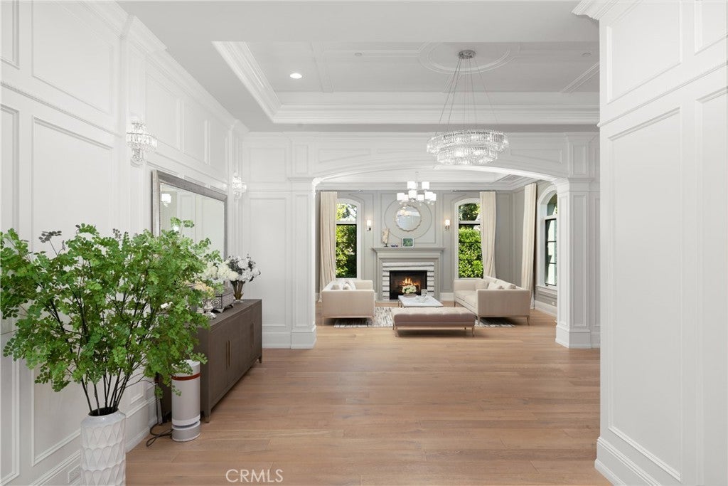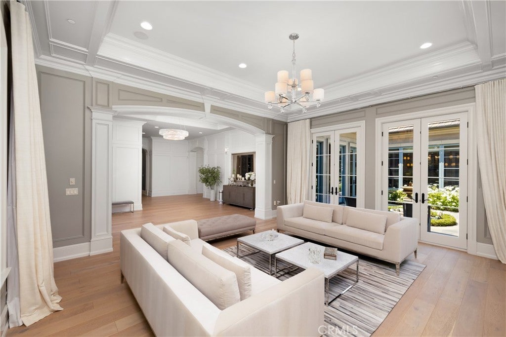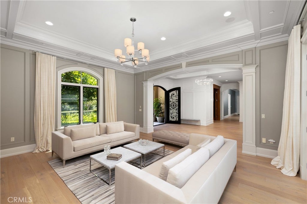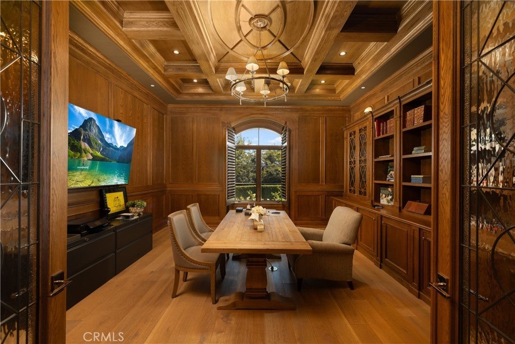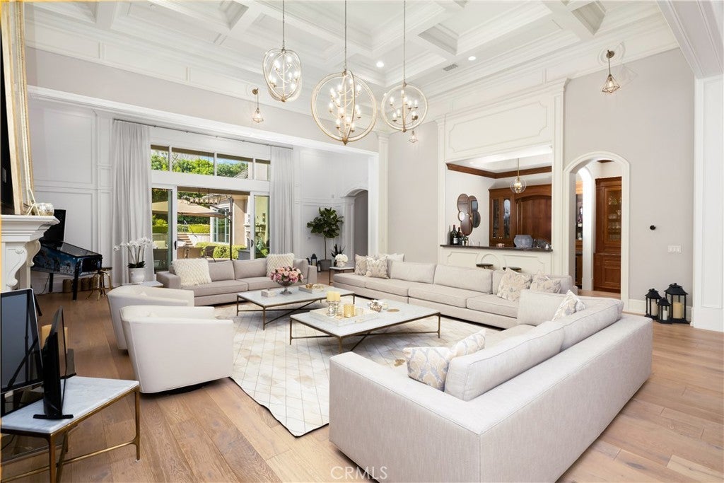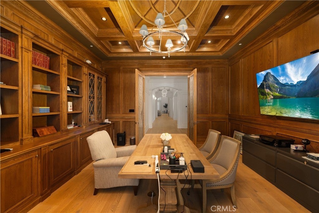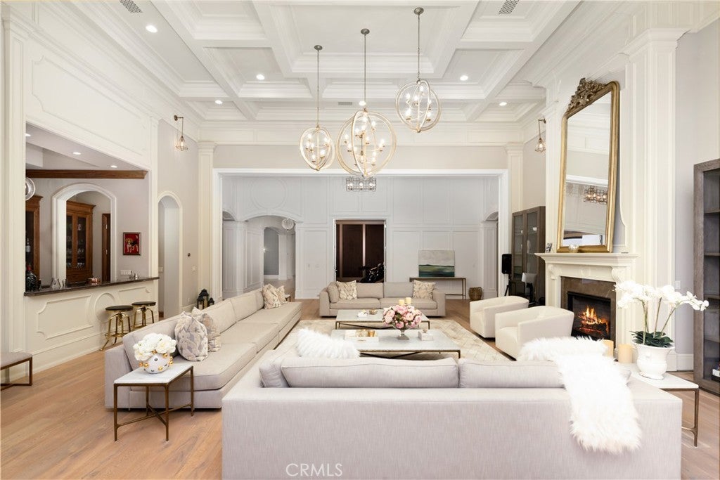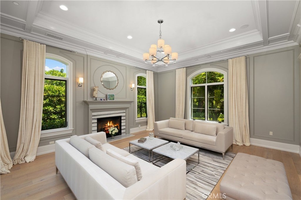 A Rare 10,422-Square-Foot French Estate in Prestigious Santa Anita Oaks, Set within Arcadia’s esteemed Upper Rancho Area of Arcadia, this extraordinary French-inspired estate presents over 10,000 square feet of rare single-level living on nearly an acre of beautifully landscaped grounds. Designed by the reputable Robert Tong and built by Mur-Sol Construction, this residence embodies timeless elegance, modern luxury, and superior craftsmanship. Behind its stately façade behind multiple large hedges and gated circular driveway, interiors unfold with grand proportions, soaring ceilings, and exquisite detailing throughout. The magnificent family room, crowned by a Cathedral High coffered ceiling and illuminated by a Gold Czech crystal chandelier, serves as the dramatic centerpiece of the home. Formal living and dining rooms offer refined settings for entertaining, while a richly appointed paneled study, an expansive home theater, and a private fitness room with sauna provide a wealth of lifestyle amenities. Throughout the home, custom designer draperies add sophistication and warmth to every space. At the heart of the estate, the gourmet kitchen impresses with dual marble-topped islands, professional-grade appliances, and bespoke cabinetry, paired with a fully equipped secondary wok kitchen for seamless entertaining. Six ensuite bedrooms, including a serene and extremely large primary suite with a spa-inspired bath of imported marble and European finishes, provide privacy and comfort for family and guests. The estate’s outdoor setting is equally remarkable, designed as a private resort retreat. Mature oak trees and lush landscaping frame a vast grassy lawn, an entertainer’s saltwater pool and spa, and an elegant stone terrace with outdoor fireplace. A circular driveway and a four-car attached garage ensure both prestige and convenience, with parking capacity for more than ten additional cars on the grounds. Enhancing the property’s value and efficiency are paid-off solar panels, offering sustainable living without compromise. Distinguished not only by its scale but also by its rare single-story design, this residence offers a lifestyle of enduring elegance, comfort, and exclusivity—all just moments from Arcadia’s award-winning schools, parks, dining, and cultural destinations.