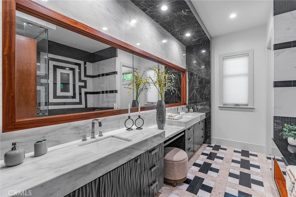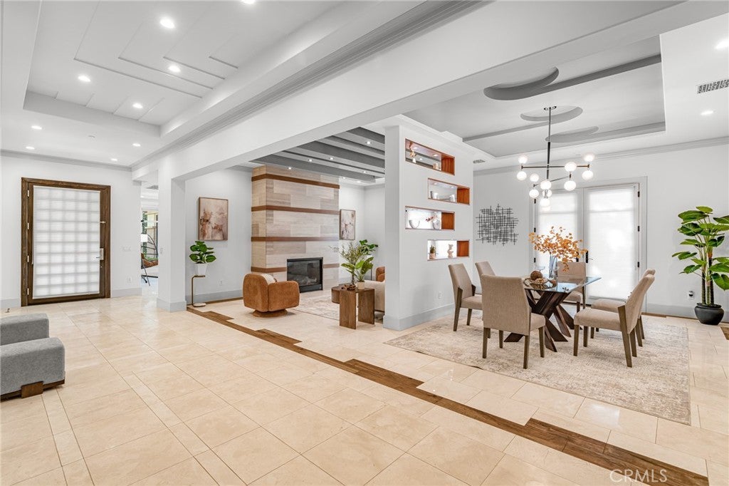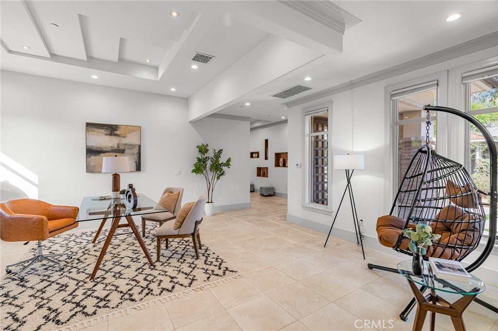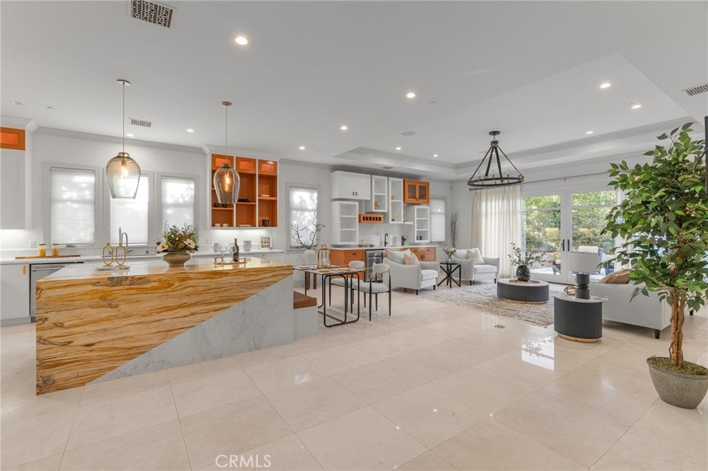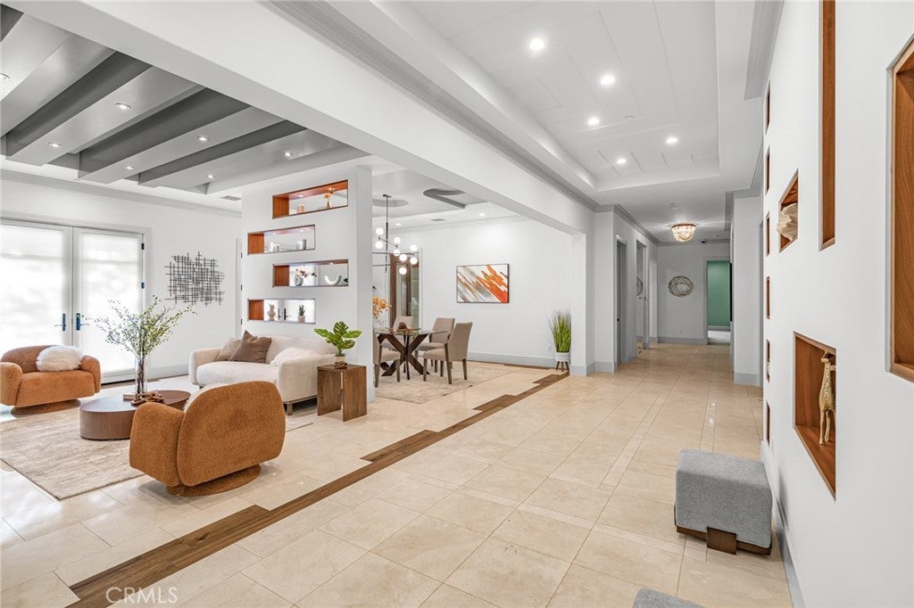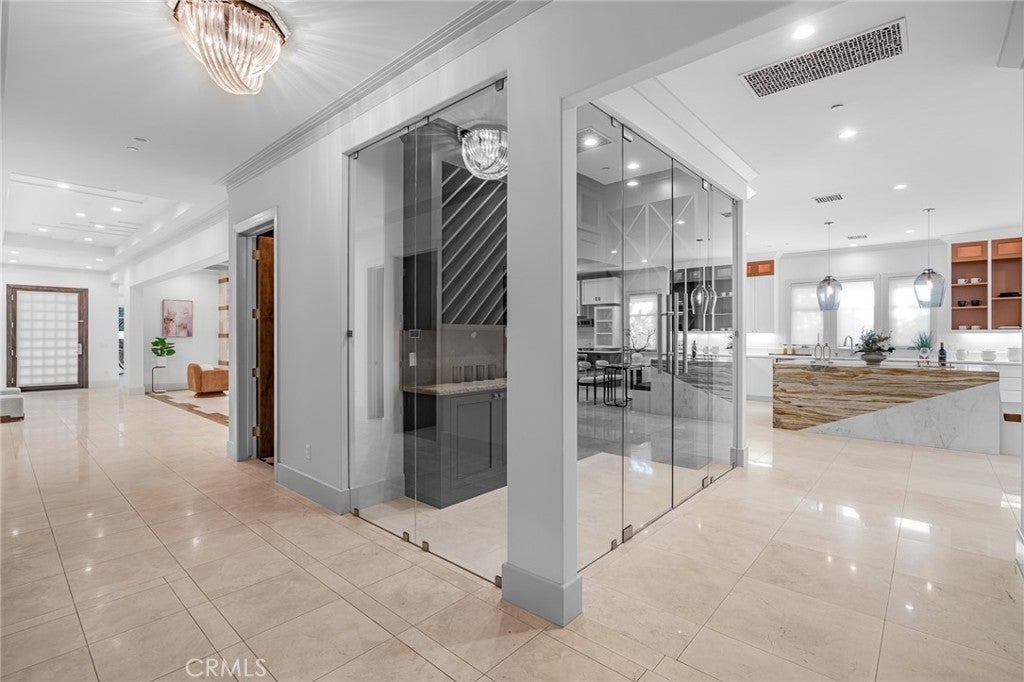 Located in the prestigious Santa Anita Village area of Arcadia, this hard-to-find single-story custom estate offers a perfect blend of timeless elegance and modern luxury. The grand foyer opens to a stunning great room with honed and polished marble floors, complemented by a separate library featuring exquisite custom cabinetry and millwork. The expansive gourmet kitchen boasts a marble waterfall island with an attached breakfast nook bench, walk-in pantry, and a separate sous-chef kitchen. A spacious family room with a wet bar flows seamlessly to the beautifully landscaped yard, while an enclosed, glassed wine cellar and custom home theatre with wood and silk paneling provide unparalleled opportunities for entertainment. Additional highlights include a limestone and walnut fireplace in the living room with retro ceiling details, three guest bedrooms each with en-suite bathrooms, and a luxurious master suite with a spa-style bath featuring marble surfaces, an air-jetted tub, steam shower, and large walk-in closet. This home is equipped with a built-in security system, central vacuum system, and water softener, along with high-end appliances, designer lighting, and artisan cabinetry. The tranquil backyard patio is perfect for relaxing or gathering with family and friends. Conveniently located near parks, dining, shopping, the public library, and award-winning Arcadia schools.