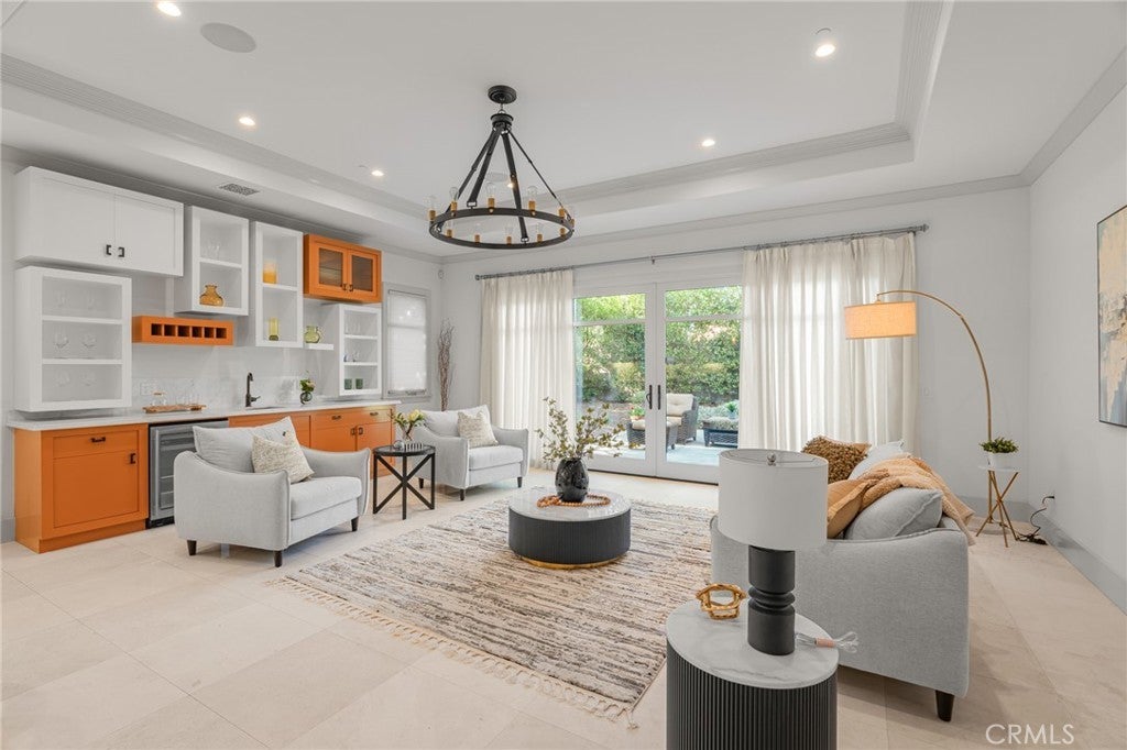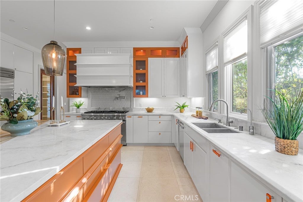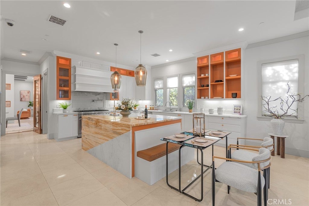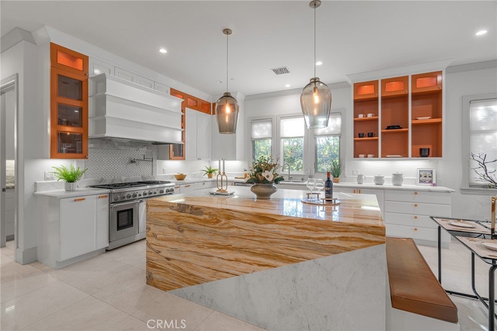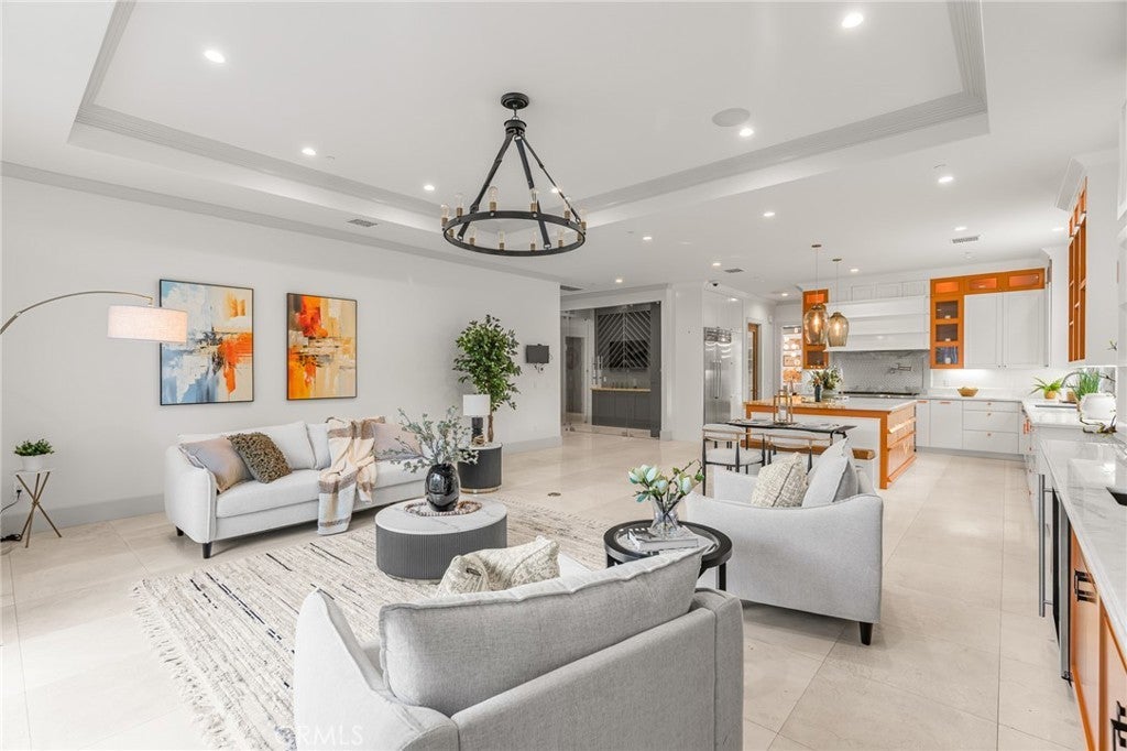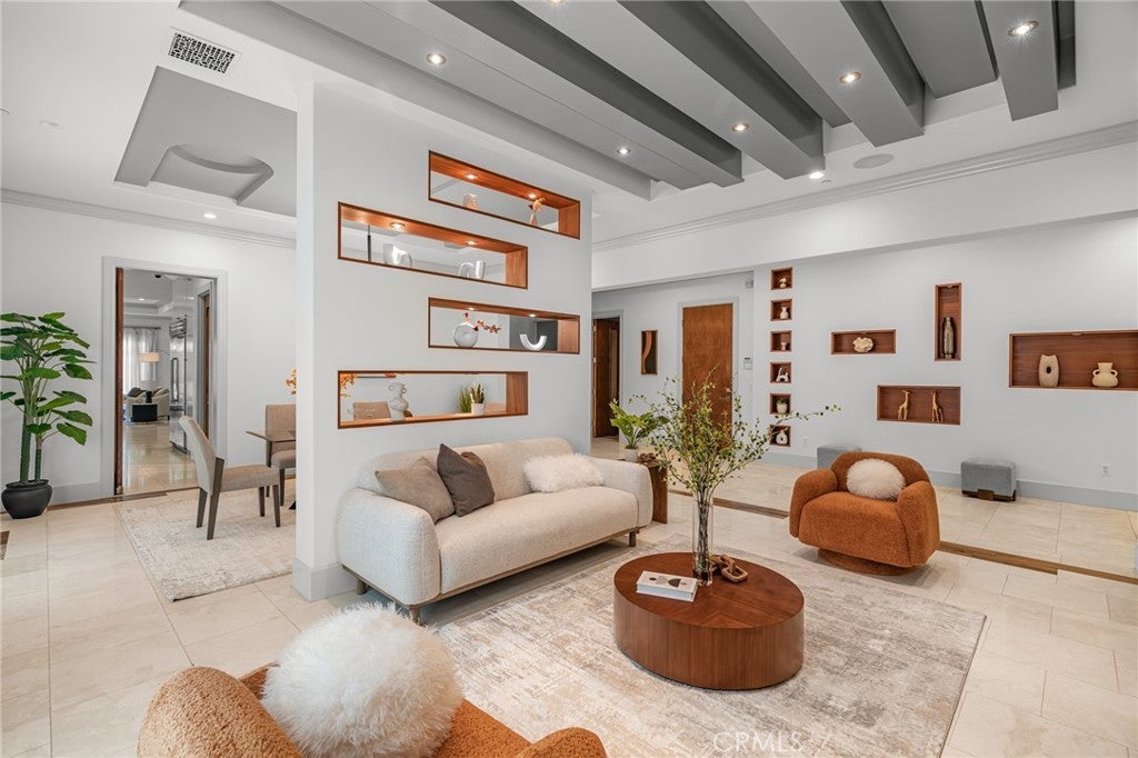 Located in the prestigious Santa Anita Village area of Arcadia, this hard-to-find single-story custom estate offers a perfect blend of timeless elegance and modern luxury. The grand foyer opens to a stunning great room with honed and polished marble floors, complemented by a separate library featuring exquisite custom cabinetry and millwork. The expansive gourmet kitchen boasts a marble waterfall island with an attached breakfast nook bench, walk-in pantry, and a separate sous-chef kitchen. A spacious family room with a wet bar flows seamlessly to the beautifully landscaped yard, while an enclosed, glassed wine cellar and custom home theatre with wood and silk paneling provide unparalleled opportunities for entertainment. Additional highlights include a limestone and walnut fireplace in the living room with retro ceiling details, three guest bedrooms each with en-suite bathrooms, and a luxurious master suite with a spa-style bath featuring marble surfaces, an air-jetted tub, steam shower, and large walk-in closet. This home is equipped with a built-in security system, central vacuum system, and water softener, along with high-end appliances, designer lighting, and artisan cabinetry. The tranquil backyard patio is perfect for relaxing or gathering with family and friends. Conveniently located near parks, dining, shopping, the public library, and award-winning Arcadia schools.