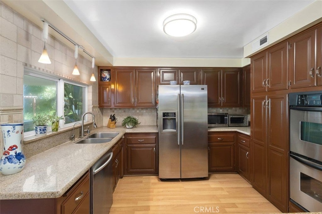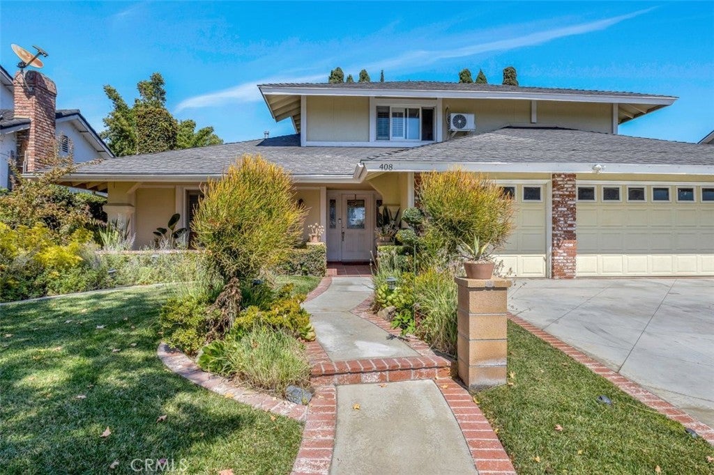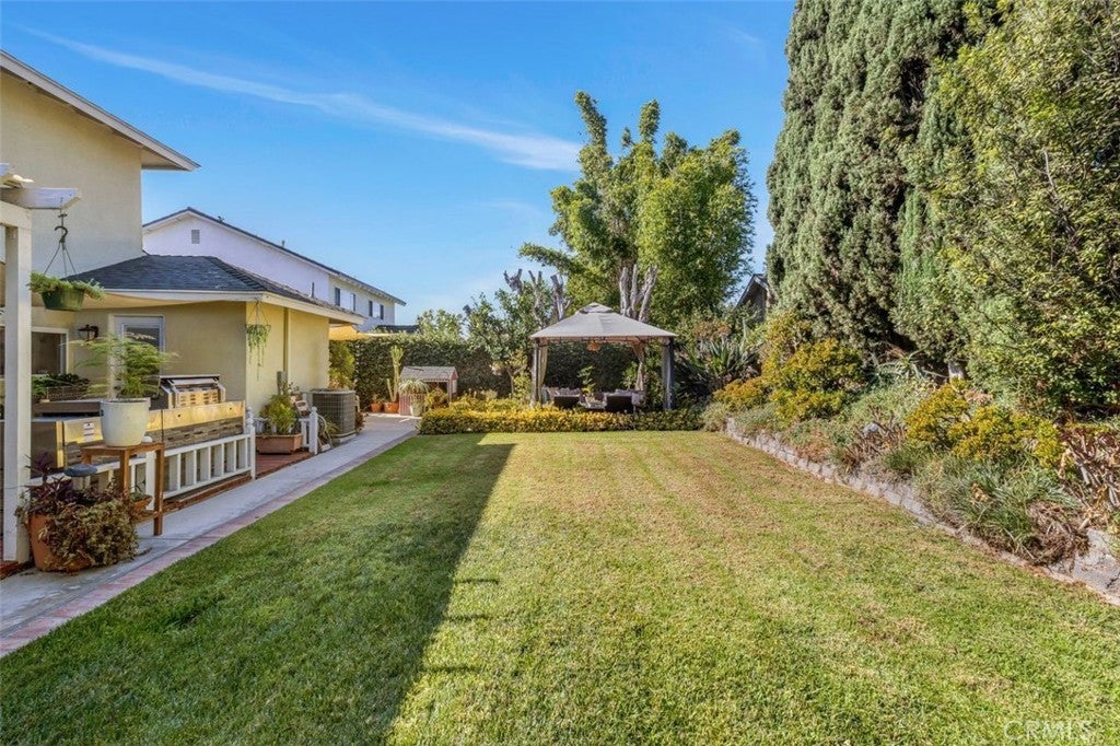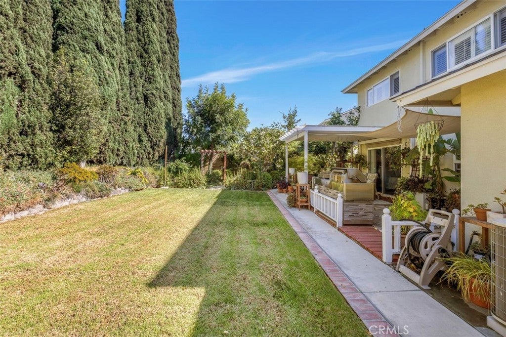 Welcome to this stunning two-story Mid-Century Ranch-style residence, ideally situated in a highly sought-after neighborhood within a top-rated school district. With inviting curb appeal, a spacious three-car garage, and a thoughtfully designed layout, this 5-bedroom, 3.5-bath home offers the perfect balance of comfort and sophistication. Step inside to a welcoming foyer that opens to a bright and airy living room, complete with a beautiful fireplace, custom built-in display cabinetry, and a large picture window that floods the space with natural light. The main level features a primary suite with direct backyard access through expansive sliding glass doors, while upstairs includes an additional en-suite bedroom along with generously sized rooms ideal for family, guests, or a home office. The bathrooms have been tastefully updated with dual sinks, modern tile shower stalls, and a relaxing whirlpool bathtub. A separate laundry room adds convenience and functionality. The gourmet kitchen showcases granite counters, stainless steel appliances, and ample cabinetry, seamlessly flowing into the dining area with sliding glass doors that open to the backyard. Step outside to private retreat where a beautifully landscaped backyard provides tranquility and space for gatherings. Mature fruit trees, lush plantings, and vibrant gardens surround multiple outdoor living areas, including a built-in BBQ, shaded patio, and cabana-style seating - perfect for entertaining or unwinding in total privacy. This exceptional property blends timeless Mid-Century charm with modern upgrades, offering an inviting retreat both inside and out - waiting for you to call it home.