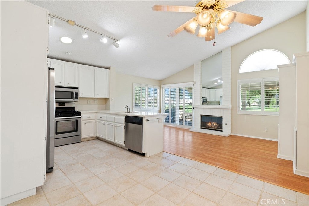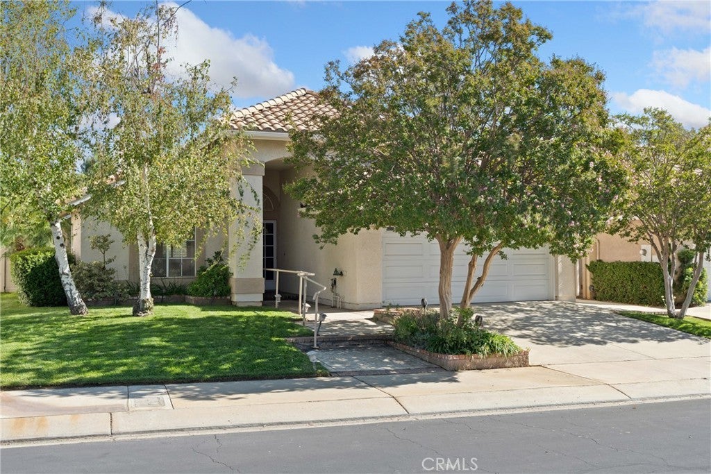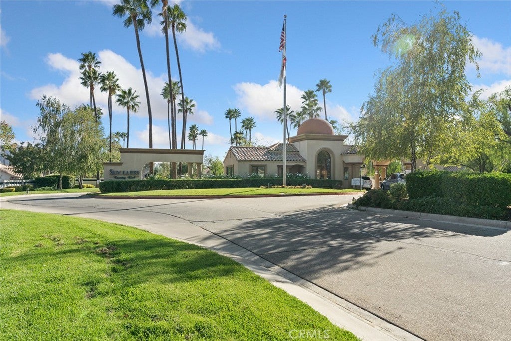 Situated on the first hole of the stunning Sun Lakes golf course, this Riviera model home offers beautiful views and a thoughtfully designed layout. The residence features wood laminate flooring throughout the living areas and bedrooms, complemented by ceramic tile in the entry, kitchen, hallways, and baths. Plantation shutters in the family room and primary suite add a touch of elegance. The kitchen is finished with Corian countertops, while the remodeled primary bath boasts dual sinks, Corian counters, and a custom-tiled shower. A versatile sitting area off the primary suite can be used as an office, reading nook, or easily converted into a third bedroom. The primary also includes a walk-in closet and sliding doors that open to the back patio overlooking the captivating golf course view. Outdoor living is enhanced with an Alumawood patio cover and tiled patio flooring, creating a perfect space to relax or entertain. The garage provides ample storage with built-in cabinets and an epoxy floor finish. Located in the highly desirable Sun Lakes Country Club, a 55+ guard-gated community, residents enjoy two golf courses, three clubhouses, multiple pools and spas (including an indoor pool), fitness centers, tennis and pickleball courts, dining, and a vibrant calendar of activities. Internet and cable are included in the HOA, and there is no Mello-Roos tax. Conveniently close to freeways and some of the best shopping in Southern California.