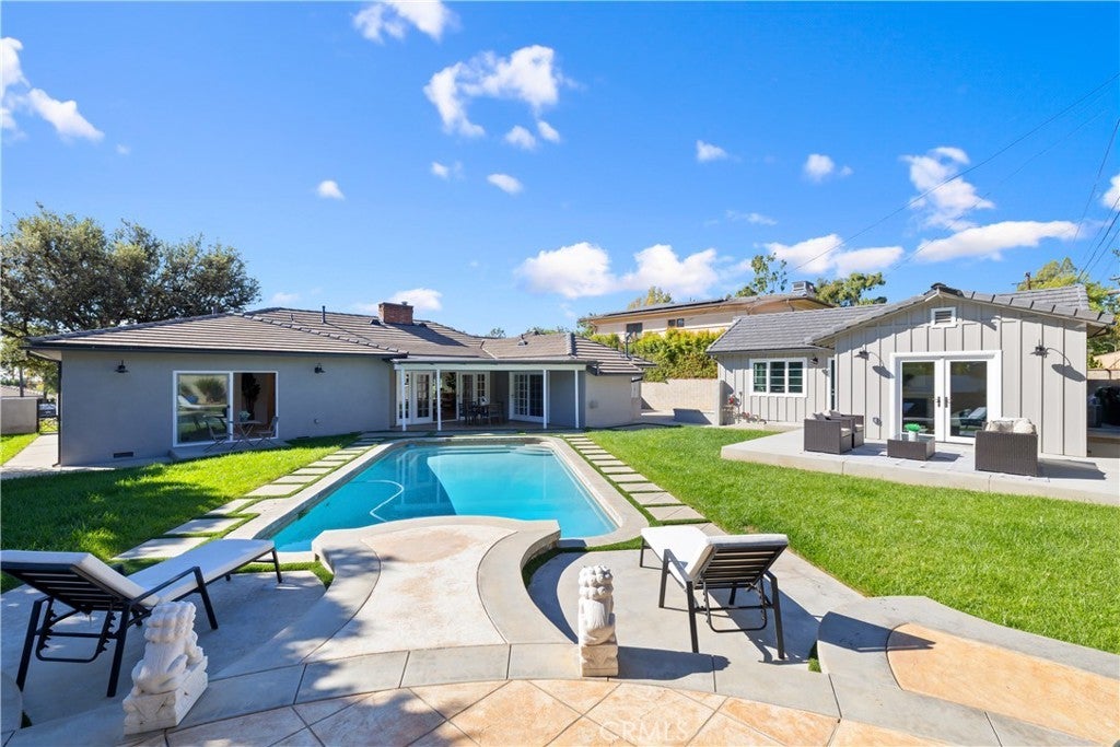 Showcased is a tastefully renovated gem located in Arcadia’s coveted Colorado Oaks neighborhood, known as the charming College Streets. This magnificent one story south facing home (2,519 Sq Ft) with spacious back house/ADU (694 Sq Ft), Cabana (215 Sq Ft) and pool is an entertainer delight! Situated on a large lot 13,806 Sq. Ft with a wonderful curb appeal, the main home offers 4 bedrooms including two master suites and 3 full baths all updated with designer-selected colors and curated style choices. This spacious and stunning home was completely remodeled in 2025 with utmost materials, including custom millwork, engineered hardwood flooring, custom cabinetry and high-end appliances. It offers a comfortable and open floor plan with the bedrooms wing separated from the living area. Every detail has been thoughtfully crafted to reflect designer sophistication and comfort. The expansive open kitchen is a true centerpiece, showcasing stainless steel appliances, and generous prep space—perfect for both everyday living and elegant entertaining. Sunlight pours in through brand-new Milgard windows, while the home features new insulation, new plumbing and electrical throughout, a new electrical box, a new water heater, and a new central HVAC system for year-round comfort and efficiency. One of the greatest features of this property is the detached 694 Sq Ft back house/ADU built in 2025 that sits just off the pool/driveway area of the main house. It features 1 bedroom, 2 baths, spacious kitchen with stainless steel appliances and a laundry area. The professionally landscaped backyard with multiple patios offers wonderful area for outdoor enjoyment. Both homes feature new upgrades and thoughtful details. Located within the highly regarded Arcadia Unified School District and minutes from Santa Anita park, the racetrack, the arboretum, golf courses, shopping, and transportation, this home combines character and elegance.