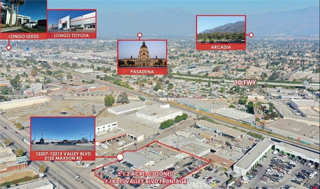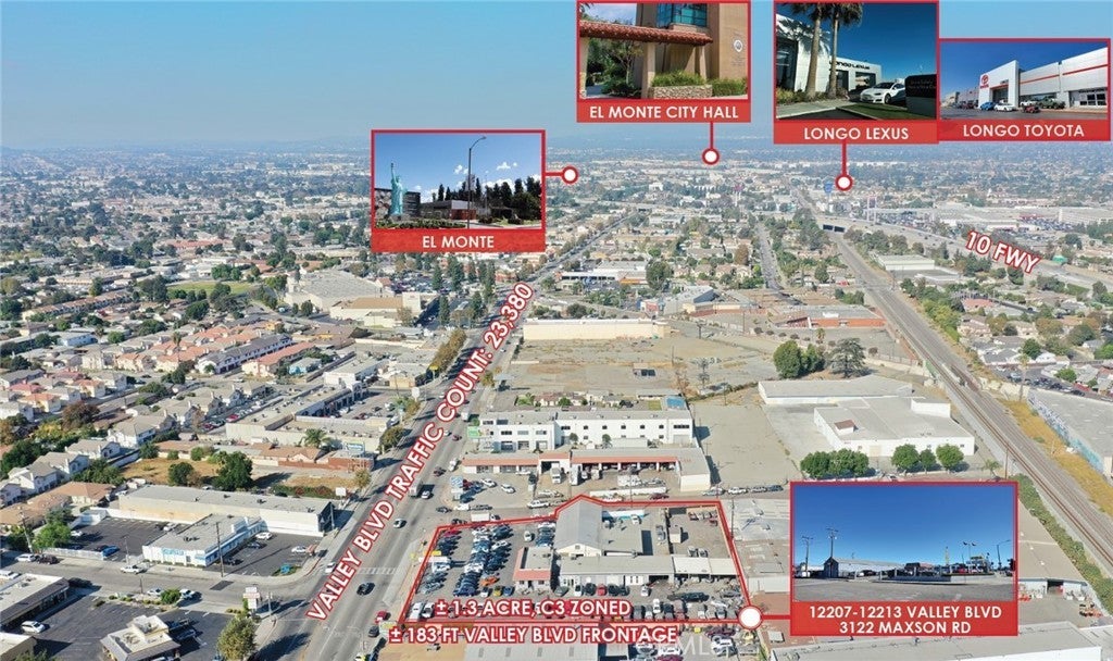 12207-12213 Valley Blvd and 3122 Maxson Rd, a single tenant automotive dealership located along the well-known Valley Blvd in El Monte, CA. This is the first time these properties ever offered for sale since the owner bought the first one in 1979 (±45 years). This property offers a unique opportunity for savvy developers providing a clean slate redevelopment project. Situated on a large ±1.3-acre (±56,898 SF) corner lot, the site boasts approximately ±183 feet of prime street frontage along the highly sought-after Valley Blvd. This area is renowned for its rapid redevelopment, with many significant projects either completed or in progress. Recent residential condominiums’ sales comparable show attractive sold condo prices ranging from $645,000 to $742,000 per condo (MLS sales comps from May 2024 - buyer to verify). The property is zoned C3 (Commercial Mixed-Use, buyer to verify), offering a variety of potential uses, including residential (R4) and commercial (refer to Development Guidelines for details). The site benefits from a daily traffic count of approximately ±23,380 vehicles on Valley Blvd and ±214,000 VPD on 10FWY, providing superb exposure. Valley Blvd serves as the primary retail corridor for several cities in the San Gabriel Valley, including Alhambra, San Gabriel, Rosemead, and El Monte. The flow of both foreign capital and local investments has fueled rapid growth and development in the region over the past decade. Currently, the property houses a single-story car dealership and auto-body shop totaling ±9,389 SF, divided into several units. The anchor tenant, Lucy’s Auto Dealership, occupies about 85% of the space (±8,000 SF), with the remaining area leased to an auto-body shop. The property includes expansive parking, adding further value to the investment. The C3 zoning allows for a wide range of redevelopment options. Potential uses include mixed-use residential, retail and office spaces, community care facilities, assembly & entertainment venues, and more. A buyer may also consider subdividing the lot for residential development on one parcel while maintaining commercial use on another, or even redeveloping the site into a hotel. Buyers should conduct their own investigations with the city of El Monte to explore specific opportunities. The property is strategically located along Valley Blvd, a major retail corridor in the west San Gabriel Valley, which is particularly popular among affluent Asian investors from China, Taiwan.