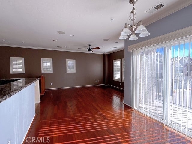 Stunning 2 Bedroom 2 Bathroom End Unit Condo with attached 2 Car Garage and Double Balconies! An open spacious layout with a designers touch that boasts hand laid real wood floors, upgraded crown molding, and beautiful shutters. The living room is open to the kitchen and dining room. The kitchen is perfect for entertaining featuring exquisite granite counter tops, beautiful upgraded stainless steal appliances, plenty of counter space with a bar height sitting area and pantry. The dining room has a sliding door leading to the balcony. The master bedroom is large with direct access to a private balcony, a walk-in closet, and 2nd bedroom has mirror closet doors and shutters. The condo has just been replaced with a new water heater and new range hood. Great community amenities include a huge pool/spa area, playgrounds and barbecue areas. This end unit condo is located in a desirable area within the community close to the entrance, mailboxes, and pool.