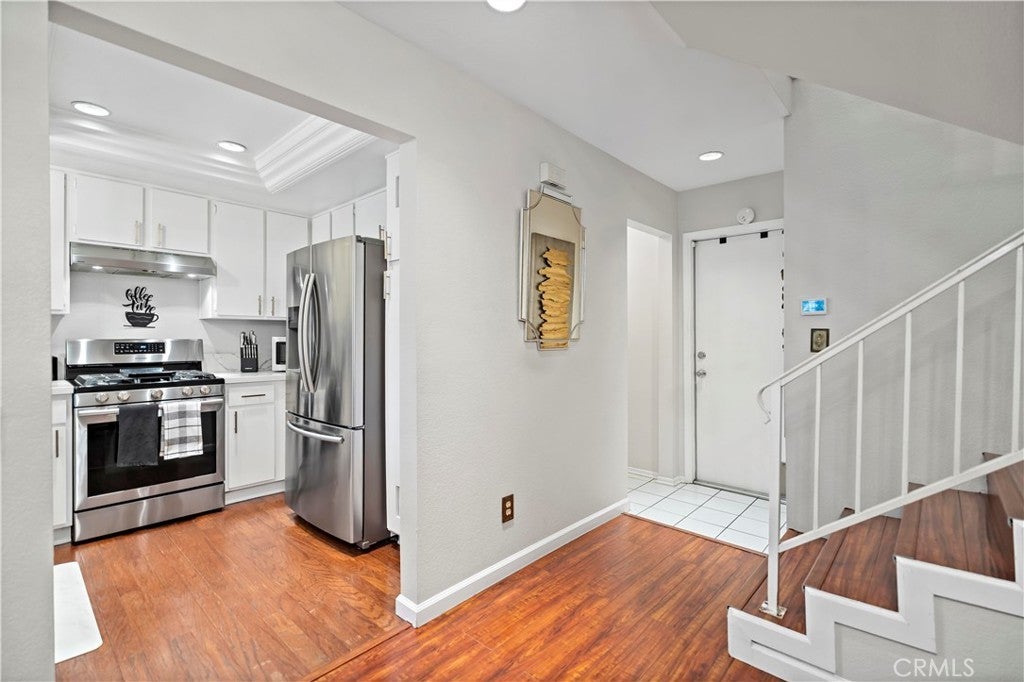 Charming, updated 3-bedroom, 2.5-bath condo located in the well-maintained Orchard Meadows community, ideally positioned facing the greenbelt for a quiet and private setting. This home features plantation shutters throughout and a bright, inviting kitchen complete with quartz countertops, stainless steel appliances, and a wine fridge. A convenient half bath is located just off the kitchen, along with hallway storage cabinets. Upstairs, the spacious primary bedroom and two well-sized secondary bedrooms share a full bathroom. The primary bedroom boasts vaulted ceilings, a walk-in closet, and a private balcony—perfect for morning coffee or relaxing evenings. Enjoy a private patio ideal for entertaining, plus an attached two-car garage with washer and dryer hookups. The community offers two swimming pools and two spas, and the HOA covers water and trash. Move-in ready—don’t miss this great opportunity!