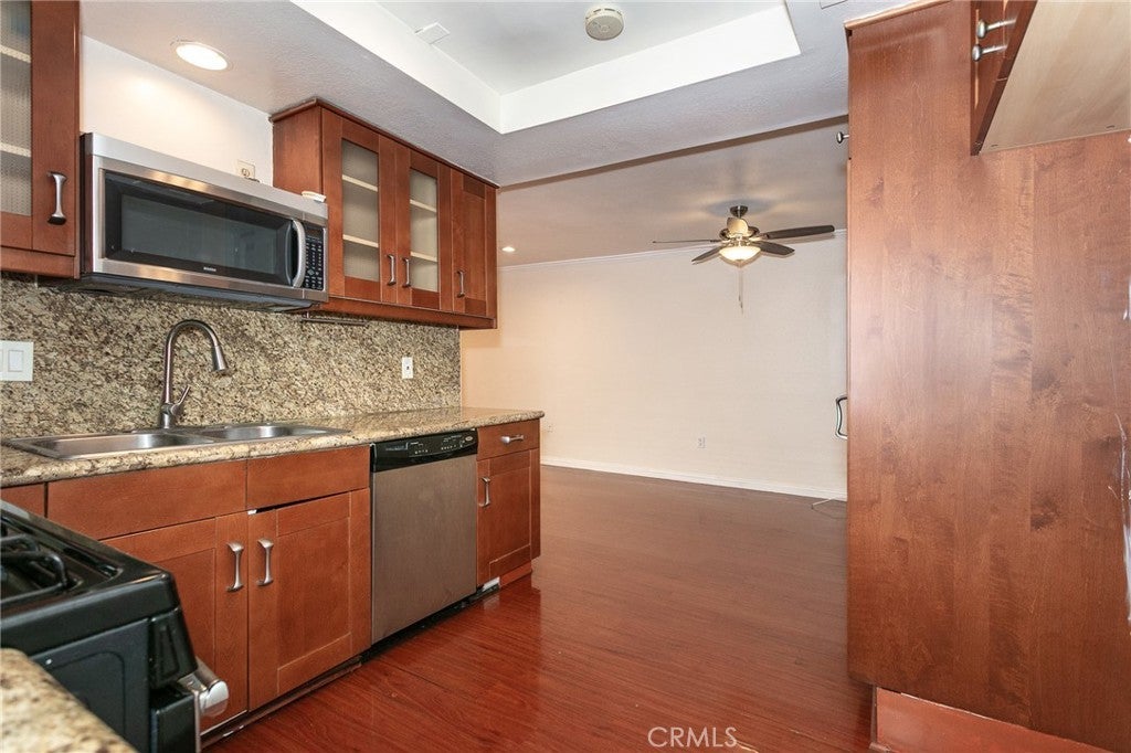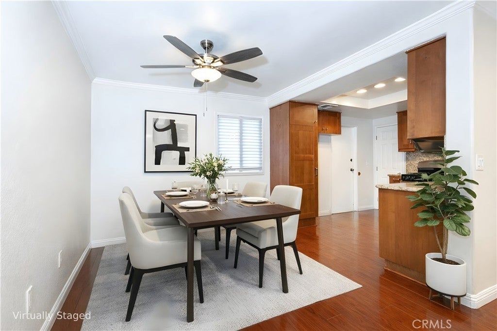 This condo is located within the gated Vista Montanas community in the North of Huntington neighborhood of Duarte. Near schools, local parks, shopping centers, banks, Target, Walmart, Home Depot, restaurants, the Metro station, and surrounding services. The nearby foothills provide hiking trails and outdoor recreation, along with easy access to the 210 and 605 freeways. The inviting living room features wood flooring and a cozy fireplace, creating a warm and welcoming atmosphere for everyday living. Flowing seamlessly into the adjacent dining area with a ceiling fan, ideal for gatherings. A sliding door leads to an enclosed patio, offering a private space for relaxation. The updated kitchen features granite countertops, stainless steel appliances, a walk-in pantry, ample cabinetry, creating a functional and efficient cooking workspace. A powder room is also conveniently located on the main level. Upstairs offers a spacious primary suite serving as a comfortable private retreat, complete with a walk-in closet and an en-suite bathroom featuring a granite vanity and a separate framed glass shower. The second and third bedrooms include mirrored sliding closet doors. Additional highlights include recessed lighting, ceiling fans, central A/C and heating, crown molding, and laminate wood flooring throughout. This well-maintained home combines comfort, practicality, and a desirable location, making it an excellent opportunity for first-time buyers and investors alike.