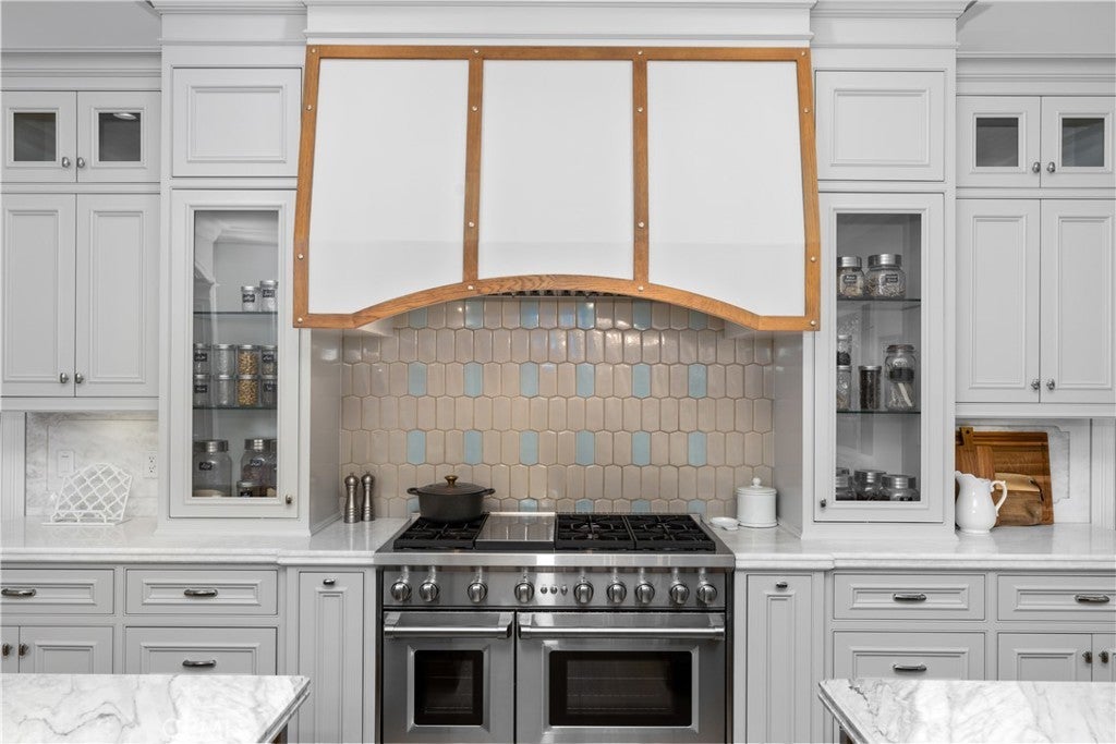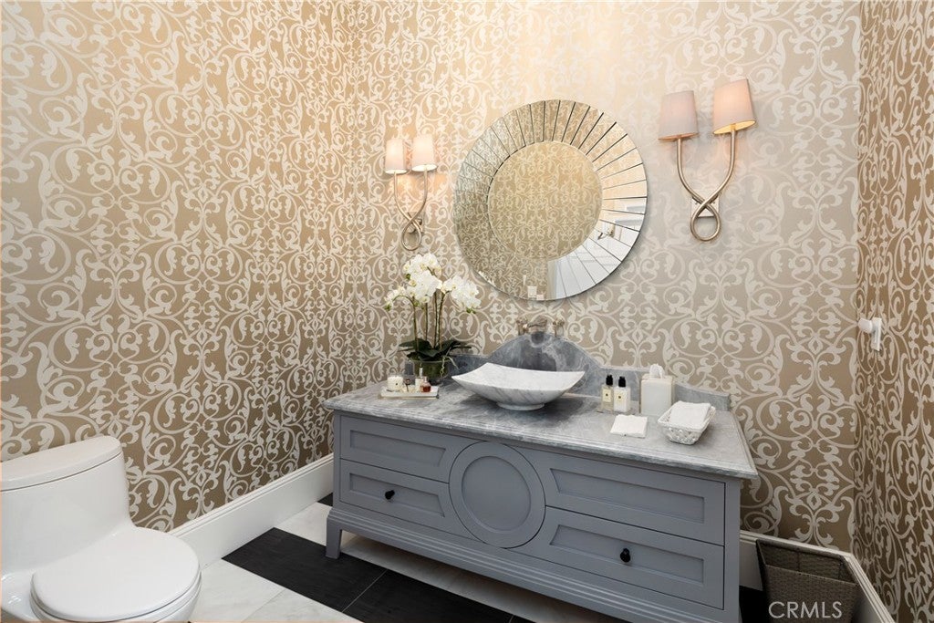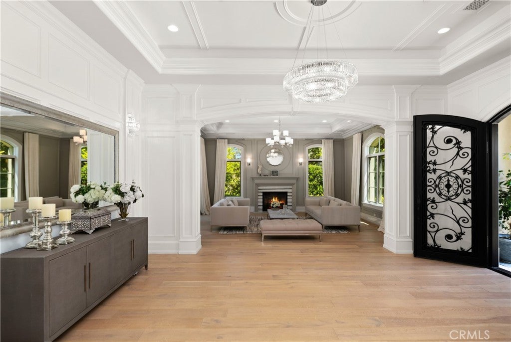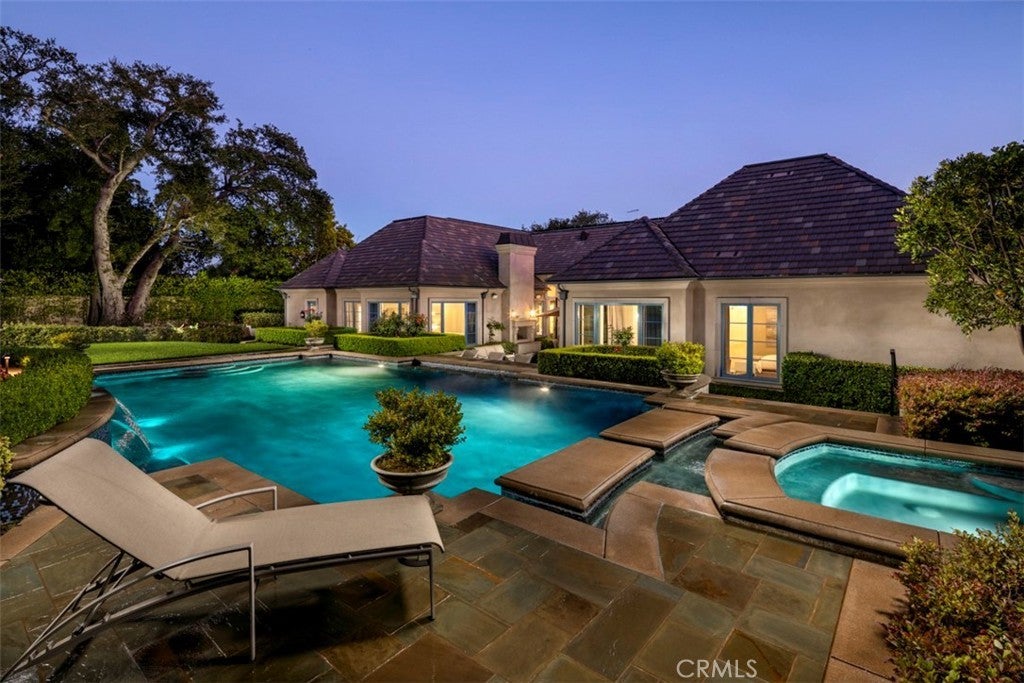 A Rare 10,422-Square-Foot French Estate in Prestigious Santa Anita Oaks, Set within Arcadia’s esteemed Upper Rancho Area of Arcadia, this extraordinary French-inspired estate presents over 10,000 square feet of rare single-level living on nearly an acre of beautifully landscaped grounds. Designed by the reputable Robert Tong and built by Mur-Sol Construction, this residence embodies timeless elegance, modern luxury, and superior craftsmanship. Behind its stately façade behind multiple large hedges and gated circular driveway, interiors unfold with grand proportions, soaring ceilings, and exquisite detailing throughout. The magnificent family room, crowned by a Cathedral High coffered ceiling and illuminated by a Gold Czech crystal chandelier, serves as the dramatic centerpiece of the home. Formal living and dining rooms offer refined settings for entertaining, while a richly appointed paneled study, an expansive home theater, and a private fitness room with sauna provide a wealth of lifestyle amenities. Throughout the home, custom designer draperies add sophistication and warmth to every space. At the heart of the estate, the gourmet kitchen impresses with dual marble-topped islands, professional-grade appliances, and bespoke cabinetry, paired with a fully equipped secondary wok kitchen for seamless entertaining. Six ensuite bedrooms, including a serene and extremely large primary suite with a spa-inspired bath of imported marble and European finishes, provide privacy and comfort for family and guests. The estate’s outdoor setting is equally remarkable, designed as a private resort retreat. Mature oak trees and lush landscaping frame a vast grassy lawn, an entertainer’s saltwater pool and spa, and an elegant stone terrace with outdoor fireplace. A circular driveway and a four-car attached garage ensure both prestige and convenience, with parking capacity for more than ten additional cars on the grounds. Enhancing the property’s value and efficiency are paid-off solar panels, offering sustainable living without compromise. Distinguished not only by its scale but also by its rare single-story design, this residence offers a lifestyle of enduring elegance, comfort, and exclusivity—all just moments from Arcadia’s award-winning schools, parks, dining, and cultural destinations.
