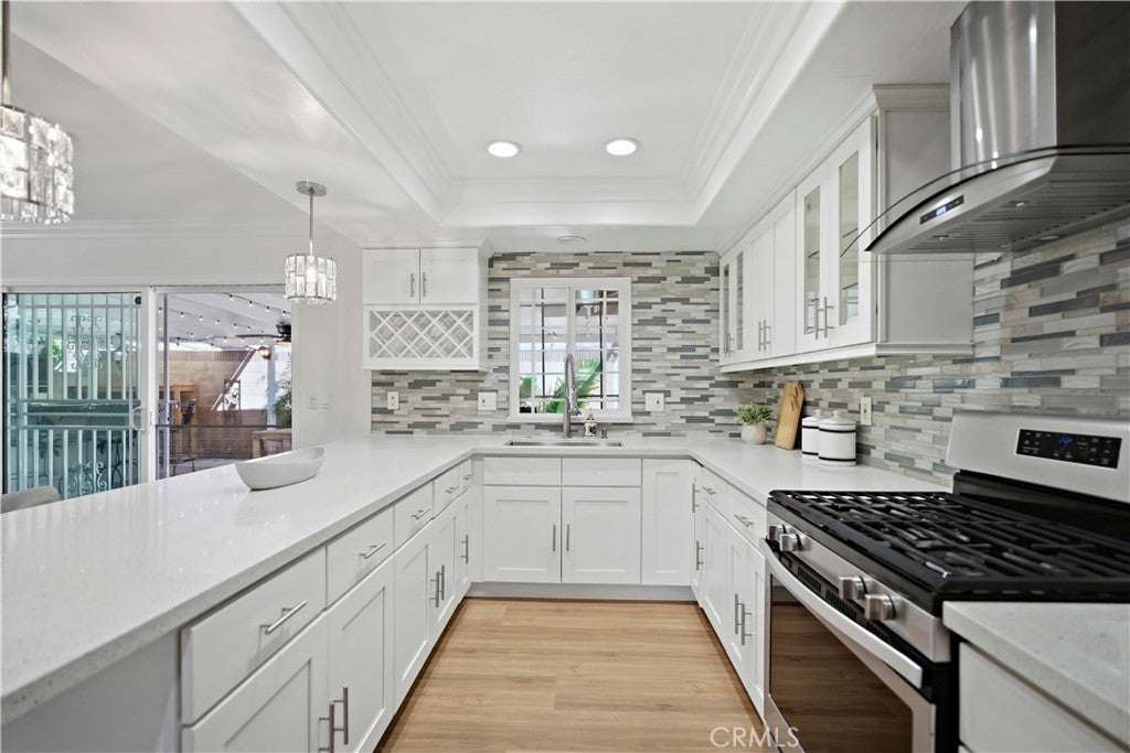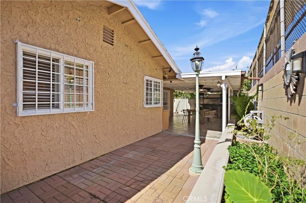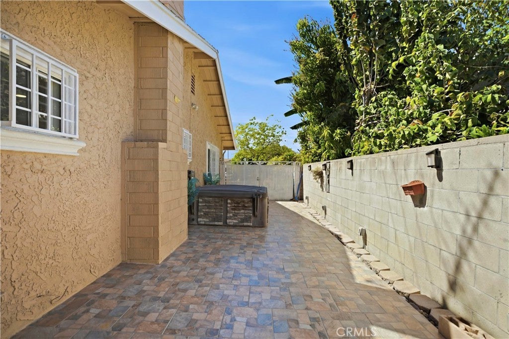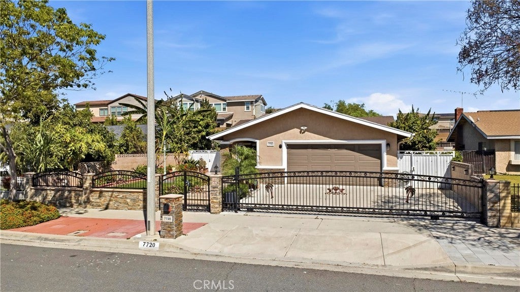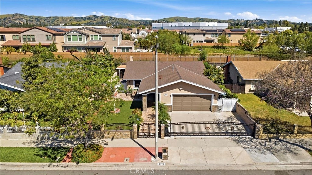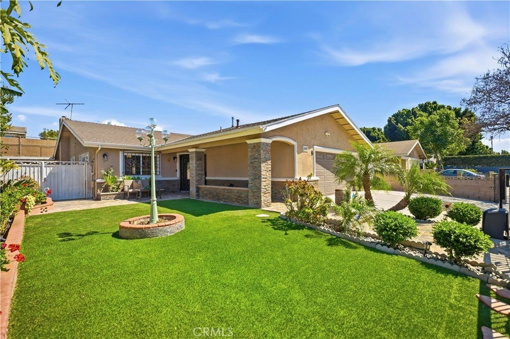 Beautifully maintained single-story home with great curb appeal, located on a quiet cul-de-sac close to shopping and dining. The property features an automatic front gate, a front yard finished with artificial turf, and a tile entry for attractive, low-maintenance landscaping. The interior has been freshly painted and features luxury vinyl plank flooring throughout. An open and inviting family room flows into the kitchen, which offers quartz countertops, a center island, and ample space for everyday living. The home includes a spacious layout with a primary bedroom and updated bathroom, along with two additional well-sized bedrooms. The custom covered patio, finished with tile flooring, features two refrigerators, a sink, and a gas BBQ/bar with built-in cabinets, making it ideal for entertaining. The backyard offers a hot tub and a variety of fruit trees along the side yard.. The garage includes additional built-in cabinets for extra storage. Move-in ready with comfortable indoor-outdoor living.