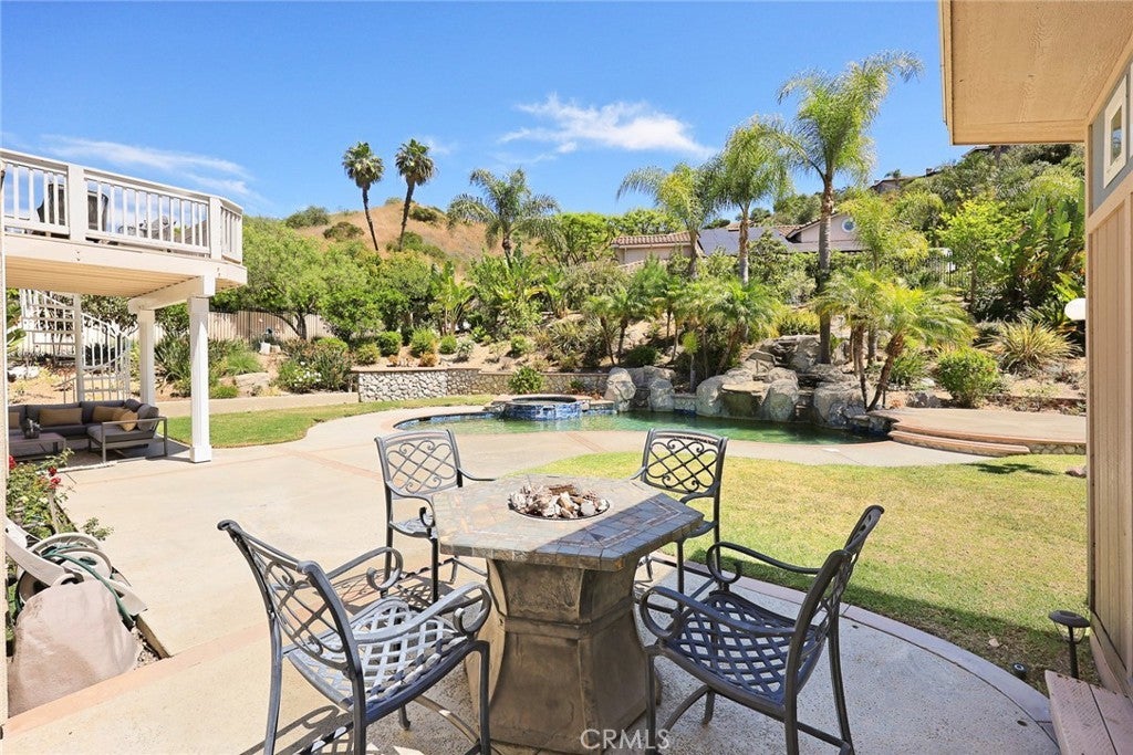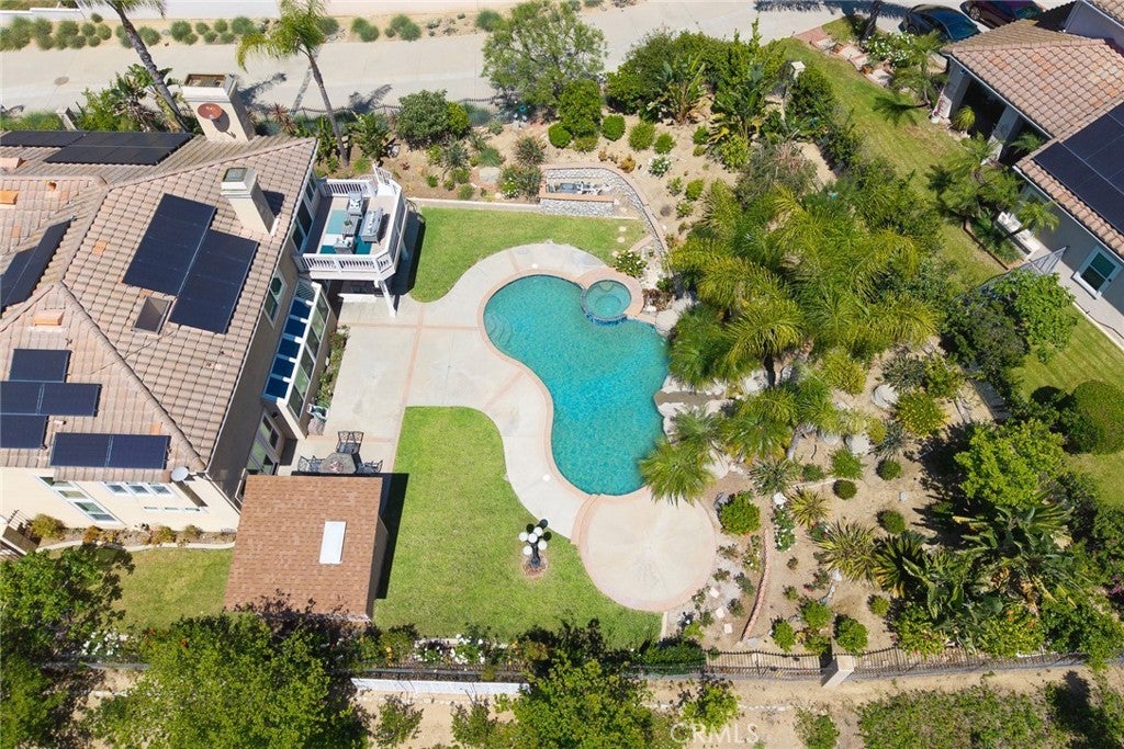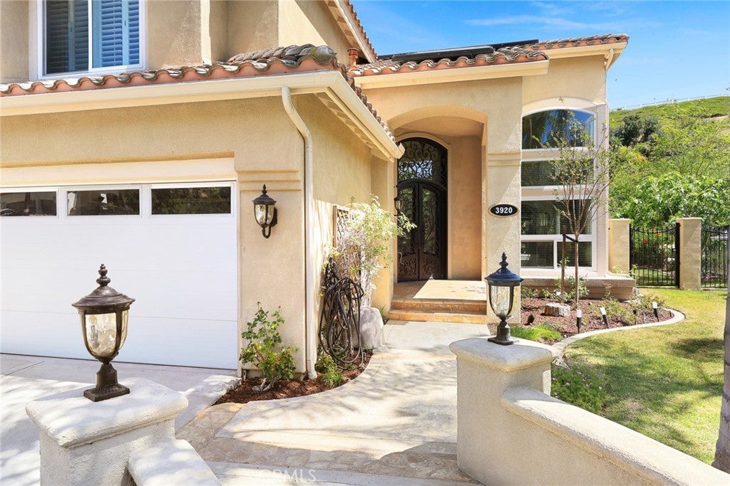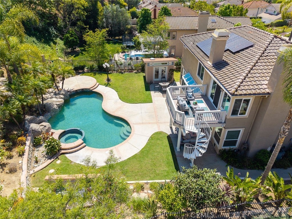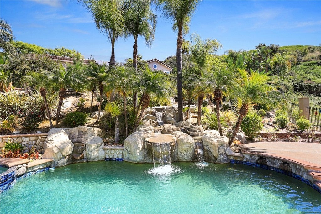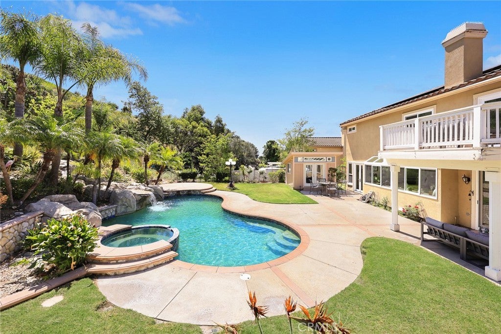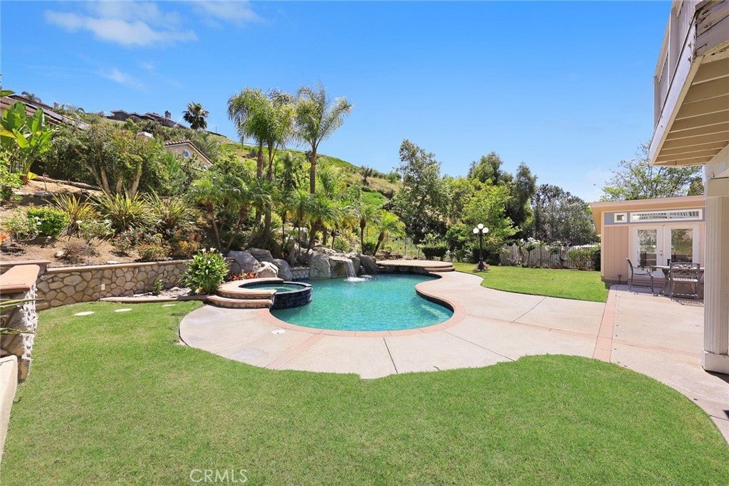 Nestled on one of Yorba Linda’s most picturesque streets, this stunning 5-bedroom, 3.5-bath pool and spa residence offers the perfect blend of elegance, comfort, and resort-style living. From its exceptional curb appeal to the breathtaking backyard, every detail is designed to impress. Step through custom iron and natural wood double doors into a dramatic cathedral-ceiling living room, where soaring ceilings, rich wood flooring, and stone accents create a grand first impression. The formal dining room flows seamlessly to the outdoors, capturing serene views of the lush landscaping and sparkling pool. The gourmet kitchen is both stylish and functional, featuring granite countertops, a large center island, walk-in pantry, and expansive windows that flood the space with natural light while framing tranquil views of cascading waterfalls. Open to the kitchen, the inviting family room offers a cozy gas fireplace, custom French doors, and direct access to the backyard—perfect for effortless indoor-outdoor living. A highly desirable main-level ensuite bedroom, along with a guest powder room, provides ideal flexibility for guests or multi-generational living. Upstairs, the luxurious primary suite serves as a private retreat, complete with a balcony overlooking the resort-style backyard, a dual-sided fireplace shared with a sitting area, two walk-in closets, and a spa-inspired bath featuring a jetted tub, separate shower, and dual vanities. Additional bedrooms include two connected by a Jack-and-Jill bathroom, plus another bedroom and full bath. The backyard is a true showpiece—a tropical oasis featuring a sparkling pool and spa, cascading waterfalls, fire features, and beautifully landscaped grounds with ambient lighting. Multiple French doors, sliders, and expansive windows throughout the home create a seamless connection between indoor and outdoor spaces, making it an entertainer’s dream. Additional highlights include double-pane windows and doors, solar panels, and a versatile he/she shed ideal for a studio, workspace, or hobbies. Located within the highly sought-after Yorba Linda High School boundary, this exceptional home truly offers the best of luxury living. Look no further—this is the home you’ve been waiting for.
