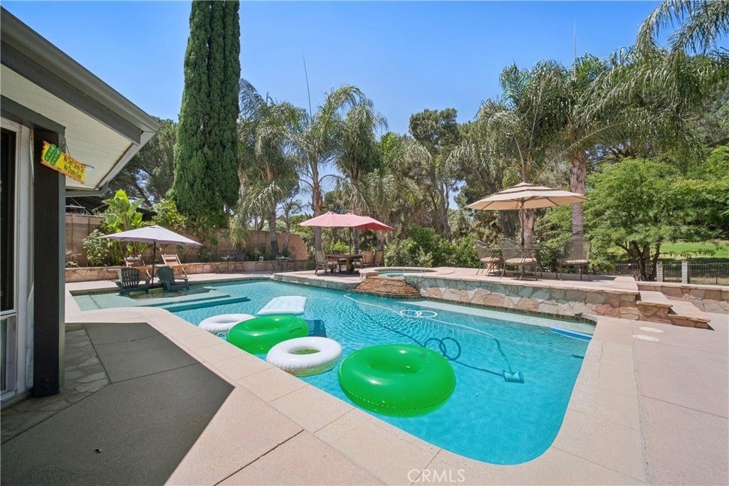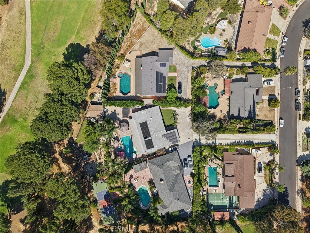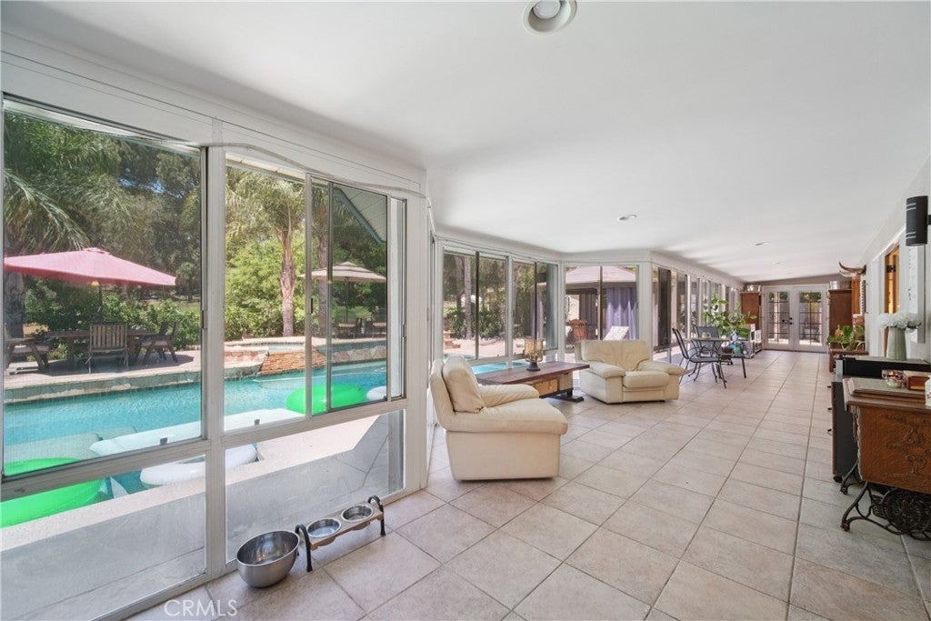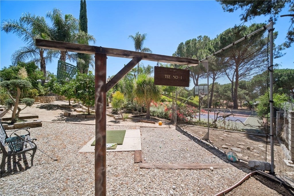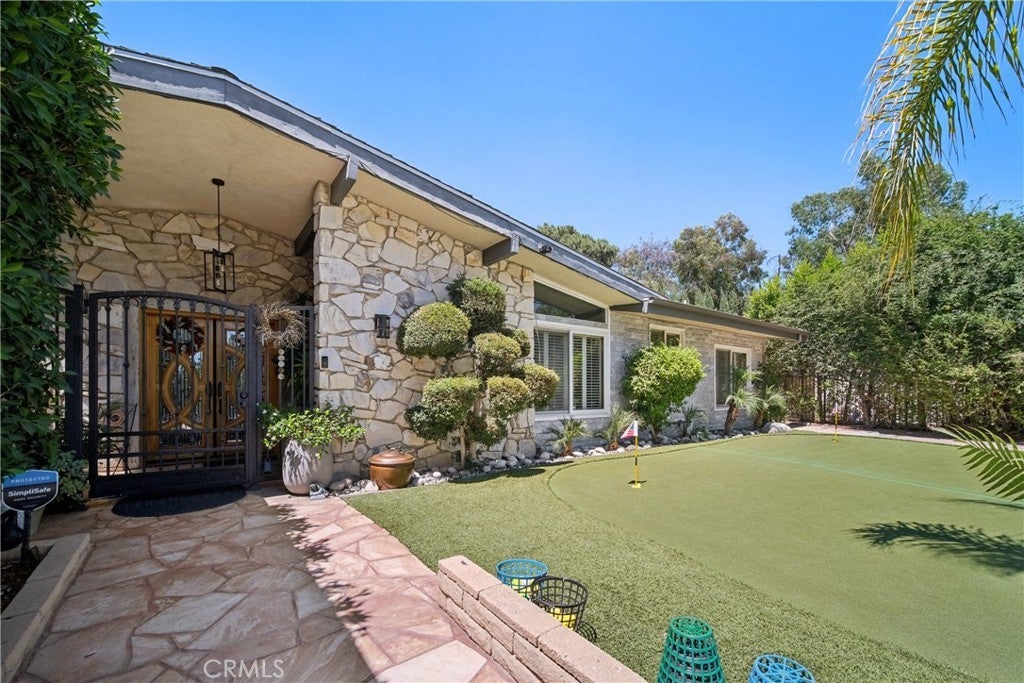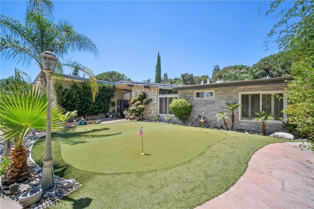 Welcome to 16857 Colven Rd, a beautifully upgraded and private Granada Hills retreat nestled on a rare 20,564 sq ft flag lot backing directly to the 14th tee box of Knollwood Country Club Golf Course. This 3-bedroom, 2.5-bathroom home measures approximately 2,516 sq ft of interior living space, with an additional 545+/- sq ft sunroom and 300+ sq ft pool house with bathroom—ideal as a guest retreat, studio, or flex space. It may be different from public records. Buyer to verify permit status and square footage. Upgrades include vaulted ceilings, recessed lighting, tiled floors, Marvin Windows with Plantation Shutters, a 60' glass-enclosed sunroom, and a finished garage with insulation, drywall, and recessed lighting. A tankless water heater ensures comfort and efficiency, and a 2021 mini-split system provides zoned cooling. Paid-off solar panels (installed in 2015) offer long-term energy savings. The property is accessed via a 160' private driveway leading to a sprawling ranch-style home. The front yard features custom lighting, fountains, ample parking, and a 320 sq. ft. 4-hole putting green. A custom wrought iron gate secures the front porch, blending curb appeal with peace of mind. The remodeled kitchen boasts rich cabinetry, a two-level granite island, tile floors, a garden window, and recessed lighting. It opens to a spacious den, and a solid wood French door connects to the west patio. The sunroom features tinted windows, recessed lighting, and French doors on both sides, plus two 10’ Longview sliders and a 13’ Marvin wood-clad French door. The primary suite offers tiled floors, recessed lighting, and a custom walk-in closet. The spa-style bathroom includes a stone accent wall, soaking tub, and a large shower enclosed with ¾” sapphire glass. Two additional bedrooms share a ¾ bath and feature mirrored closets, recessed lighting, ceiling fans, and mini-split AC. The backyard is a true resort-style oasis with terraced landscaping, remodeled PebbleTec pool and spa, built-in BBQ and fire pit, basketball court, toddler playground, and private driving range. Fruit trees—including Meyer lemon, orange, grapefruit, and pomegranate—along with a cactus garden and Queen Palms complete the scene. A rare opportunity to own a one-of-a-kind home on a premier lot with golf course access, quality upgrades, and lifestyle amenities.