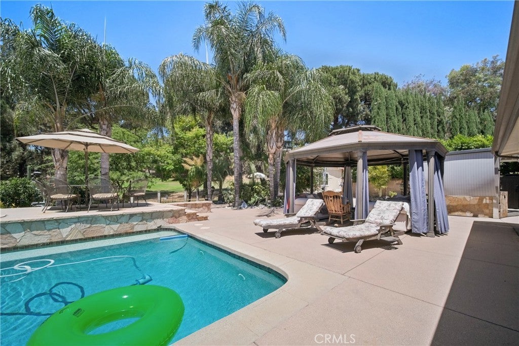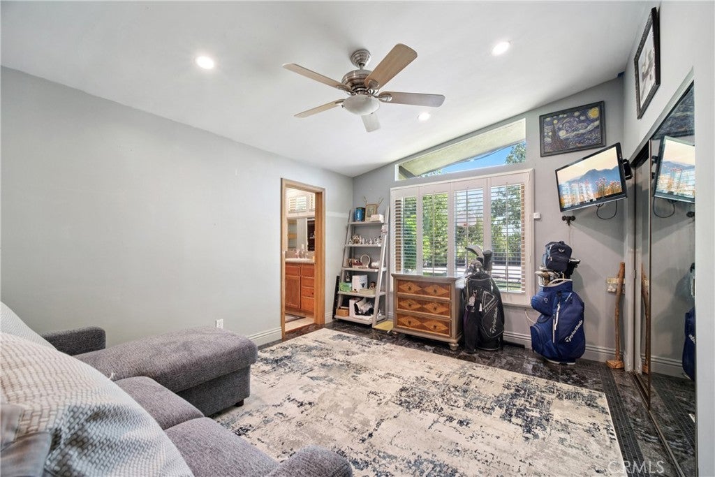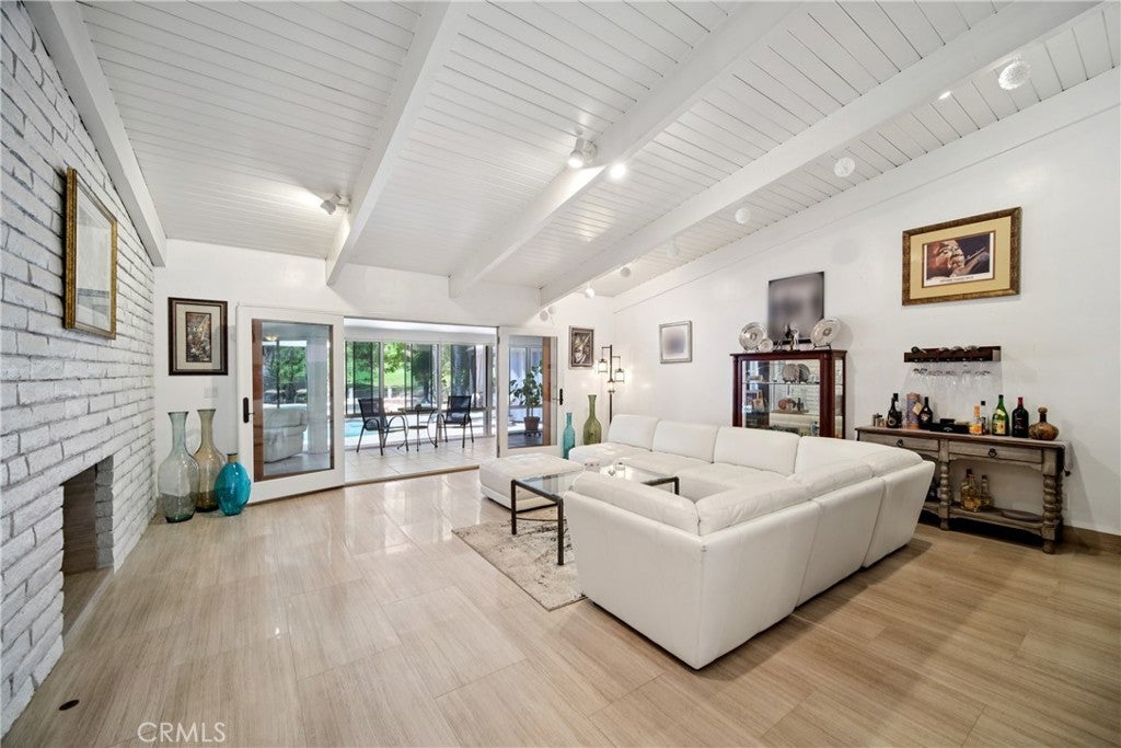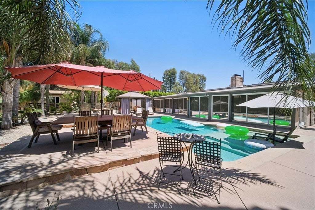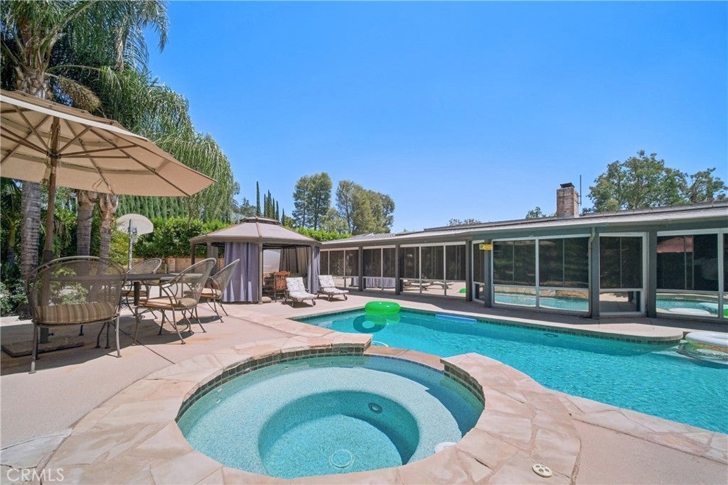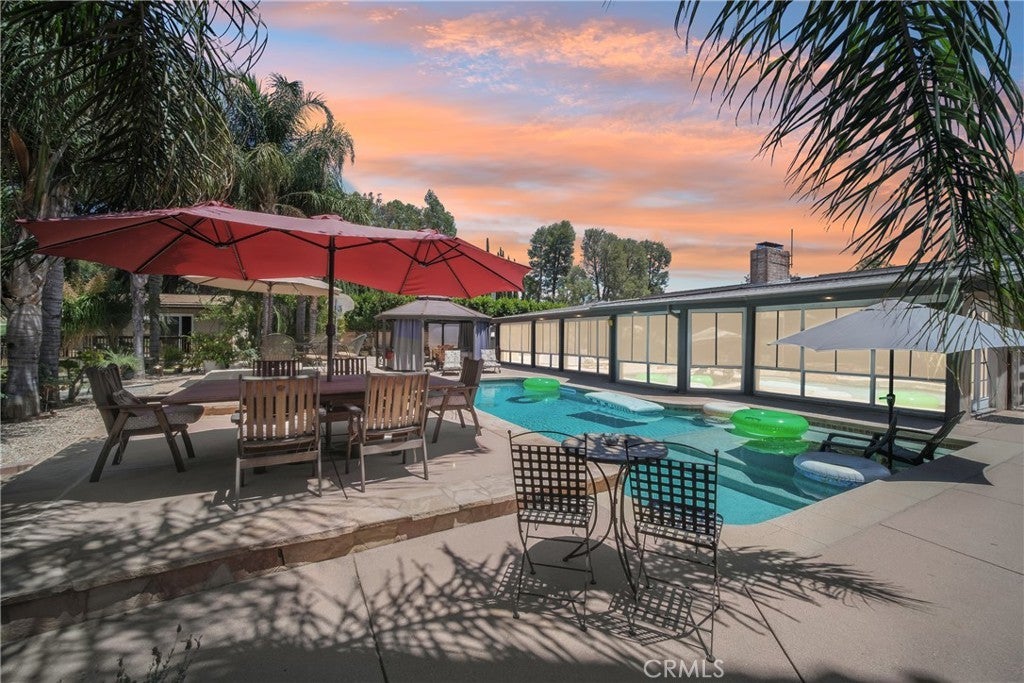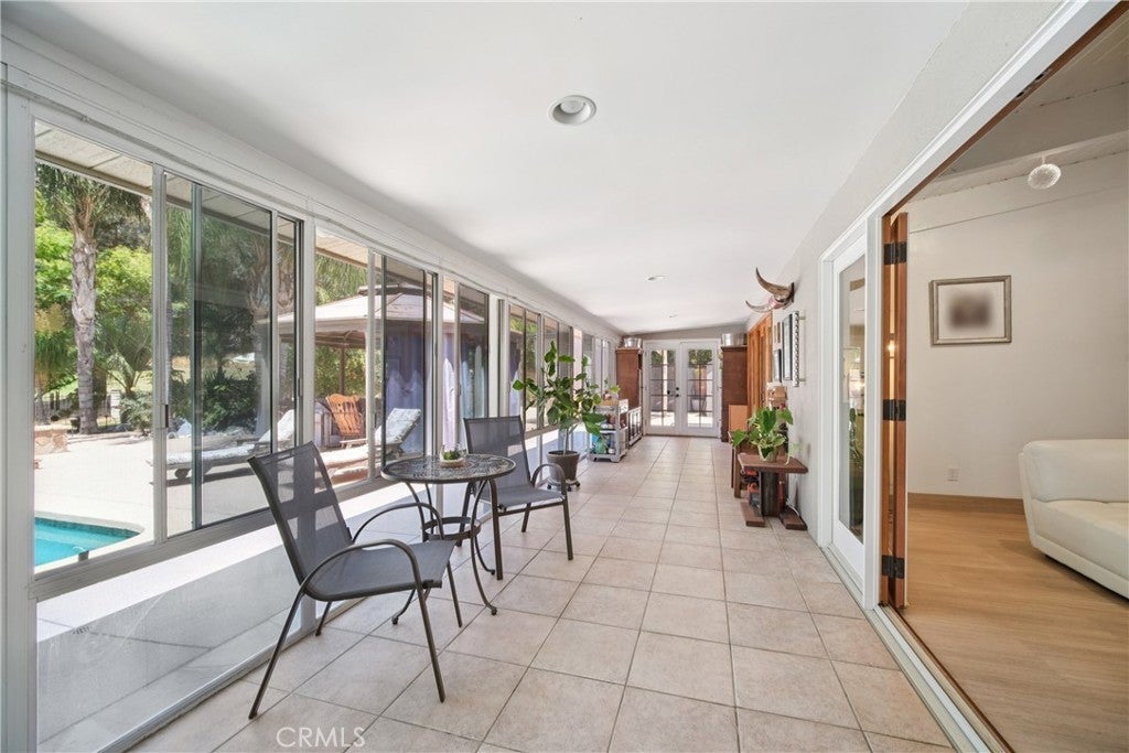 Welcome to 16857 Colven Rd, a beautifully upgraded and private Granada Hills retreat nestled on a rare 20,564 sq ft flag lot backing directly to the 14th tee box of Knollwood Country Club Golf Course. This 3-bedroom, 2.5-bathroom home measures approximately 2,516 sq ft of interior living space, with an additional 545+/- sq ft sunroom and 300+ sq ft pool house with bathroom—ideal as a guest retreat, studio, or flex space. It may be different from public records. Buyer to verify permit status and square footage. Upgrades include vaulted ceilings, recessed lighting, tiled floors, Marvin Windows with Plantation Shutters, a 60' glass-enclosed sunroom, and a finished garage with insulation, drywall, and recessed lighting. A tankless water heater ensures comfort and efficiency, and a 2021 mini-split system provides zoned cooling. Paid-off solar panels (installed in 2015) offer long-term energy savings. The property is accessed via a 160' private driveway leading to a sprawling ranch-style home. The front yard features custom lighting, fountains, ample parking, and a 320 sq. ft. 4-hole putting green. A custom wrought iron gate secures the front porch, blending curb appeal with peace of mind. The remodeled kitchen boasts rich cabinetry, a two-level granite island, tile floors, a garden window, and recessed lighting. It opens to a spacious den, and a solid wood French door connects to the west patio. The sunroom features tinted windows, recessed lighting, and French doors on both sides, plus two 10’ Longview sliders and a 13’ Marvin wood-clad French door. The primary suite offers tiled floors, recessed lighting, and a custom walk-in closet. The spa-style bathroom includes a stone accent wall, soaking tub, and a large shower enclosed with ¾” sapphire glass. Two additional bedrooms share a ¾ bath and feature mirrored closets, recessed lighting, ceiling fans, and mini-split AC. The backyard is a true resort-style oasis with terraced landscaping, remodeled PebbleTec pool and spa, built-in BBQ and fire pit, basketball court, toddler playground, and private driving range. Fruit trees—including Meyer lemon, orange, grapefruit, and pomegranate—along with a cactus garden and Queen Palms complete the scene. A rare opportunity to own a one-of-a-kind home on a premier lot with golf course access, quality upgrades, and lifestyle amenities.