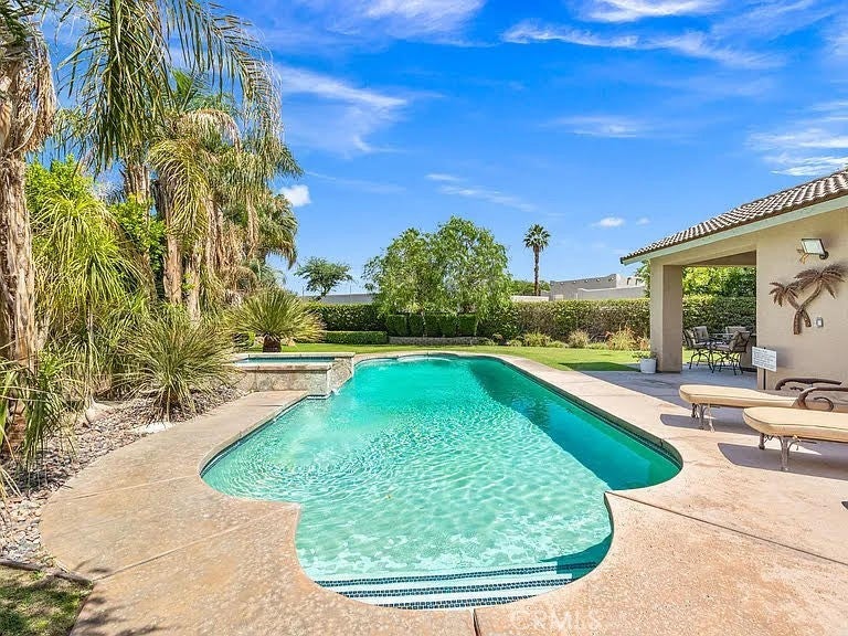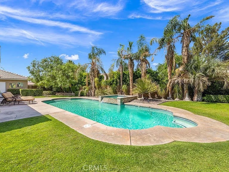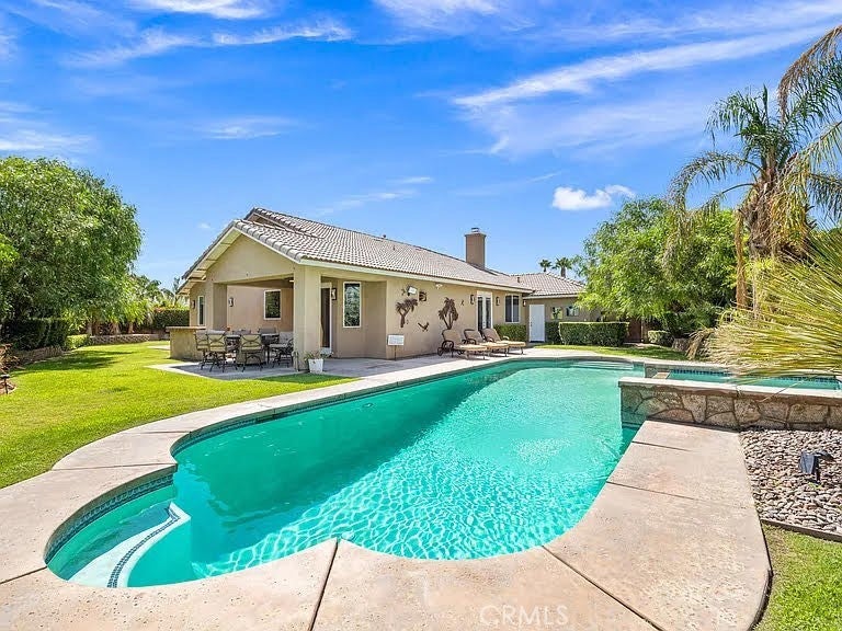 This turnkey residence in Bermuda Dunes offers the benefits of a spacious cul-de-sac and high-quality upgrades. The single-story home features four bedrooms and three baths in approximately and spacious living space. Upon entering the home, a formal entry leads to a formal dining room suitable for entertaining, and a spacious living room with a fireplace. The kitchen is designed for convenience and hosts an oversized island, granite countertops, bar seating and side-yard access. One secondary bedroom features an ensuite bath, while the primary suite includes a patio, walk-in closet, soaking tub, separate shower, and two sinks. A private backyard with a pool, spa, and waterfall. The wraparound yard provides ample space for entertaining, and additional parking is available on the large driveway adjacent to the attached three-car garage. This inviting home is situated in the Bermuda Vista community, bordering Palm Desert, and is close to stores and restaurants, golf courses, the Indian Wells Tennis Garden and nearby Stagecoach and Coachella music festivals.
