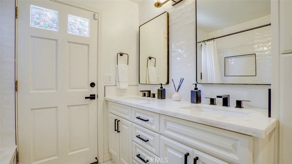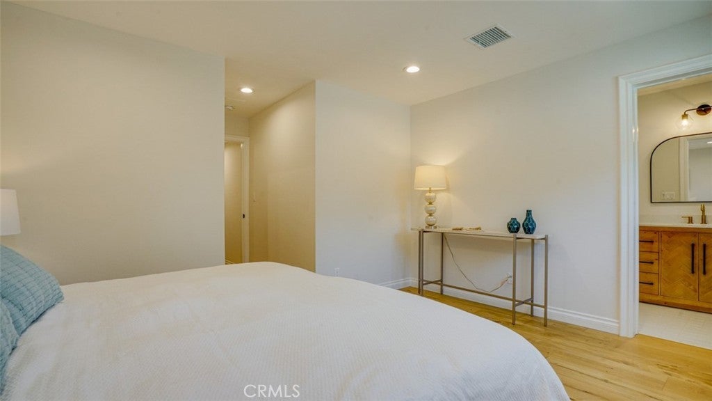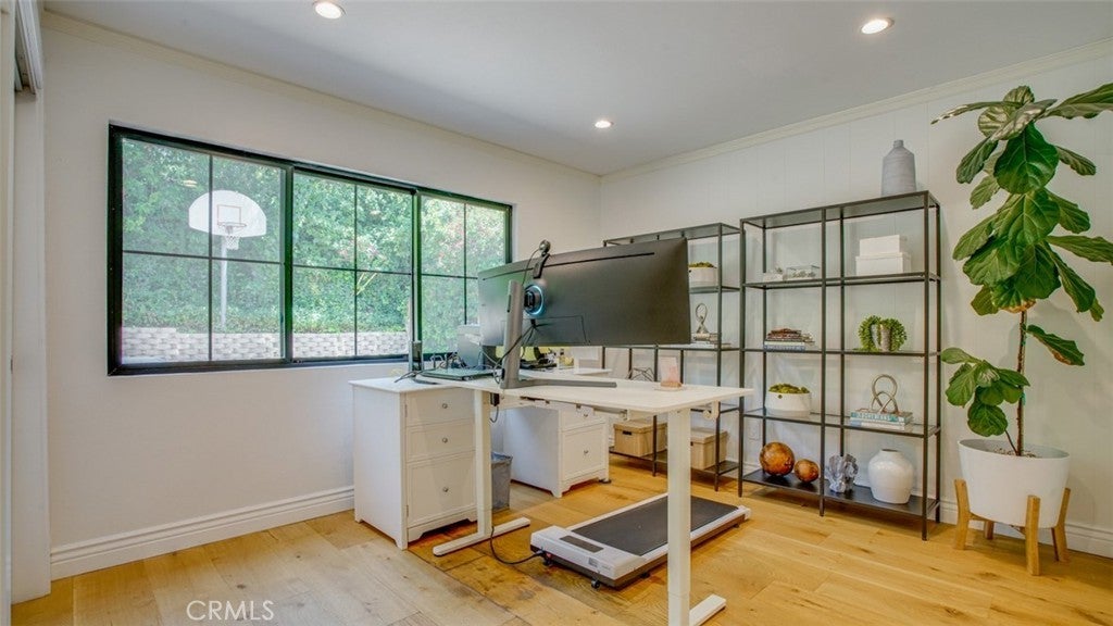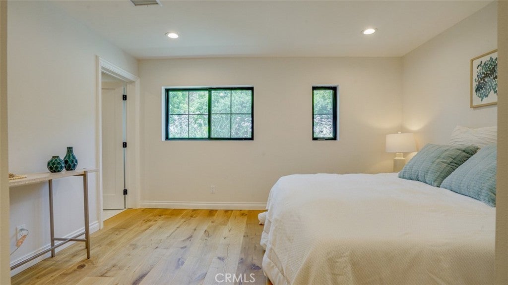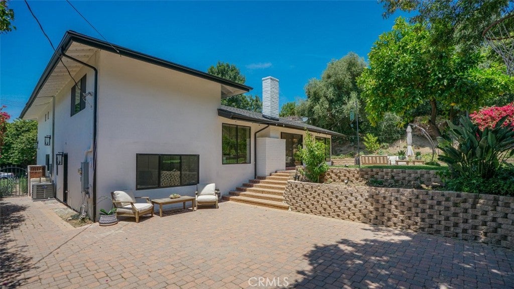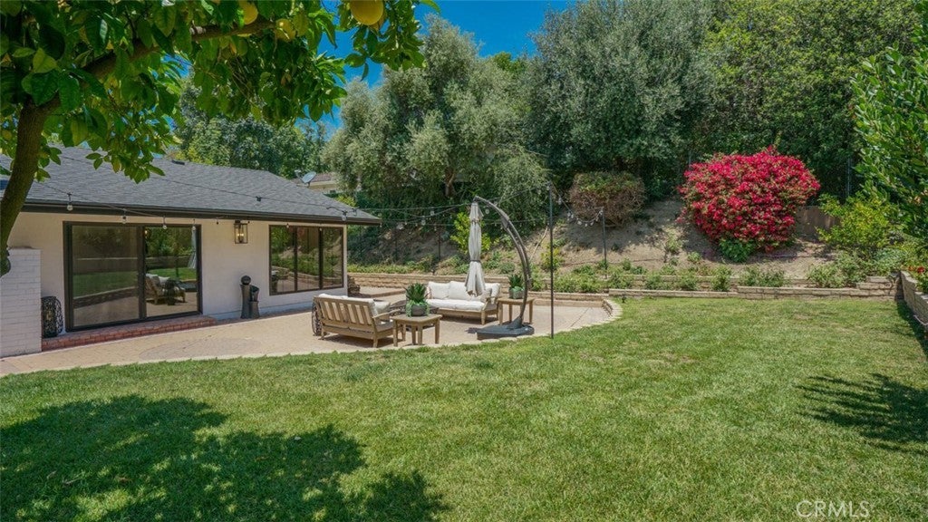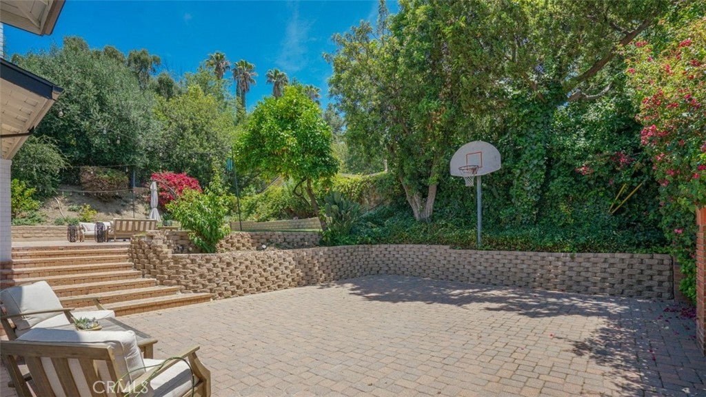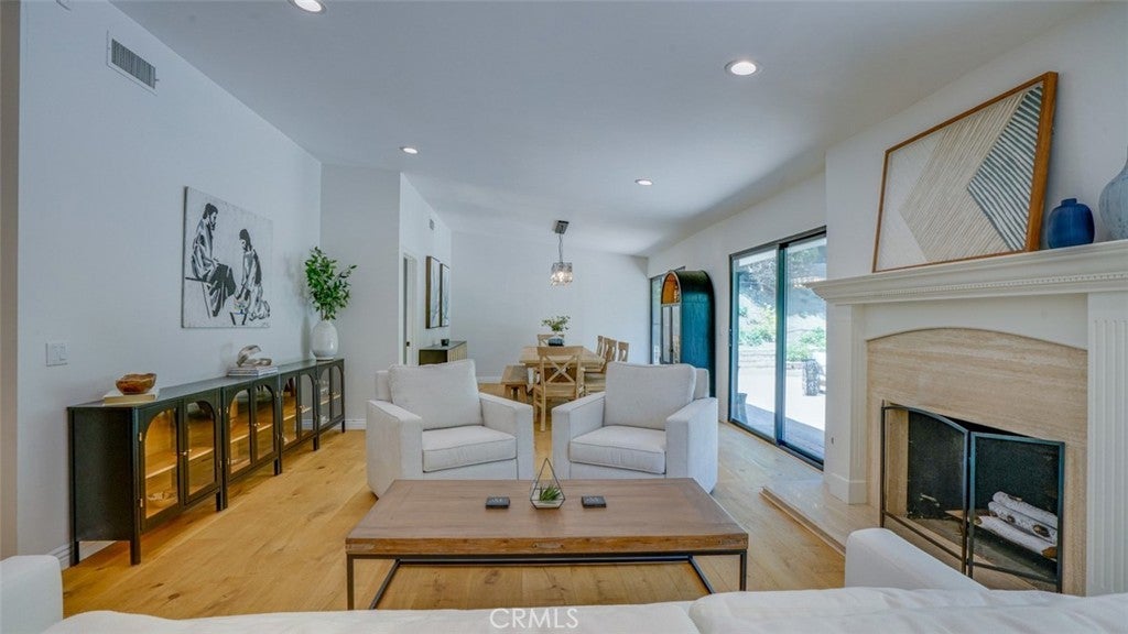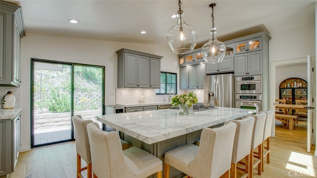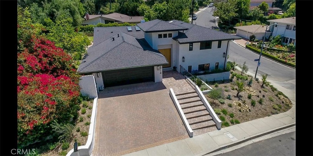 Sophisticated newly remodeled and expanded residence tucked into the hills of Woodland Hills. Positioned on a prime corner lot, this 5-bedroom, 5-bath home seamlessly blends clean modern design with a touch of coastal-inspired style. The attached addition and carefully selected upgrades elevate both function and beauty. Wide-plank white oak floors, all-new interior doors, a brand-new roof, new HVAC, and energy-efficient windows create a light-filled and elegant environment throughout. A dramatic 16-foot foyer entry sets the tone, leading into the open-concept living area centered around a sleek stone fireplace. Expansive windows and sliding glass doors flood the interiors with natural light while creating a seamless connection to the outdoors. The adjacent formal dining room—with its own oversized glass doors—opens directly to the landscaped backyard, perfect for entertaining or enjoying an indoor-outdoor lifestyle. The chef’s kitchen is a statement of both style and practicality, offering abundant custom cabinetry, generous counter space, a large island with seating for six, a five-burner cooktop, and double ovens. A sliding door from the kitchen opens to a built-in BBQ, ideal for al fresco dining. The primary suite serves as a luxurious private escape with dual walk-in closets and a spa-inspired bath featuring double vanities, a soaking tub, walk-in shower, and private water closet. Two additional guest suites each include their own full bathrooms with tile and granite finishes for comfort and privacy. On the lower level, two spacious bedrooms share a beautifully updated bath with double sinks, a tub/shower combo, and elegant finishes. A large laundry room is equipped with custom cabinetry, shelving, folding counter, and utility sink, plus two extra storage closets. The backyard is designed for both leisure and play, featuring a spacious patio, basketball court, and grassy area. Set in a highly desirable neighborhood with access to award-winning schools—Calabash Charter Academy, Hale Charter Academy, and El Camino Real Charter High School—this property offers the complete package: refined design, generous space, and a prime location. A rare turnkey opportunity in one of Woodland Hills’ most sought-after communities.