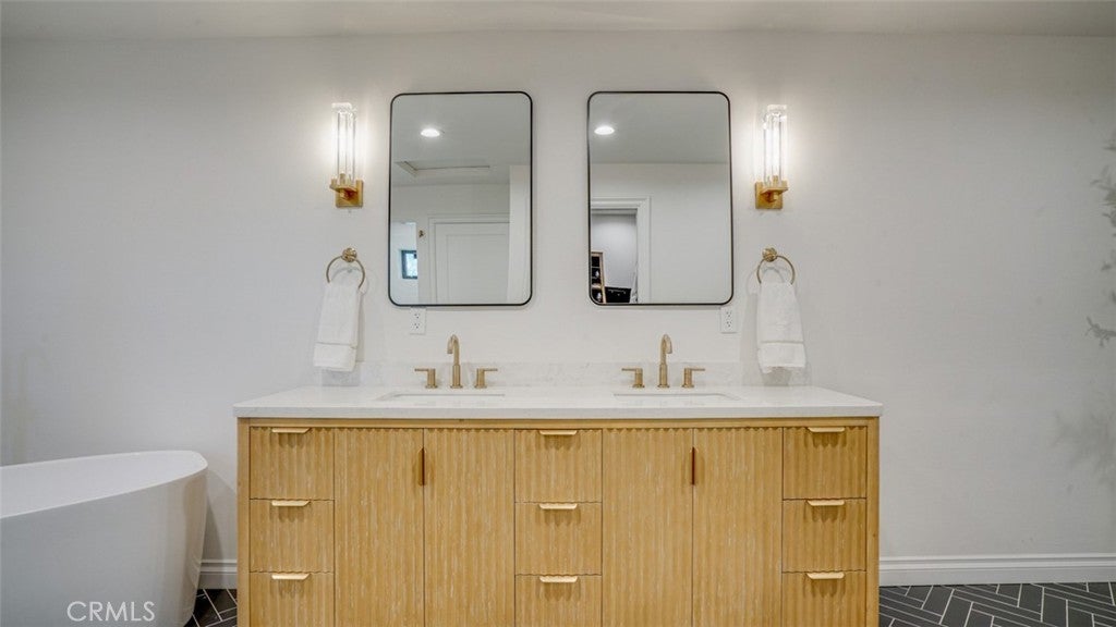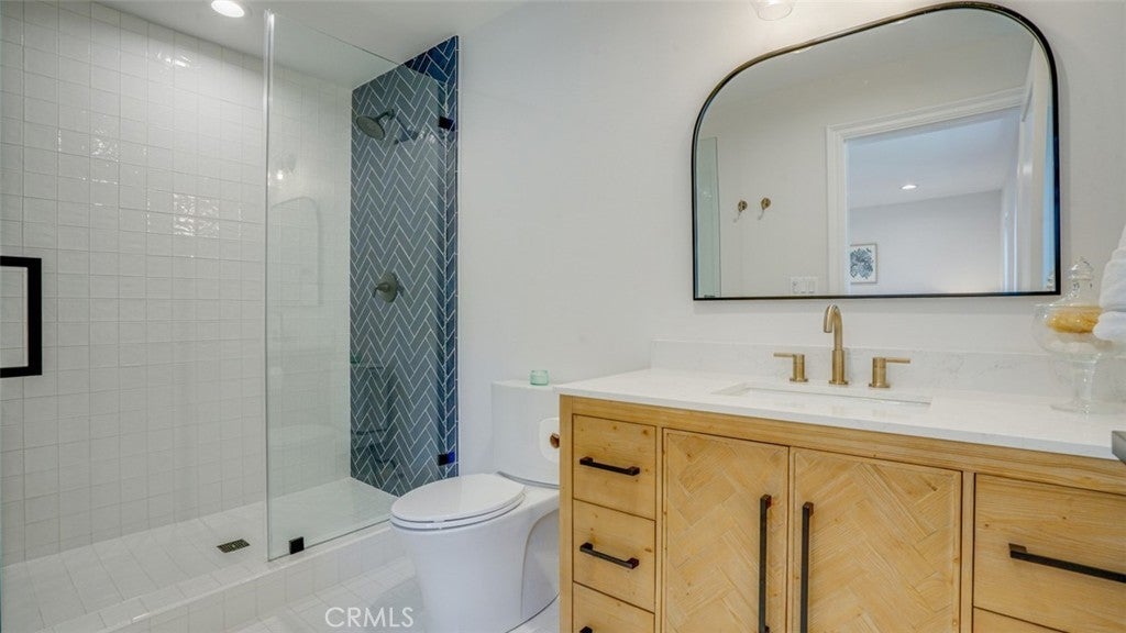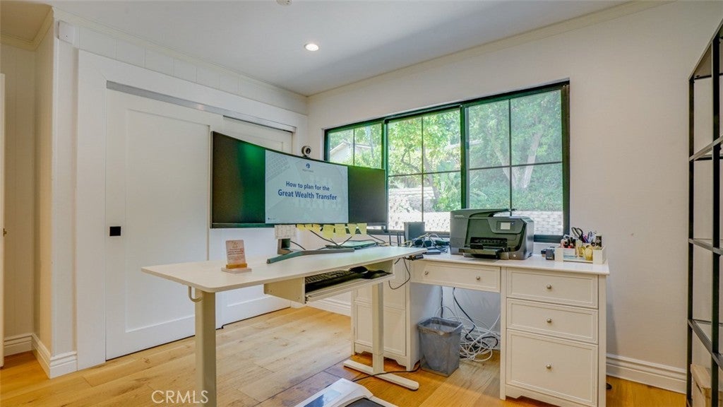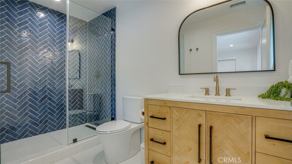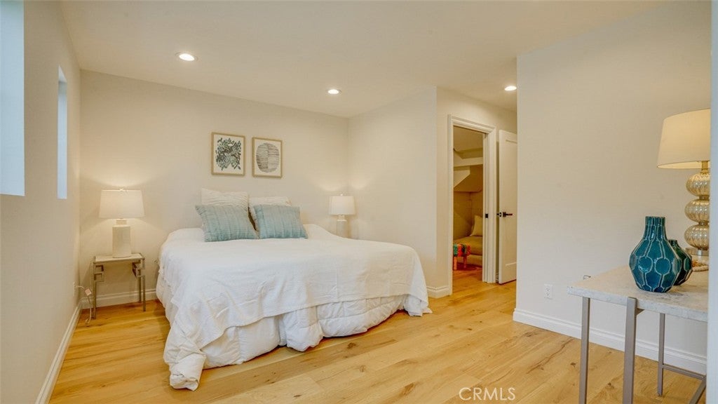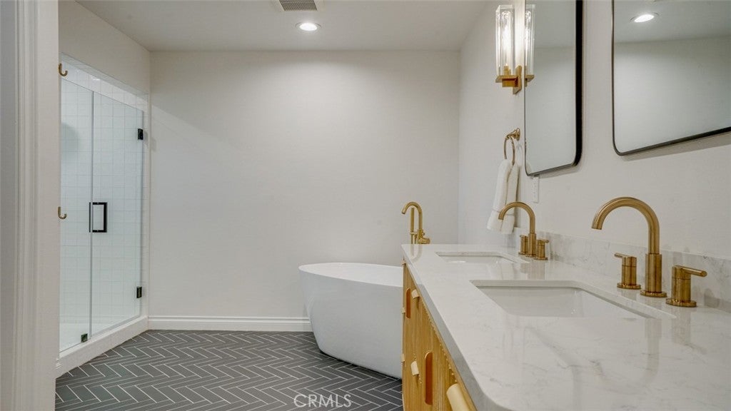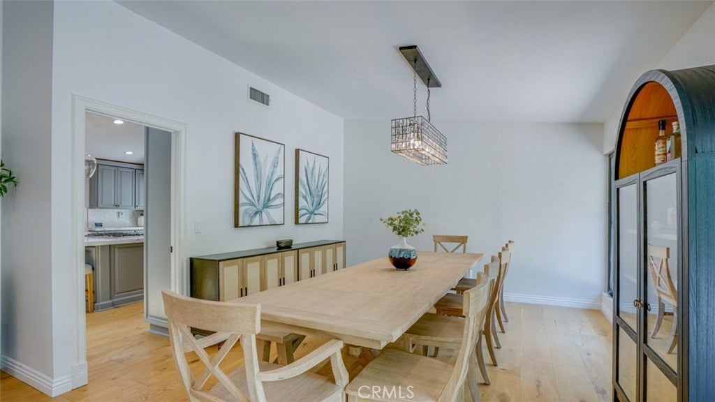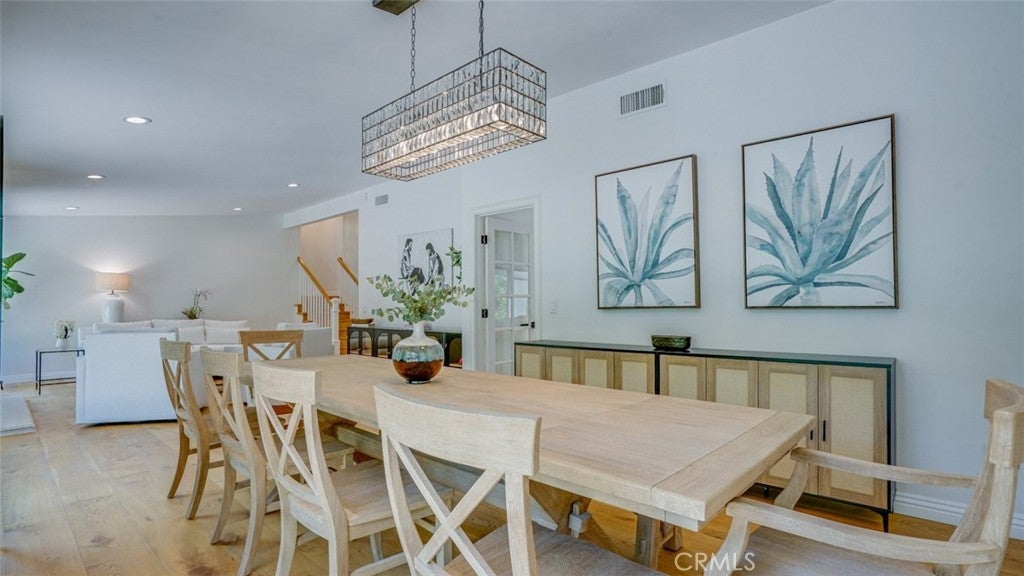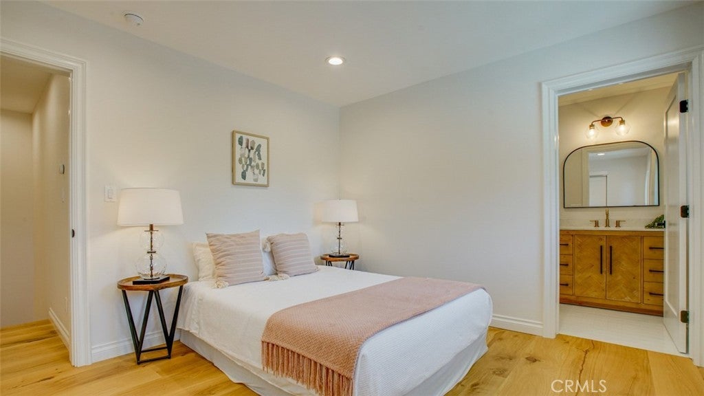Sophisticated newly remodeled and expanded residence tucked into the hills of Woodland Hills. Positioned on a prime corner lot, this 5-bedroom, 5-bath home seamlessly blends clean modern design with a touch of coastal-inspired style. The attached addition and carefully selected upgrades elevate both function and beauty. Wide-plank white oak floors, all-new interior doors, a brand-new roof, new HVAC, and energy-efficient windows create a light-filled and elegant environment throughout. A dramatic 16-foot foyer entry sets the tone, leading into the open-concept living area centered around a sleek stone fireplace. Expansive windows and sliding glass doors flood the interiors with natural light while creating a seamless connection to the outdoors. The adjacent formal dining room—with its own oversized glass doors—opens directly to the landscaped backyard, perfect for entertaining or enjoying an indoor-outdoor lifestyle. The chef’s kitchen is a statement of both style and practicality, offering abundant custom cabinetry, generous counter space, a large island with seating for six, a five-burner cooktop, and double ovens. A sliding door from the kitchen opens to a built-in BBQ, ideal for al fresco dining. The primary suite serves as a luxurious private escape with dual walk-in closets and a spa-inspired bath featuring double vanities, a soaking tub, walk-in shower, and private water closet. Two additional guest suites each include their own full bathrooms with tile and granite finishes for comfort and privacy. On the lower level, two spacious bedrooms share a beautifully updated bath with double sinks, a tub/shower combo, and elegant finishes. A large laundry room is equipped with custom cabinetry, shelving, folding counter, and utility sink, plus two extra storage closets. The backyard is designed for both leisure and play, featuring a spacious patio, basketball court, and grassy area. Set in a highly desirable neighborhood with access to award-winning schools—Calabash Charter Academy, Hale Charter Academy, and El Camino Real Charter High School—this property offers the complete package: refined design, generous space, and a prime location. A rare turnkey opportunity in one of Woodland Hills’ most sought-after communities.