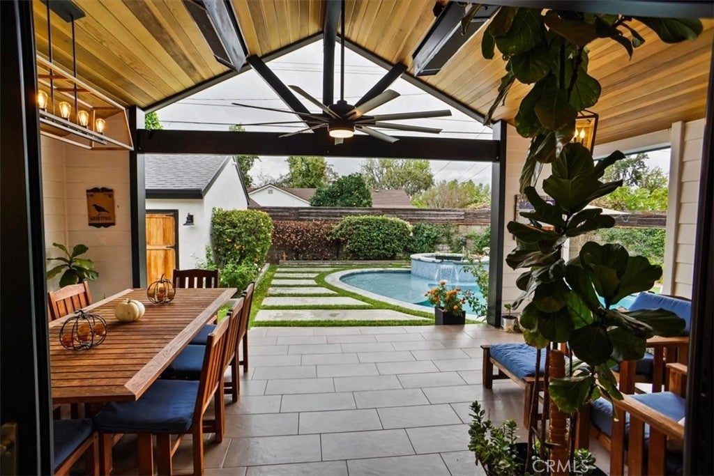 1902 total sq. ft. of functional living space inclusive of the California Room. 606 Uclan Drive epitomizes California Resort Living with thoughtfully completed upgrades throughout. The expanded chef’s kitchen features a large center island, walk-in pantry, Thermador and Bosch appliances, custom range hood, and a dedicated coffee/wet bar area. New Milgard fiberglass windows, sliders, and doors pair with Smith & Noble blinds for a fresh, cohesive look. Major system upgrades include a Lennox HVAC, composite roof, attic insulation, tankless water heater, copper plumbing, and a 200-amp service panel feeding a 200-amp subpanel via underground conduit. The backyard feels like a private resort with a redesigned pool and spa, Baja shelf, umbrella holders, and all-new energy-efficient Pentair equipment. The standout feature is the California Room—a partially enclosed, fully functional outdoor living space with a large ceiling fan and dual Sunpak heaters, creating a seamless indoor-outdoor experience. Additional highlights include custom bedroom closets, remodeled bathrooms, and custom redwood garage doors opening to a sound-treated studio with loft storage.