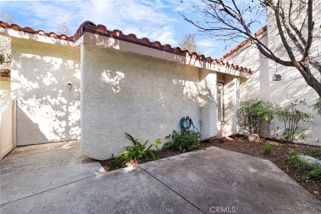 Woodlands single-family attached end unit featuring a highly desirable single-story open-concept floor plan with 2 bedrooms and 2 full bathrooms. This corner unit offers vaulted ceilings, abundant natural light, and an attached two-car garage with only one shared wall for enhanced privacy. Enjoy indoor-outdoor living with two separate patios overlooking mature landscaping and an adjacent expansive common-area green space. Ideally situated in a quiet location within the community with no through traffic, this home offers exceptional tranquility. The community boasts resort-style amenities including a pool and spa, two tennis courts, a spacious recreation room, and ample guest parking. Conveniently located close to shopping, restaurants, top-rated schools, parks, and scenic hiking and biking trails, this home perfectly blends comfort, privacy, and exceptional community living.