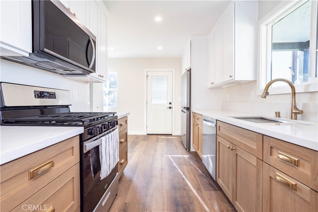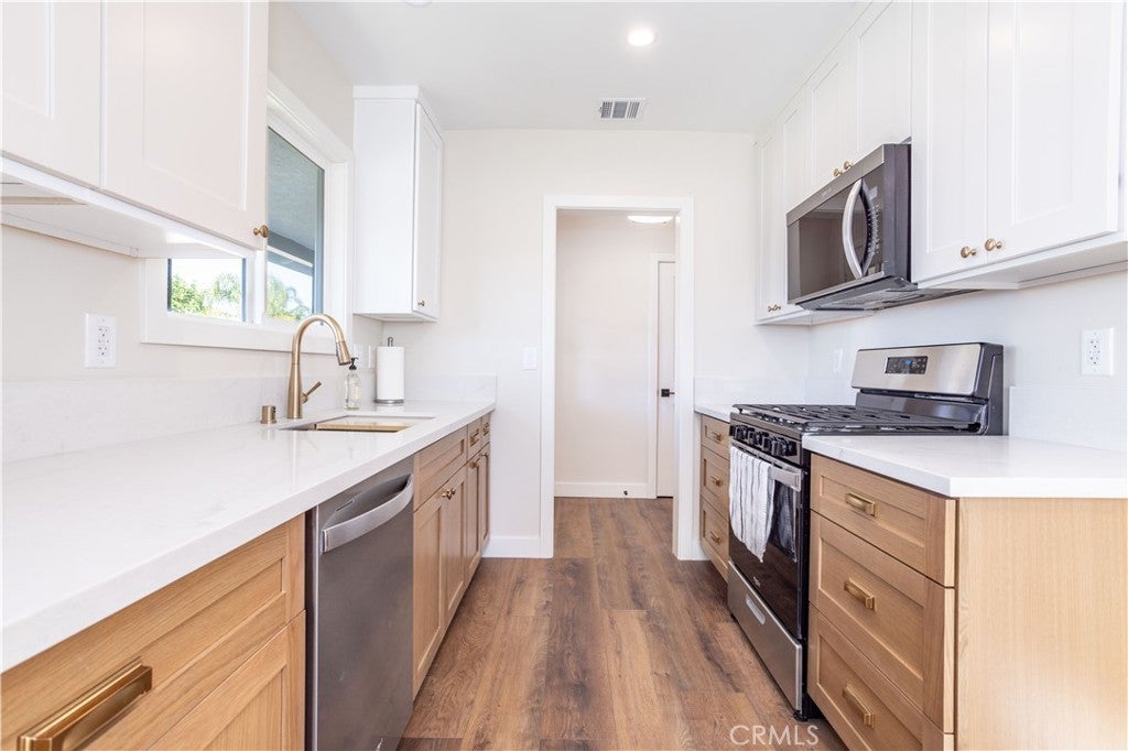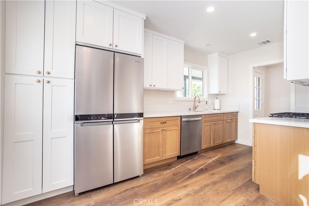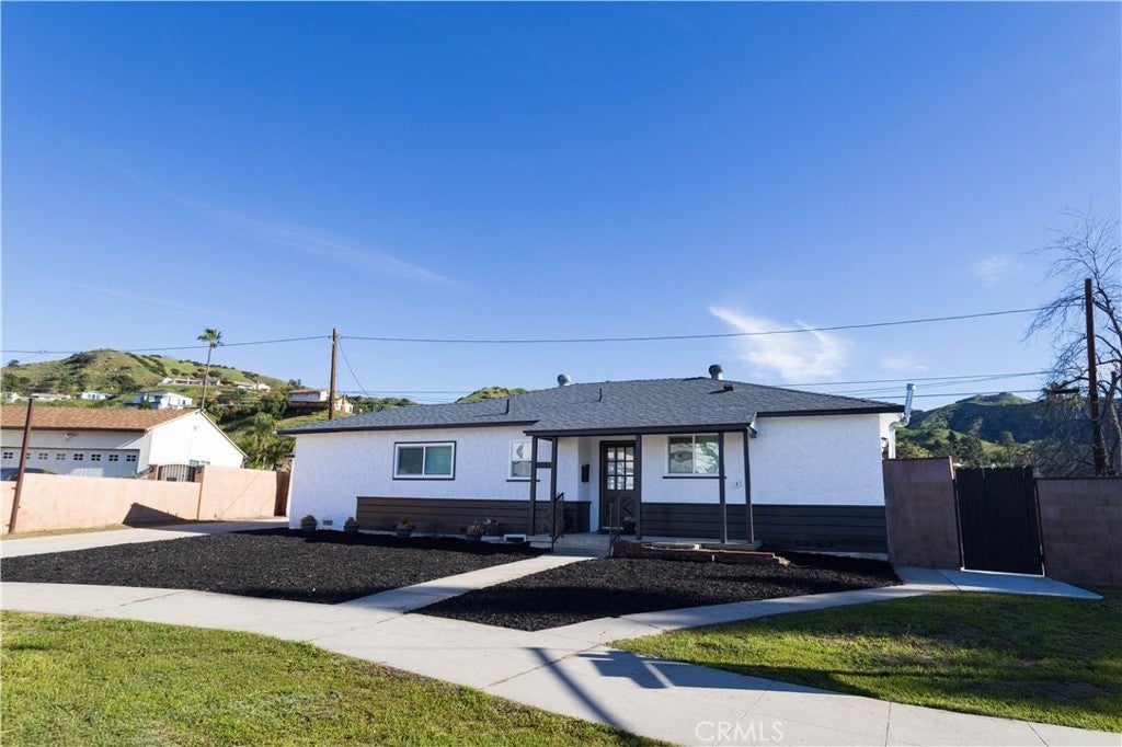 Beautiful freshly remodeled 3-bedroom 2-bath home in prime Sun Valley area with large lot adjacent to Burbank. The spacious interior features open concept living and family rooms, a refined separate dining area with modern chandelier, a large & bright kitchen boasting brand new appliances – including refrigerator, dishwasher, oven range, microwave, washer & dryer, and abundant cabinet space. The new stacking washer & dryer set is discreetly located in the kitchen nook, and a convenient kitchen side door leads to a generous lot of over 9K square feet. The primary bathroom features a beautiful walk-in shower with upscale finishes and wall cabinetry. Towards the back, the rear bedroom opens to a newly paved, smooth-concrete side yard that connects to the garage entrance. Extending from here, the concrete walkway leads to an outdoor space with gorgeous mountain views, a variety of fruit trees, and a wrap-around path to a side yard offering an expansive green space. Each bedroom is equipped with modern ceiling fans and wall-secured remotes. Recessed lighting & dimmable light switches and beautiful new faux-wood window blinds throughout; premium vinyl flooring; and a new electrical panel are among more of the numerous upgrades. Full use of 1.5 car garage for storage and parking included in monthly lease. Come see this beautiful remodeled home on a generous lot near the Hollywood-Burbank Airport, Woodbury University, vibrant Burbank shopping, and easy freeway access!