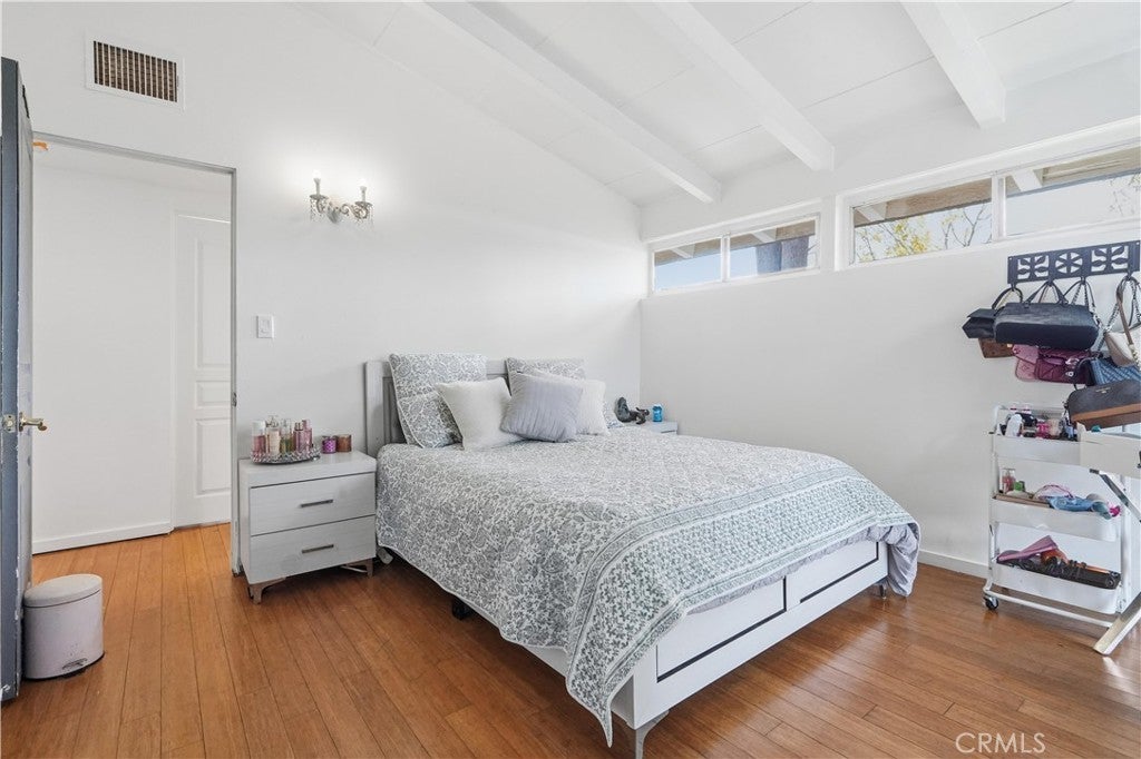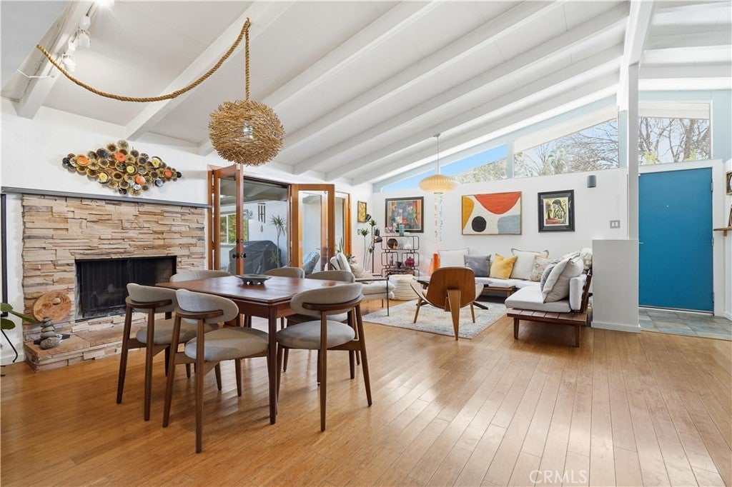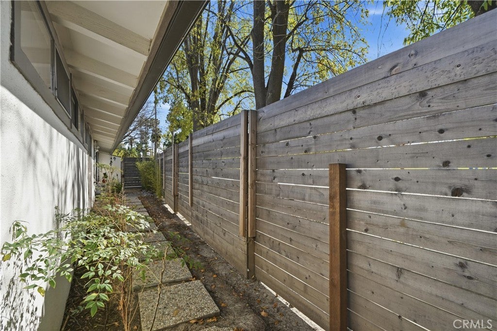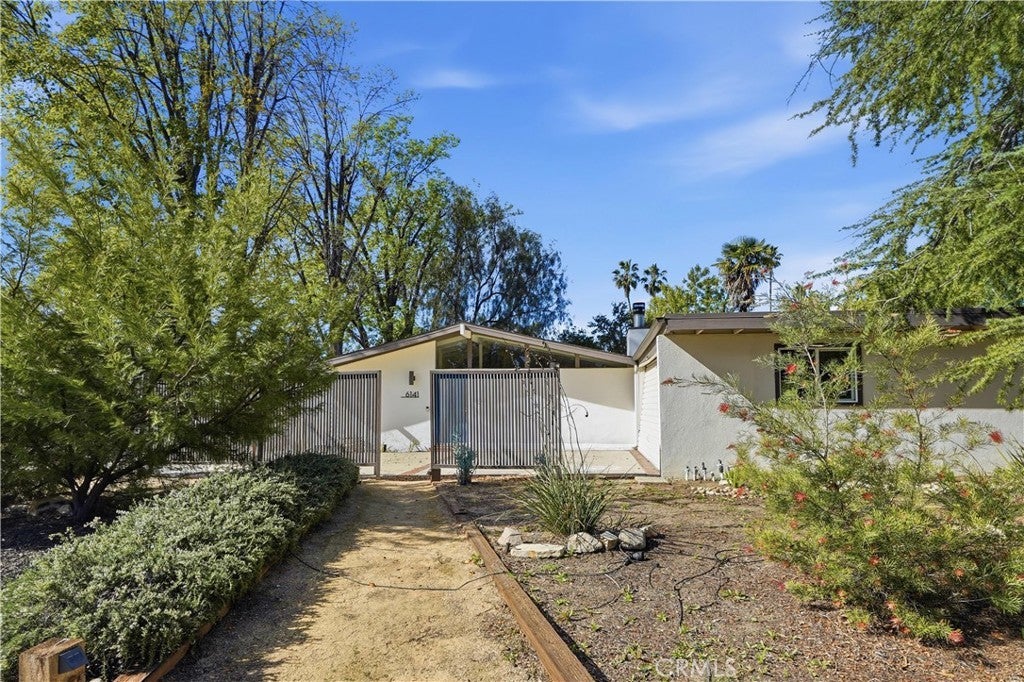 Corbin Palms Home :: Palmer & Krisel, Architects. Sited on a prominent corner in the storied and historic mid-century modern enclave known as “Corbin Palms,” this post & beam home is a testament to the enduring legacy and forward-thinking design of architects, Palmer & Krisel. The home retains such classic features as open-beam ceilings, wide expanses of glass, and clerestory windows. An airy, flexible floor plan contains 3 bedrooms and 2 1/2 bathrooms, the fourth bedroom having been opened to the living room, creating a cozy and comfortable den, but easily converted back to a 4th bedroom if needed. A portion of the garage has been converted into a studio/workshop, offering the opportunity for creating finished office/guest space, or easily converting back to garage space. Glass doors open to the yard with multiple patios and mature trees, setting the stage for laid-back Southern California living in the sunny San Fernando Valley.