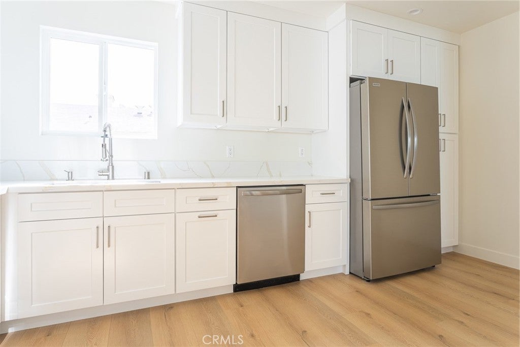 Welcome to this beautifully fully renovated 2 bed, 1 bath apartment at 1065 E Sazier Ave, Unit 202, located just minutes from downtown Burbank. This second-floor unit provides a spacious modern living with large windows and abundant natural light. The open-concept living and kitchen area features laminate flooring and a brand-new kitchen with white shaker cabinets, quartz countertops, and stainless steel appliances, including a gas stove, refrigerator, dishwasher, and microwave. Enjoy the convenience of an in-unit stackable washer and dryer and central HVAC for customized comfort. The spacious bathroom is beautifully finished with large-format tile, a modern vanity with quartz counter, and a walk-in shower. Both bedrooms offer generous closet space. This unit has been completely gutted and rebuilt, including new windows, roof, stucco, electrical, plumbing, HVAC, and all interior finishes. Advertised rental rate is offered to well-qualified applicants only with strong credit, income, and rental history.