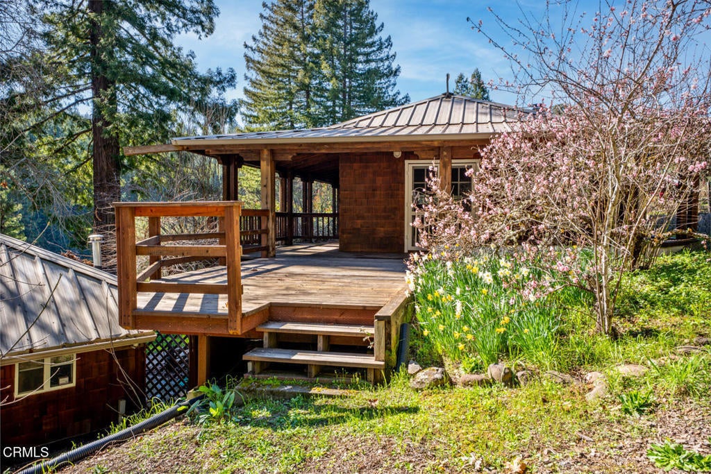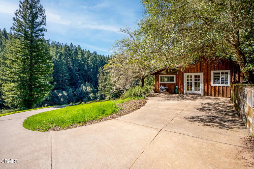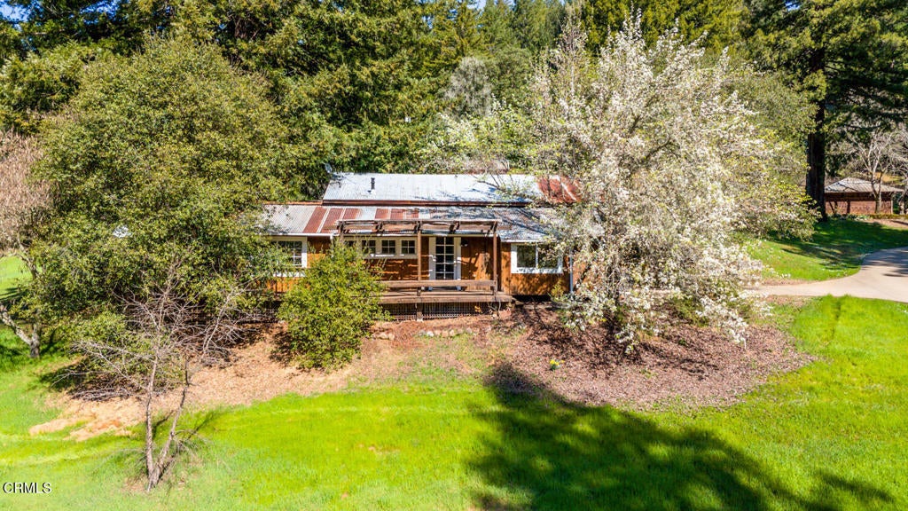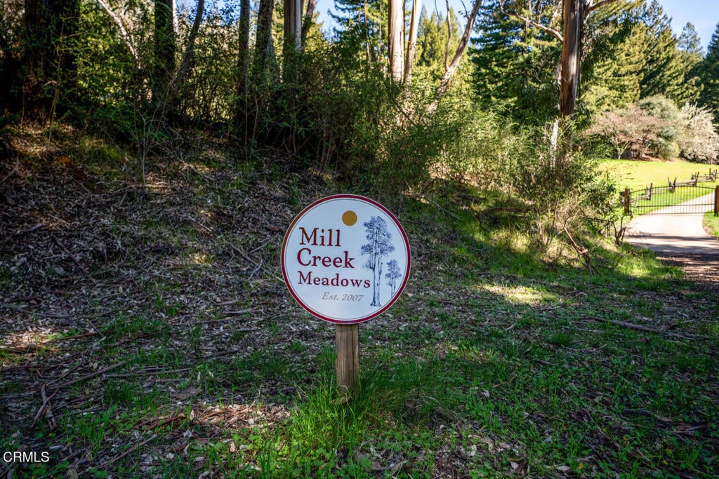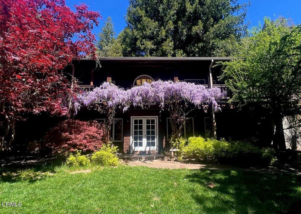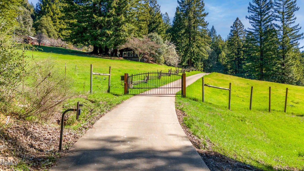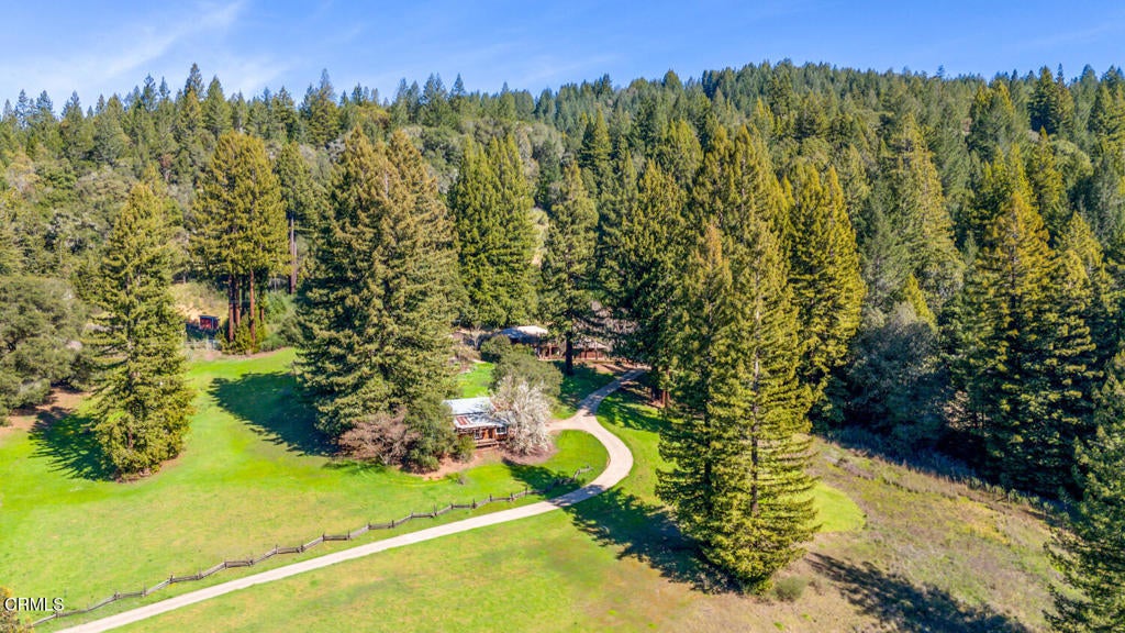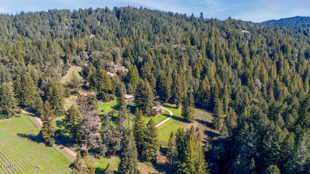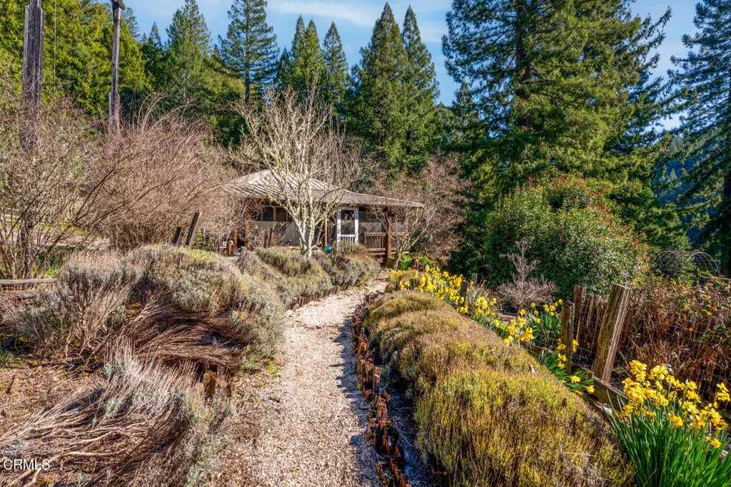 Winding along the gated, private drive as you enter into Mill Creek Meadows, this 40-acre estate, complete with a main house and studio, separate guest house and workshop, rolling meadows, tree-lined pathways, and year-round creek with waterfall, exudes rustic elegance. The main residence features beautiful hand-hewn timber beams inside and out and is sited at a generous elevation, offering incredible views from virtually every vantage point. An inviting wisteria-draped front porch entrance opens into the first-floor great room. The central core of this room boasts a two-story vaulted ceiling above the dining area and is flanked on one side by the living room and on the other, a kitchen, both with ceilings at a lower profile. The farmhouse-style kitchen is striking with its wraparound counter and breakfast bar, exposed beams and rafters, coffered ceiling and abundant cabinetry. The second floor hosts the primary bedroom suite, bath/laundry and family room, and includes a screened-in porch and steps that lead to a beautiful rose and vegetable garden. The detached studio visually blends into the landscape and features a spacious second bedroom and bath. The grounds are truly spectacular. There are stretches of meadows, terraced gardens, apple orchards, and stands of majestic Redwoods. Additional features include perimeter fencing, a paved driveway, a 3-car garage, green house, and 3 wells.