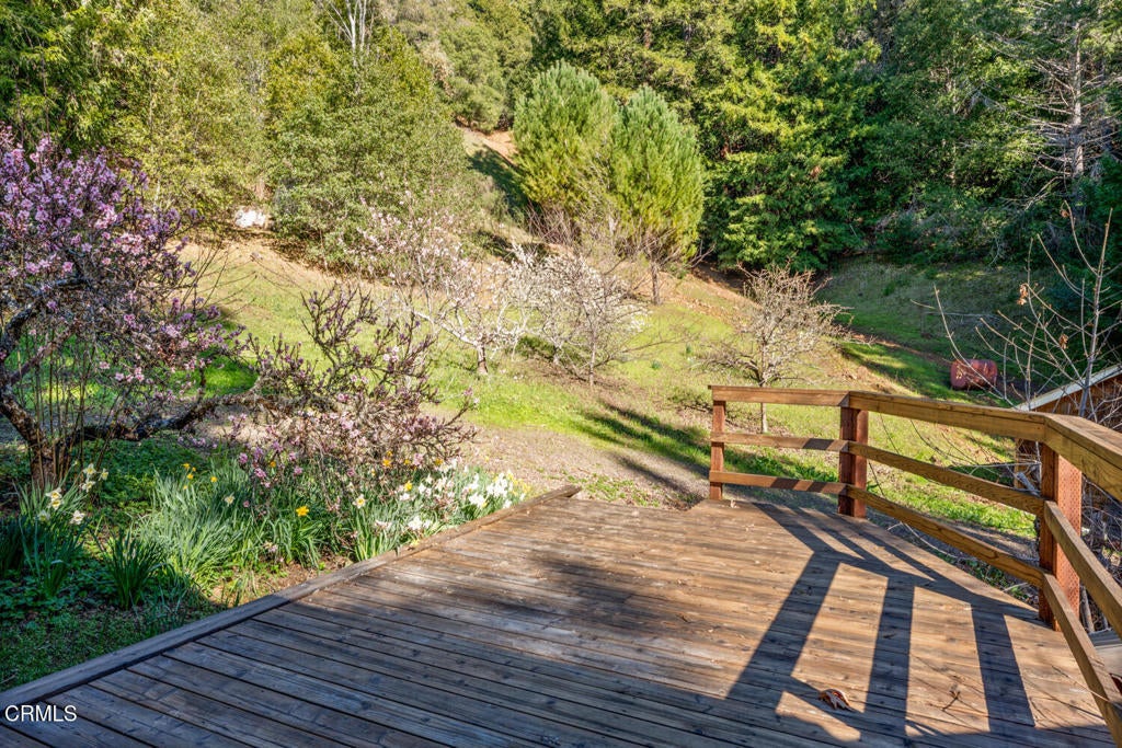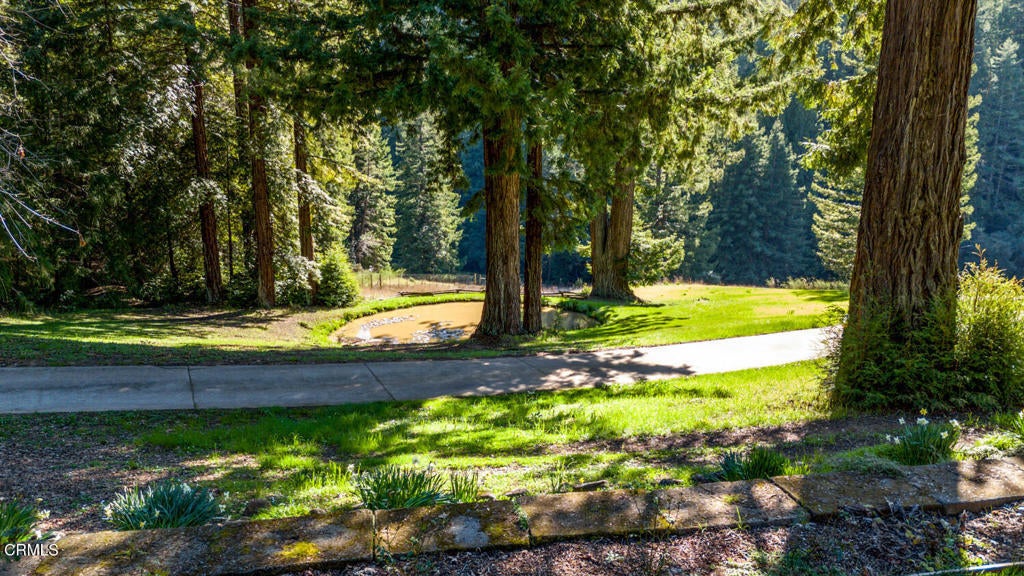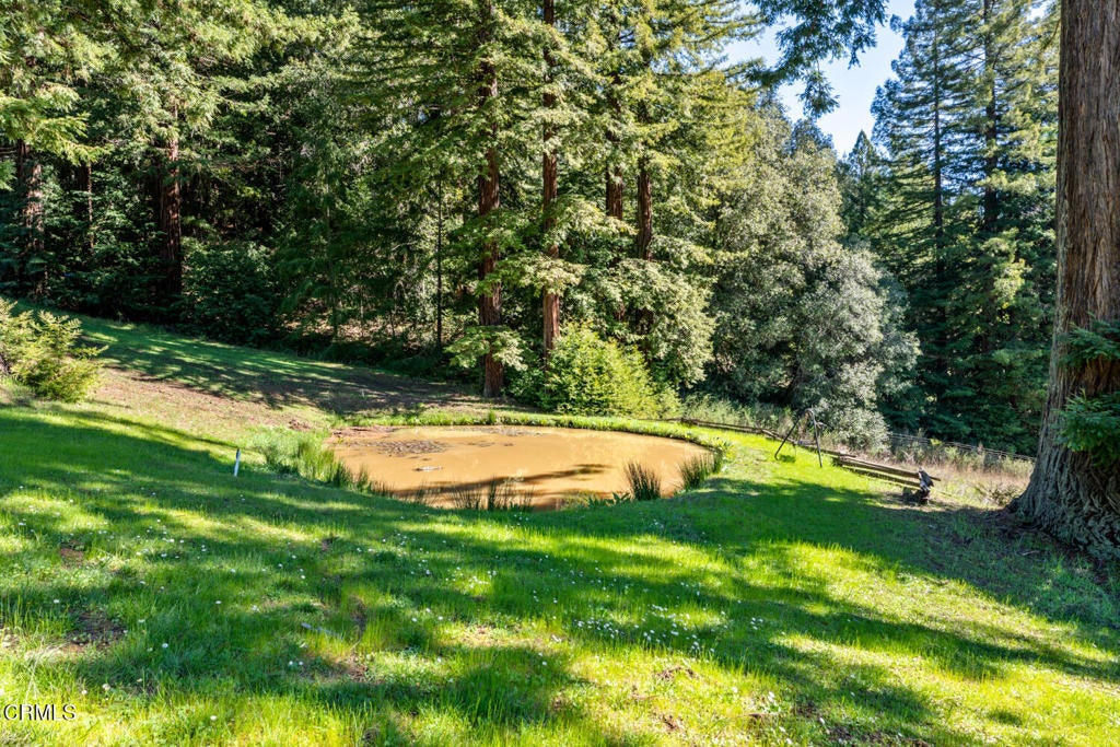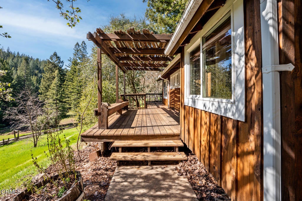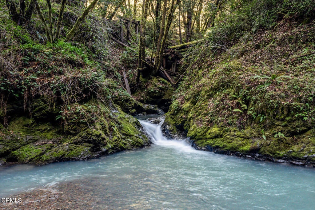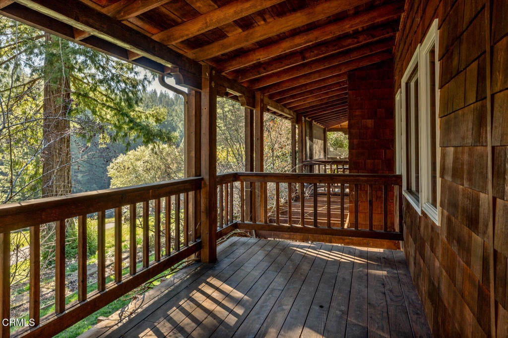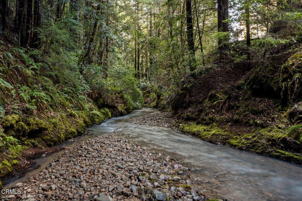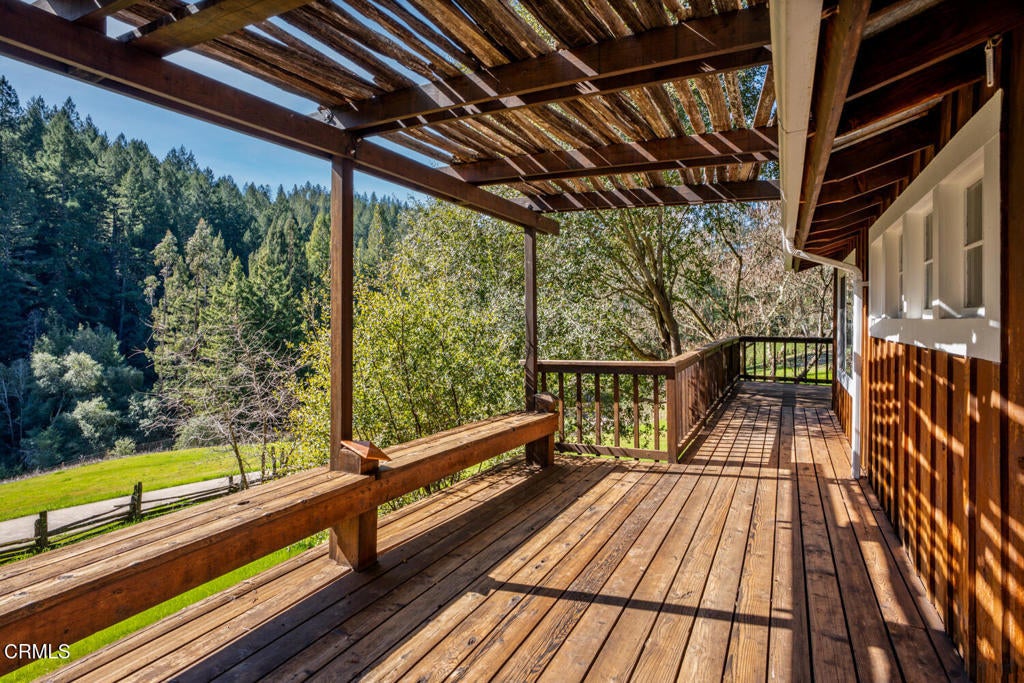 Winding along the gated, private drive as you enter into Mill Creek Meadows, this 40-acre estate, complete with a main house and studio, separate guest house and workshop, rolling meadows, tree-lined pathways, and year-round creek with waterfall, exudes rustic elegance. The main residence features beautiful hand-hewn timber beams inside and out and is sited at a generous elevation, offering incredible views from virtually every vantage point. An inviting wisteria-draped front porch entrance opens into the first-floor great room. The central core of this room boasts a two-story vaulted ceiling above the dining area and is flanked on one side by the living room and on the other, a kitchen, both with ceilings at a lower profile. The farmhouse-style kitchen is striking with its wraparound counter and breakfast bar, exposed beams and rafters, coffered ceiling and abundant cabinetry. The second floor hosts the primary bedroom suite, bath/laundry and family room, and includes a screened-in porch and steps that lead to a beautiful rose and vegetable garden. The detached studio visually blends into the landscape and features a spacious second bedroom and bath. The grounds are truly spectacular. There are stretches of meadows, terraced gardens, apple orchards, and stands of majestic Redwoods. Additional features include perimeter fencing, a paved driveway, a 3-car garage, green house, and 3 wells.