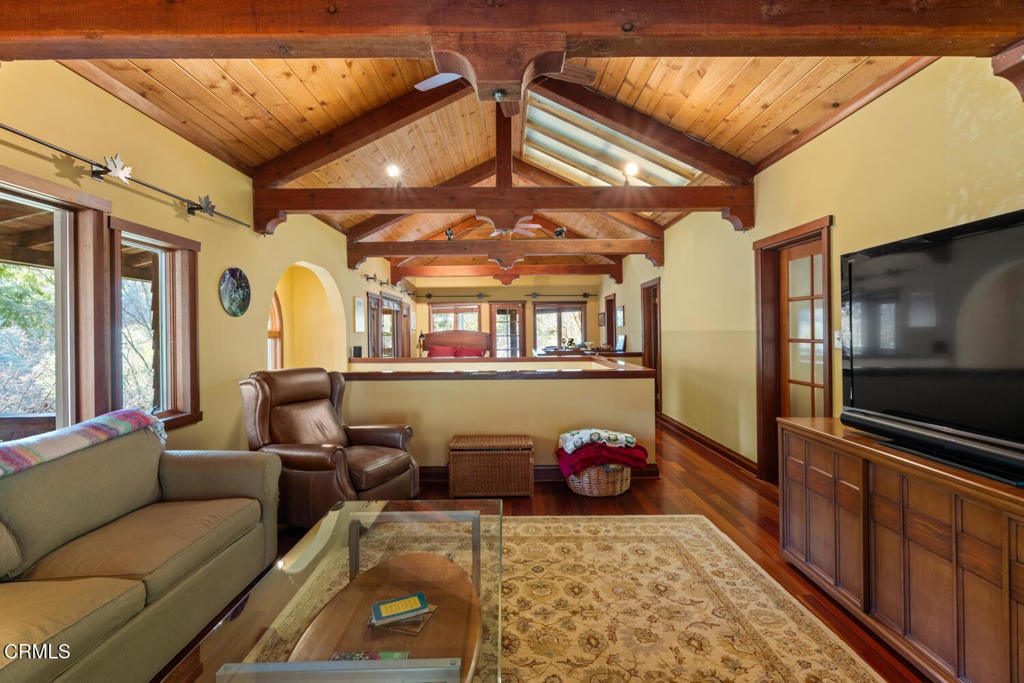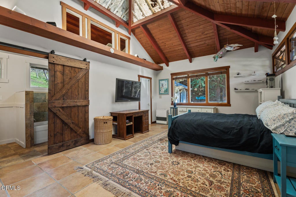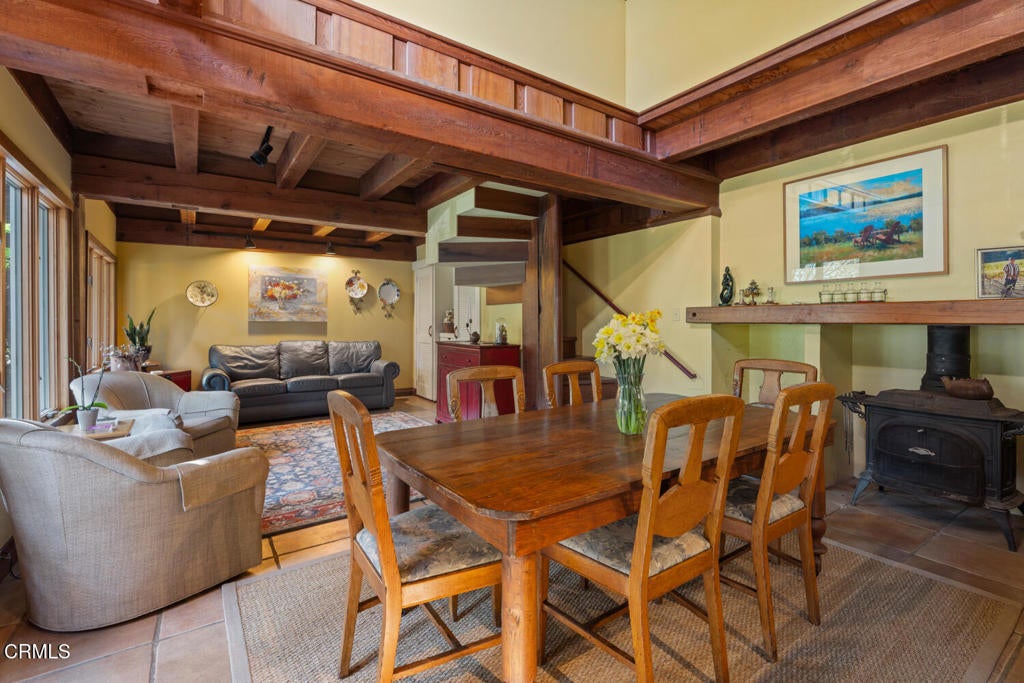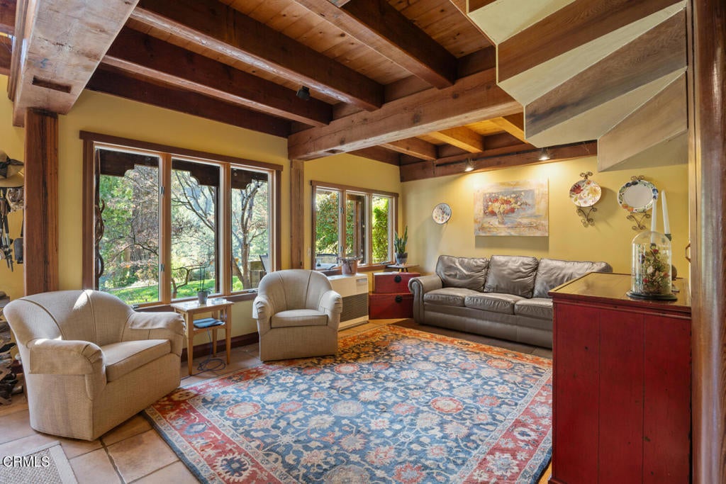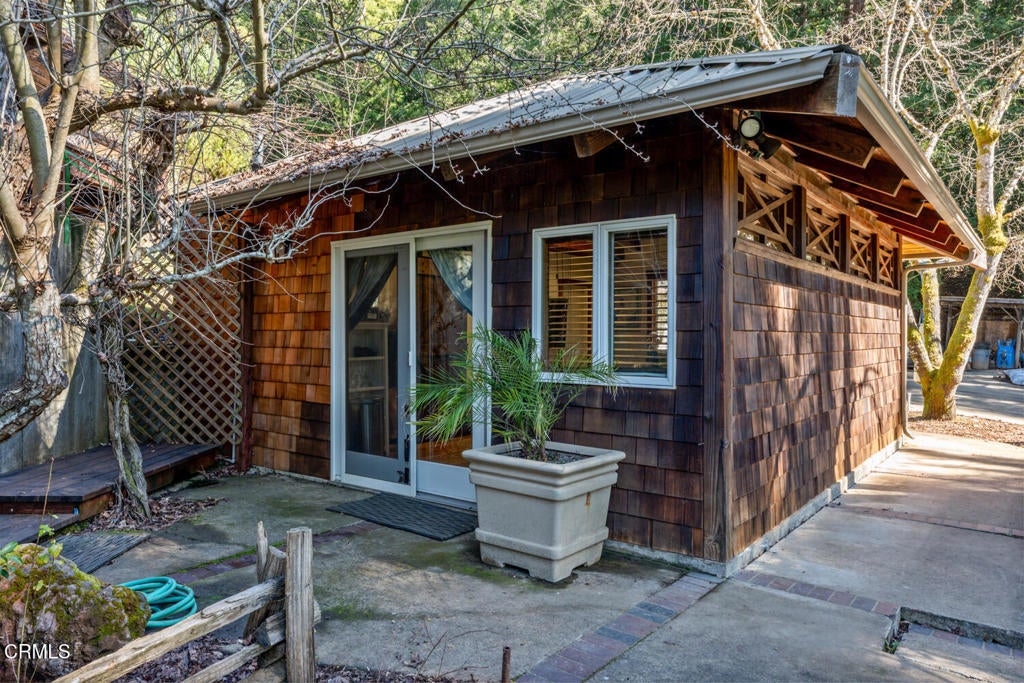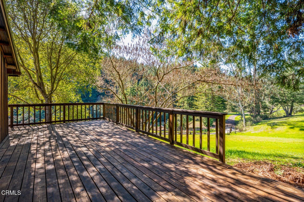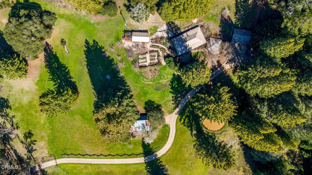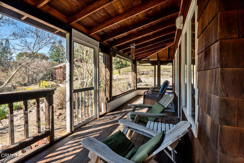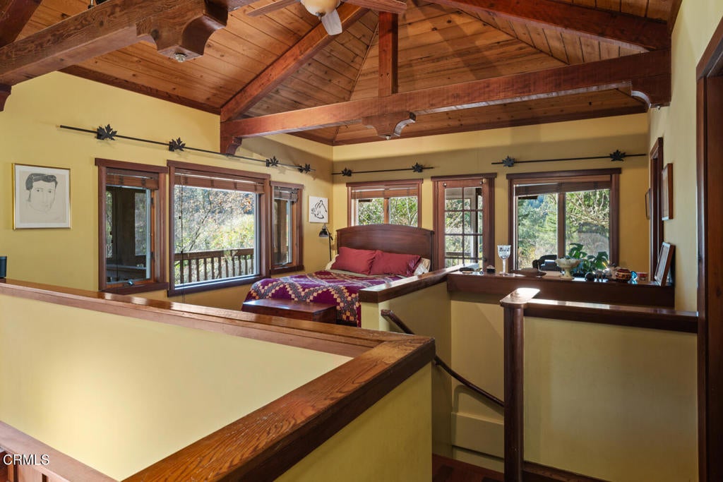 Winding along the gated, private drive as you enter into Mill Creek Meadows, this 40-acre estate, complete with a main house and studio, separate guest house and workshop, rolling meadows, tree-lined pathways, and year-round creek with waterfall, exudes rustic elegance. The main residence features beautiful hand-hewn timber beams inside and out and is sited at a generous elevation, offering incredible views from virtually every vantage point. An inviting wisteria-draped front porch entrance opens into the first-floor great room. The central core of this room boasts a two-story vaulted ceiling above the dining area and is flanked on one side by the living room and on the other, a kitchen, both with ceilings at a lower profile. The farmhouse-style kitchen is striking with its wraparound counter and breakfast bar, exposed beams and rafters, coffered ceiling and abundant cabinetry. The second floor hosts the primary bedroom suite, bath/laundry and family room, and includes a screened-in porch and steps that lead to a beautiful rose and vegetable garden. The detached studio visually blends into the landscape and features a spacious second bedroom and bath. The grounds are truly spectacular. There are stretches of meadows, terraced gardens, apple orchards, and stands of majestic Redwoods. Additional features include perimeter fencing, a paved driveway, a 3-car garage, green house, and 3 wells.