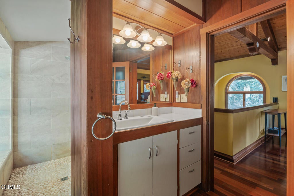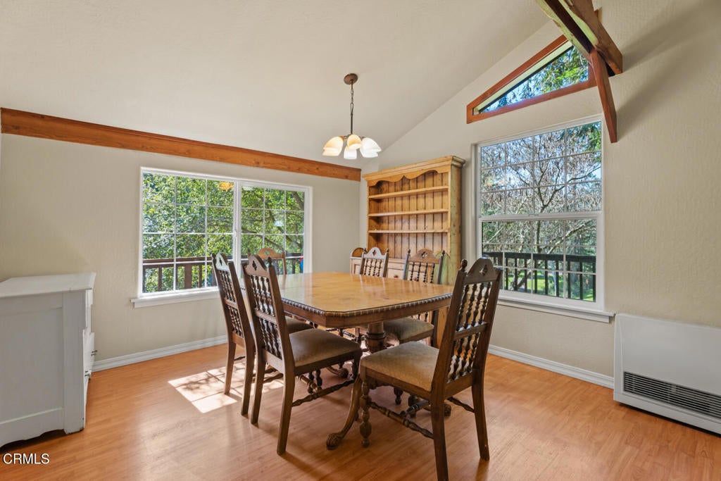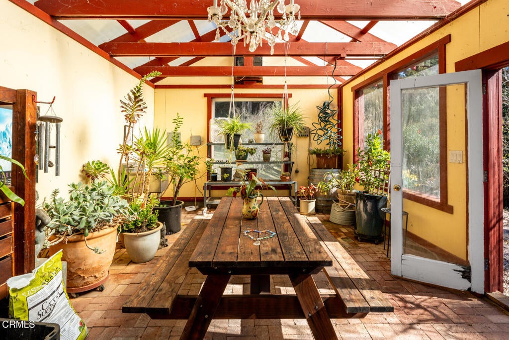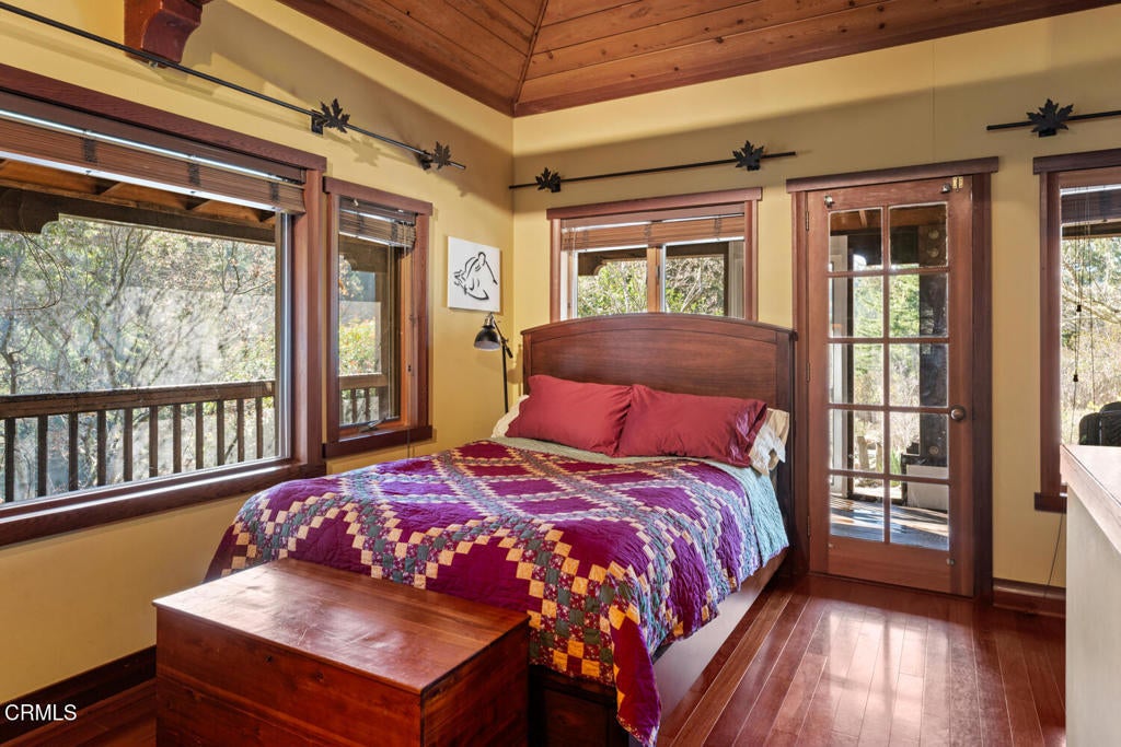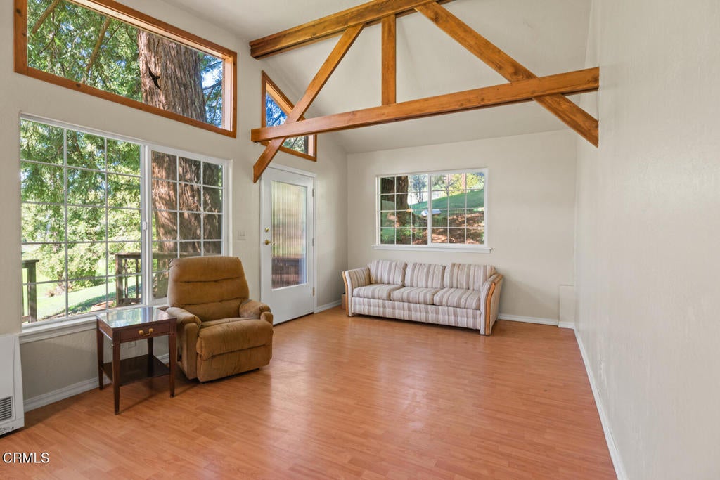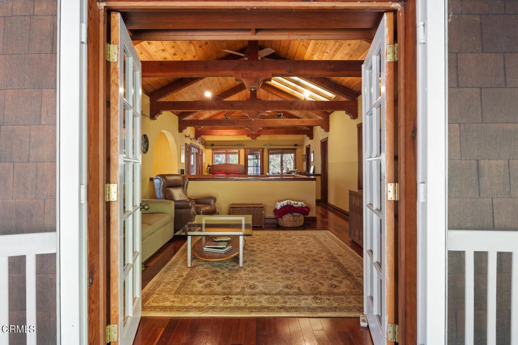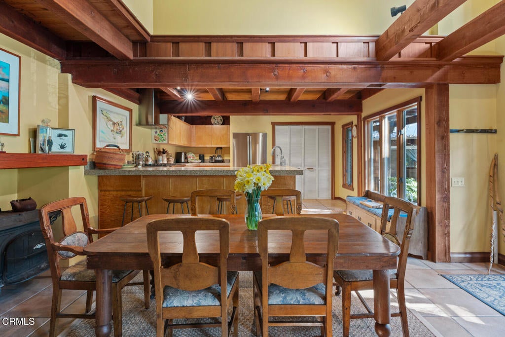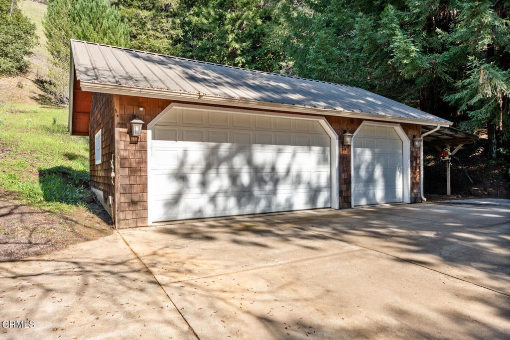 Winding along the gated, private drive as you enter into Mill Creek Meadows, this 40-acre estate, complete with a main house and studio, separate guest house and workshop, rolling meadows, tree-lined pathways, and year-round creek with waterfall, exudes rustic elegance. The main residence features beautiful hand-hewn timber beams inside and out and is sited at a generous elevation, offering incredible views from virtually every vantage point. An inviting wisteria-draped front porch entrance opens into the first-floor great room. The central core of this room boasts a two-story vaulted ceiling above the dining area and is flanked on one side by the living room and on the other, a kitchen, both with ceilings at a lower profile. The farmhouse-style kitchen is striking with its wraparound counter and breakfast bar, exposed beams and rafters, coffered ceiling and abundant cabinetry. The second floor hosts the primary bedroom suite, bath/laundry and family room, and includes a screened-in porch and steps that lead to a beautiful rose and vegetable garden. The detached studio visually blends into the landscape and features a spacious second bedroom and bath. The grounds are truly spectacular. There are stretches of meadows, terraced gardens, apple orchards, and stands of majestic Redwoods. Additional features include perimeter fencing, a paved driveway, a 3-car garage, green house, and 3 wells.