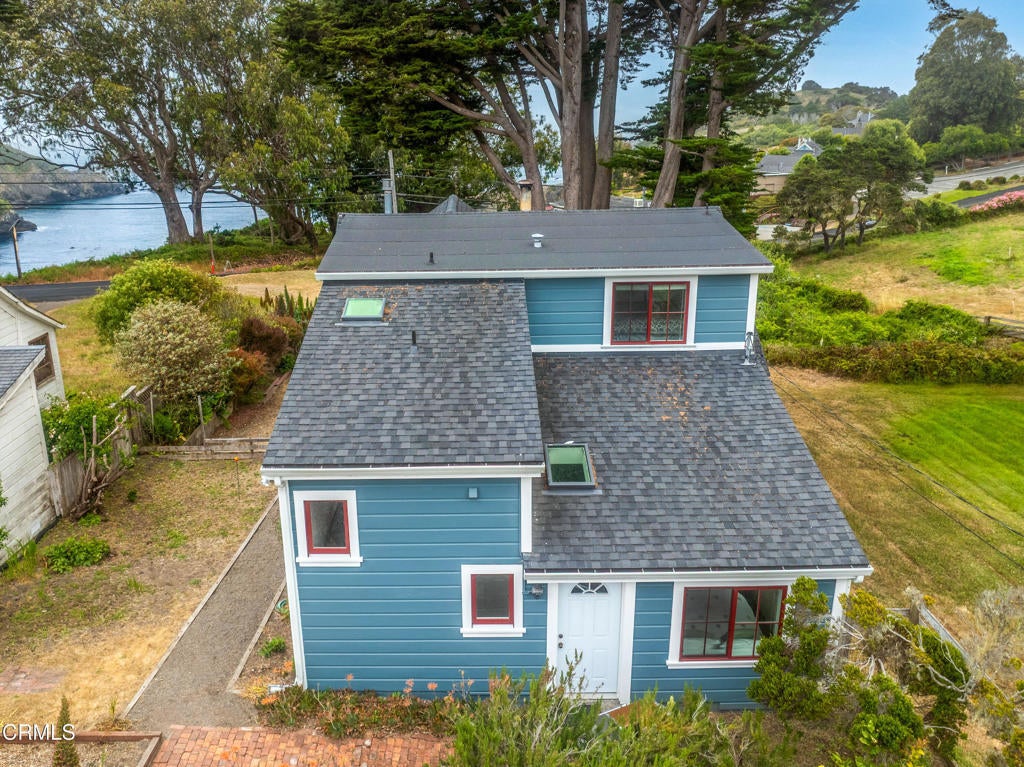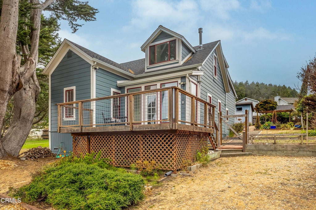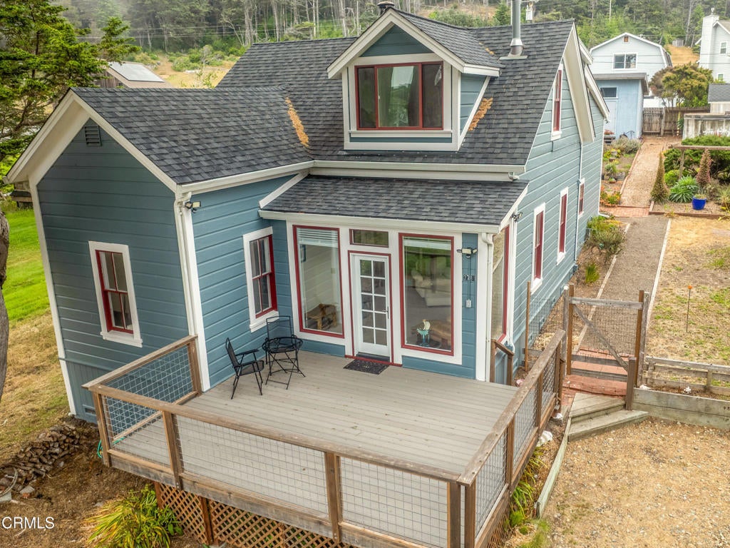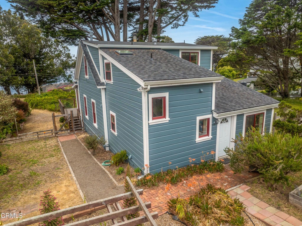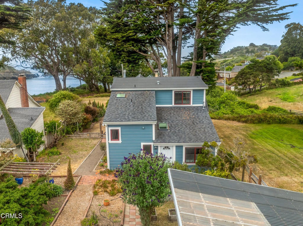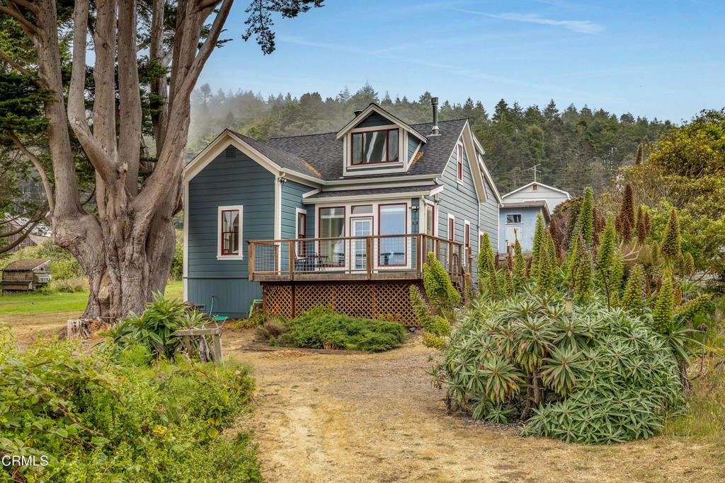 Quintessential Cape-style home with saltbox lines overlooking the Albion Cove and the dramatic Pacific Ocean. On entering the home, you will find open living and dining spaces with a wood-burning stove and airy vaulted ceilings. The kitchen is both spacious and functional with ample cabinetry and counter space. There are three bedrooms on the first floor, with one of the bedrooms offering flexible use as a den or office and a bath featuring a shower/tub combination and two sinks. The upstairs, with its separate entry, has been remodeled to provide a cozy living space with one bedroom and a bath containing a stall shower with beautiful cobalt blue tiling, and a great room complete with a free-standing fireplace, a charming nook, and a 3-sided window seat sporting tree-framed views of Albion River cove. At the back of the property, you will find raised flower beds, a green house, a workshop, and second utility shed. With its great curb appeal and friendly neighborhood vibe, this property is the perfect place to call home!