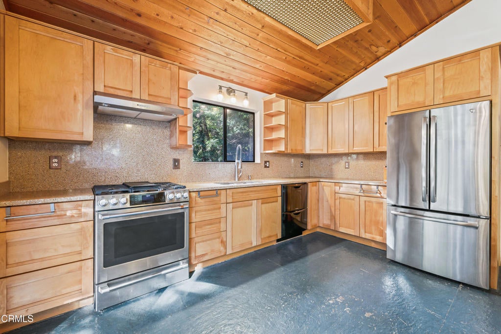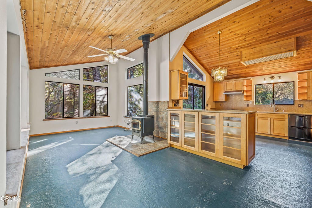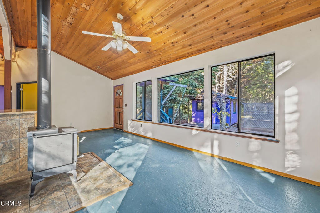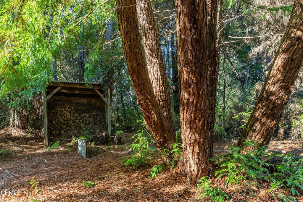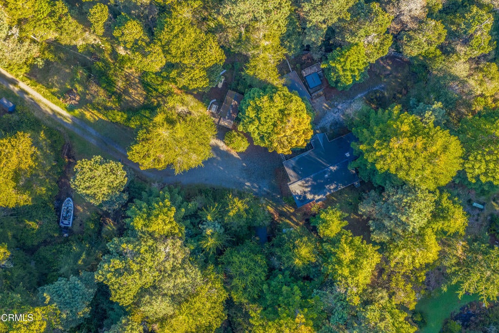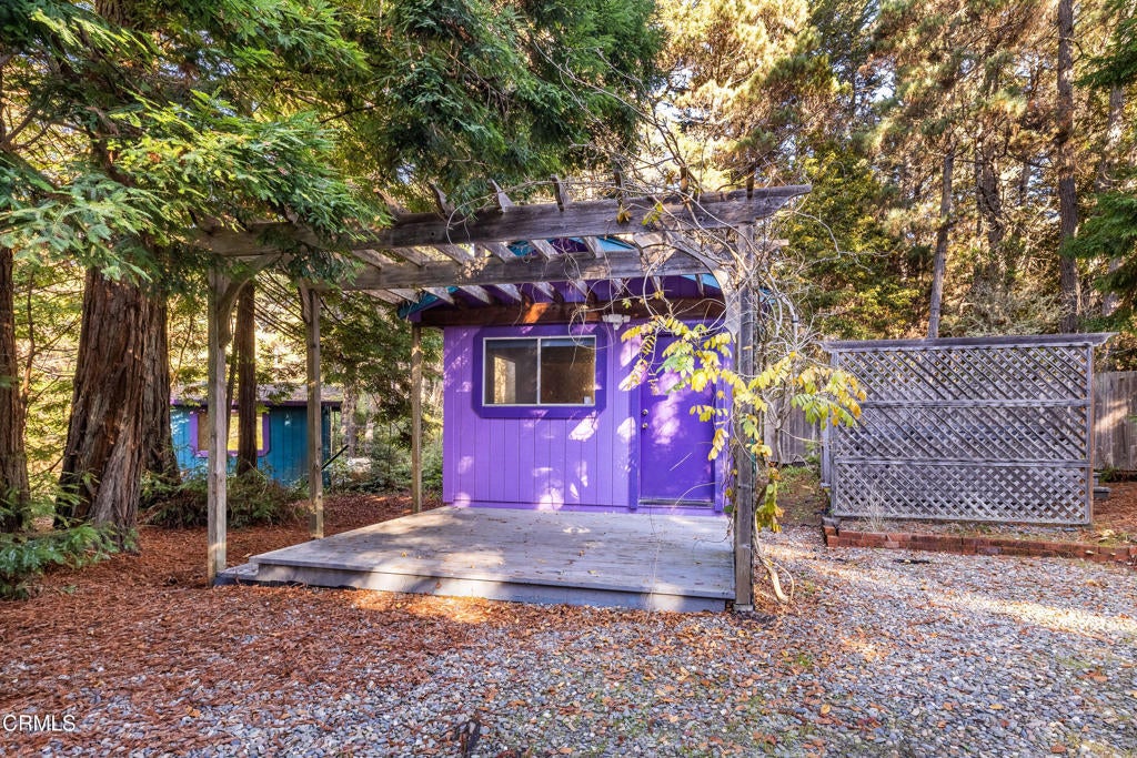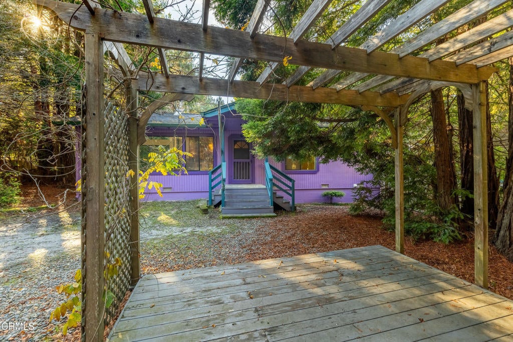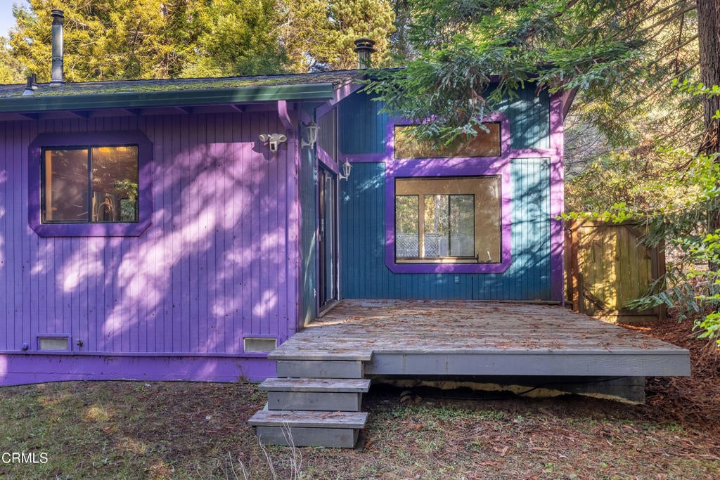 Tucked away down a private drive and embraced by towering redwoods, swaying grasses, and the calming sounds of the forest, this inviting retreat offers a rare sense of home, hope, and cheeriness within a truly sylvan escape. Here, total privacy unfolds as the landscape opens to a warm and welcoming residence designed to live in harmony with its natural surroundings. Built in 1991, the home features 2 bedrooms and 2 bathrooms and is filled with unfiltered natural light throughout the day. Vaulted ceilings and dramatic walls of glass create an airy interior, with large picture windows along one wall and floor-to-ceiling windows on the opposite side, seamlessly blending indoor living with the beauty of the forest beyond. A freestanding wood stove adds warmth and ambiance, making the home especially inviting during cooler evenings. The spacious chef's kitchen is thoughtfully designed with a beautiful new gas range, granite countertops, and ample room for cooking, gathering, and entertaining. The primary suite is a peaceful retreat, offering a large walk-in closet and an ensuite bathroom where a soaking tub overlooks tranquil forest views. A newly tiled guest bathroom adds a fresh, modern touch. Outdoor living is just as compelling, with a rear deck perfect for enjoying serene forested vistas. Multiple outbuildings in excellent condition provide abundant space for storage, hobby projects, or creative use, including a dedicated art studio complete with electricity and a sink. The property is further enhanced by a self-sustaining setup with a new generator and water storage tank, along with a beautiful new spa with privacy fencing for quiet relaxation under the trees. Set on 1.88 acres this property offers additional flexibility and long-term potential. The acreage makes it an ideal opportunity for those interested in adding a second residence, guest house, or expanding the existing footprint--allowing you to personalize and grow into this special redwood sanctuary over time.