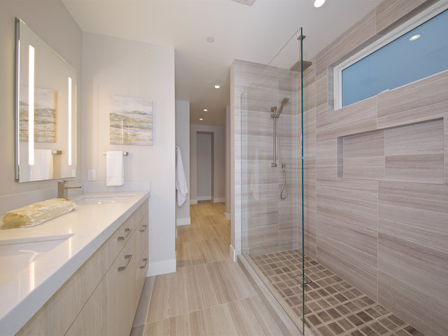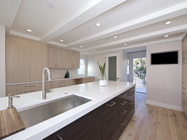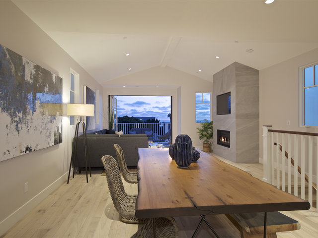 Your mood will certainly improve upon arrival as you soak in all the custom features throughout. Be prepared to be impressed as you enter through the large walnut pivot door with etched glass, custom hand-scraped walnut floors throughout this reverse floor plan, with the primary living area on the upper level revealing a spacious open floor plan for entertaining as the open flow living room, dining room and kitchen is flanked by east and west facing spacious decks. The sleek bi-folding doors open the living room out to the ocean view west facing deck, a Montigo linear fireplace sets just inside. Featuring a most impressive modern chef’s kitchen with custom European cabinetry throughout, gorgeous stone counters and a dining bar, top of the line Miele appliances integrated into the cabinetry, adjacent built in desk and powder room and a sunny east facing balcony off the kitchen leading to a private rooftop deck, where sunsets surely will welcome you home. The middle level consists entirely of the spacious master suite, offering privacy, and featuring bi-fold doors to a breezy balcony, spa like master bath, spacious walk in closet and laundry closet are included in the master retreat. A fully finished two-car garage also are found on the entry middle level. The lower level features custom venetian plaster at lower staircase leading to two bedrooms, two full baths with custom cabinetry and artful tile detail, and an additional built-in laundry closet with flexible open spacious rooms to provide flexible options for use as secondary bedrooms, an office, theatre, or a game room. The automatic irrigation system provides easy lock and go lifestyle.