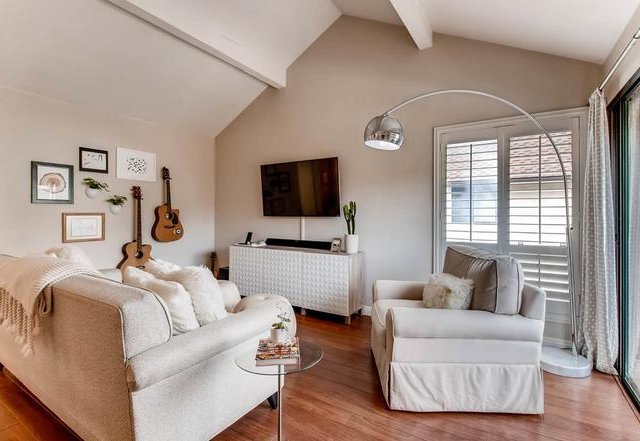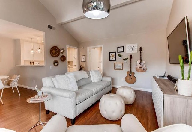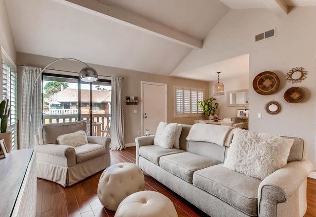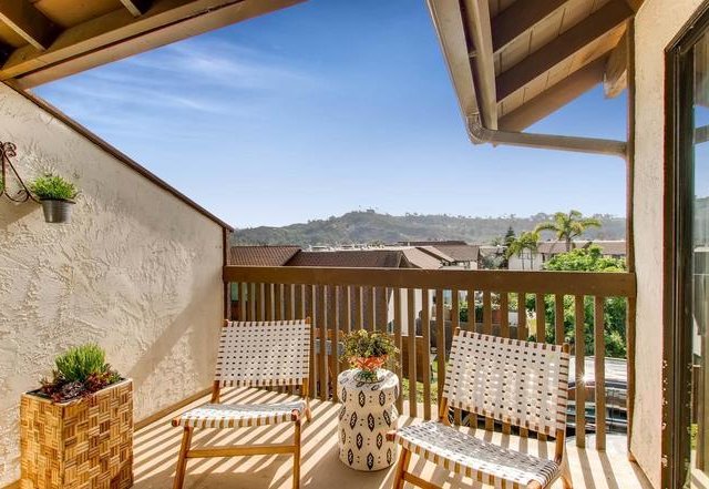 Enjoy the ocean breeze and ocean/lagoon views from this ultimate coastal lifestyle retreat. Tucked in a private location, this upstairs bright/airy, end unit condo, has high vaulted ceilings, wood floors, one car garage and a full-sized laundry room. Easily convert laundry room to add a second bathroom. New under construction bike path makes Cardiff beaches, shopping, restaurants and elementary school, just minutes away. Great rental property investment opportunity in highly sought after Cardiff!