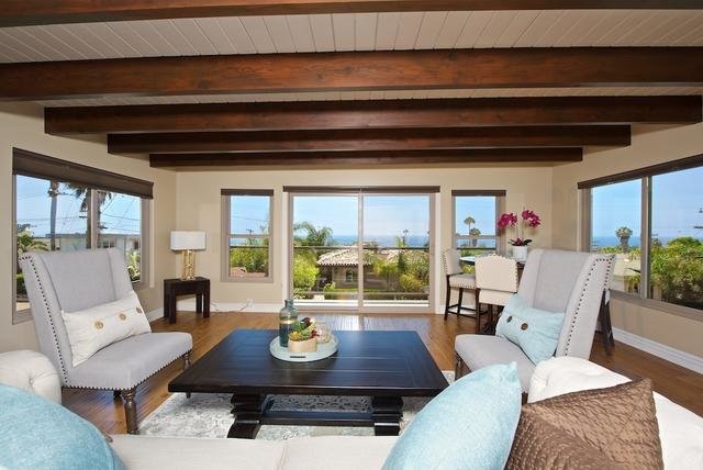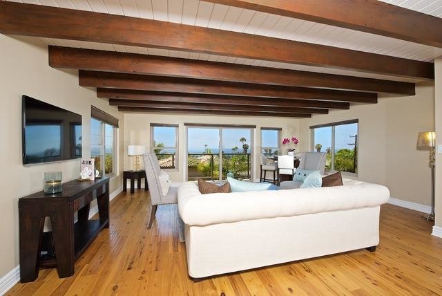 Reduced! PANORAMIC OCEAN VIEWS and year-round gorgeous sunsets in the desirable Walking District of Cardiff by the Sea, this unique property lives like a single story and offers hardwood flooring, beamed ceilings, granite kitchen, stainless steel appliances, upgraded baths, & two private decks to enjoy endless views of the Pacific Ocean. The spacious master suite offers views, luxurious master bath with dual vanity and a walk-in shower. Walking distance to award winning restaurants, shopping and beaches.