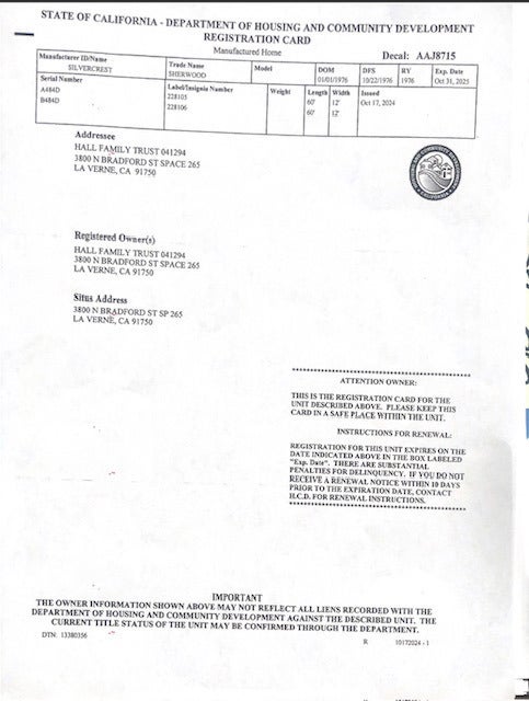 Double-Wide Beauty in Twin Oaks – 55+ Community in La Verne | North-Facing View! Welcome to Space 265, a stunning 2-bedroom, 2-bathroom Silvercrest double-wide located in the highly desirable Twin Oaks 5-Star Senior Community in La Verne. This beautifully upgraded home offers a spacious and open floor plan with 1,440 sq. ft. of thoughtfully designed living space and a north-facing orientation that brings in lots of natural light This home is filled with unique and desirable features, including drywall throughout, crown molding, recessed and track lighting, dual-pane windows, custom shutters, and a combination of plush carpeting and durable vinyl flooring. The remodeled kitchen is a true showpiece, featuring marble countertops, a charming garden window, a center island, built-in microwave, and gorgeous custom cabinetry—perfect for the home chef or entertainer at heart. The layout includes a spacious living room, a family room currently used as a home office, and two well-appointed bedrooms. The primary suite is a private retreat with mirrored closet doors, a remodeled en-suite bathroom, featuring a separate soaking tub and a beautiful walk-in shower. The second bedroom also includes mirrored closet doors and direct access to a second full bathroom, conveniently located near the indoor laundry room. Step outside to a semi-private, all-brick front porch with elegant wrought iron railing, a perfect place to sip coffee and take in the views. Just off the porch is a generously sized back patio, ideal for BBQing, gardening, or relaxing in the California sunshine. The home is beautifully landscaped with low-maintenance features, and the extended covered carport offers parking for multiple vehicles plus a large shed for additional storage. Twin Oaks is a premier 55+ community offering exceptional amenities, including a clubhouse, pool, spa, fitness center, sauna, billiards room, card room, and large multi-purpose room for social events. Located near shopping, restaurants, hospitals, public transportation, and major travel routes—this is senior living at its best. * Don’t miss this one-of-a-kind home—call now to schedule a private showing! ** Home is on REGISTRATION – No Property Taxes!** New Space Rent Per Park is $757.31.