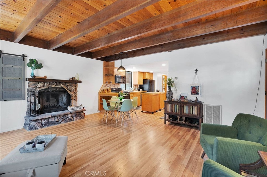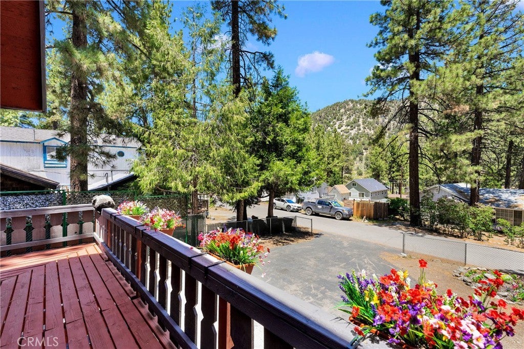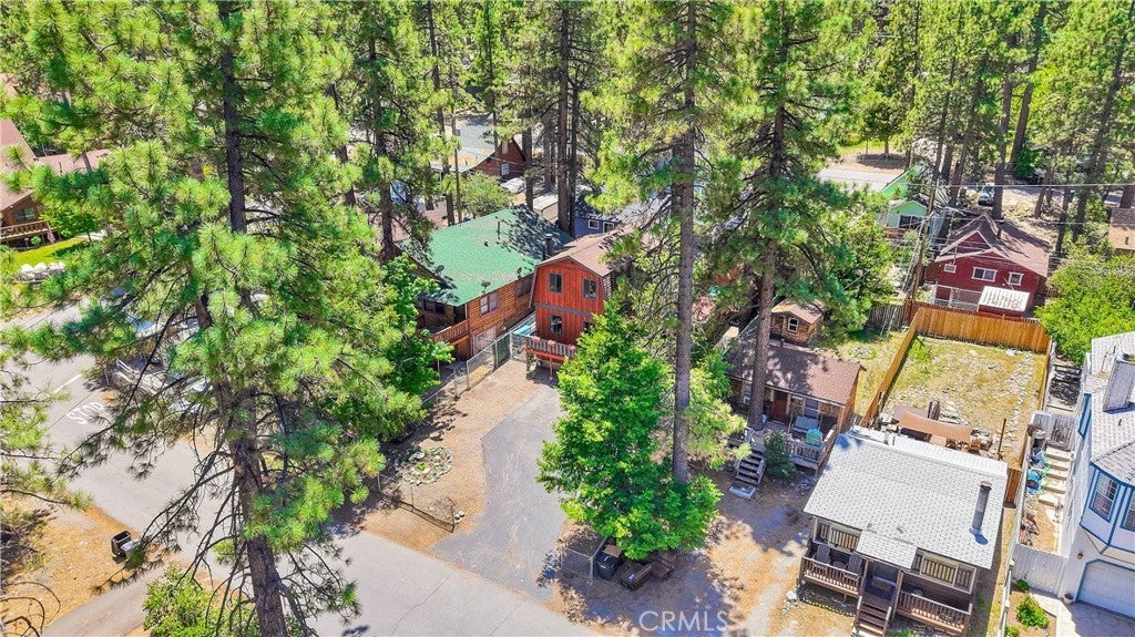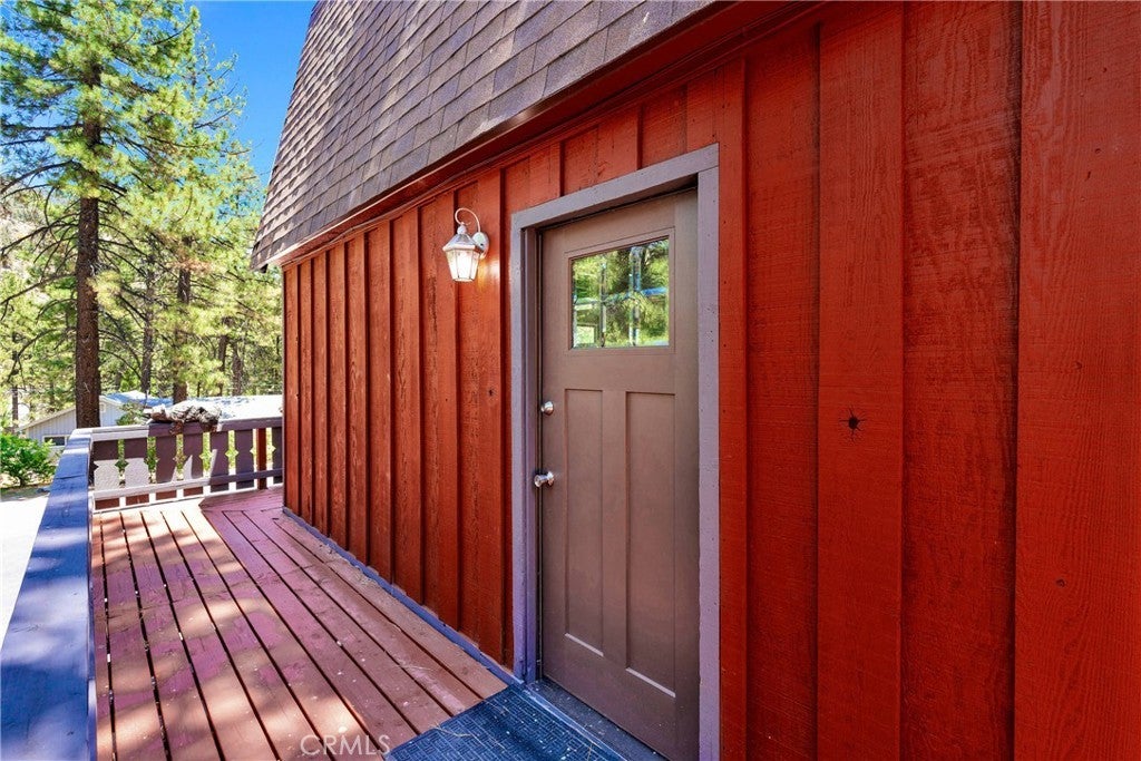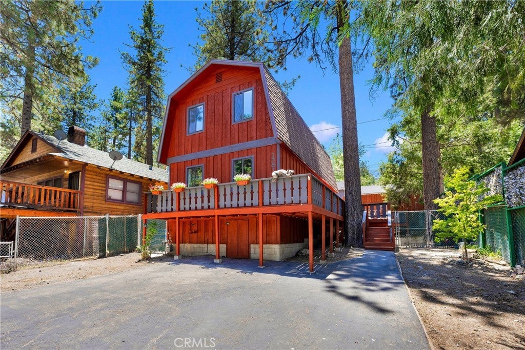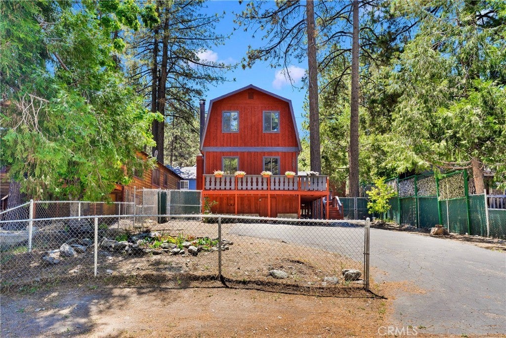 ‘ NEW MARKET PRICE “ STRATEGIC PRICE UPDATE ‘ VETERANS WELCOME !!! Hometown Hero Credit. Welcome home to your Wrightwood barndominium! With a unique gambrel-roof, it is brimming with rustic character and modern comforts. In the charming mountain community of Wrightwood. Village is within walking distance. This home has an expansive wrap around deck, patio area and perched higher above the street for privacy and stunning mountain views. This property invites you to relax and unwind on its expansive custom wrap around deck. This 2 story home features 2 bedrooms, one and a half baths., and a versatile bonus room downstairs- perfect for a third bedroom, home office, or home school space. Enter into a spacious light living room with a beautiful beamed and knotty pine high ceiling. Custom barn door style sliding shutters. On those wonderful winter nights, light up the natural rock wood burning fire place and gather around. Waterproof wood style flooring. The open concept kitchen is a chef's dream with Birchwood cabinets with custom hardware. Butcher block counters with tile back splash. Tons of storage and built in shelving. Two movable butcher block islands on wheels with storage, Built in pantry with pull out drawers.Recessed lighting. Dual pane windows. Laundry area down hall way with bathroom across with Travertine tile work. A glass door leads to the outside. . Slider doors lead onto the deck. Upstairs there are two bedrooms and a full spacious remodeled bathroom with custom tile counters which extends all the way around the bath tub and shower. with two shower heads. Front bedroom os very spacious with a large closet. Bed room on other side has a lighted closet. . Step out onto your custom wrap around deck and relax with a great sitting area. Think of dining Al Fresco on our beautiful summer nights. An 8 X 10 shed for extra storage on the back deck. Or maybe a potential play room. Property is cross fenced Plenty of parking. Basement storage. This home is turn key and ready for you to move in. This more than a home a home -- Come experience the peace, privacy, and charm of Wrightwood living. Come enjoy all the mountain activities in all four seasons. Mt. High is right up the road. Become a member of the Wrightwood Country Club.. There is a waiting list. Wrightwood Elementary is right down the road. Concrete septic tank.