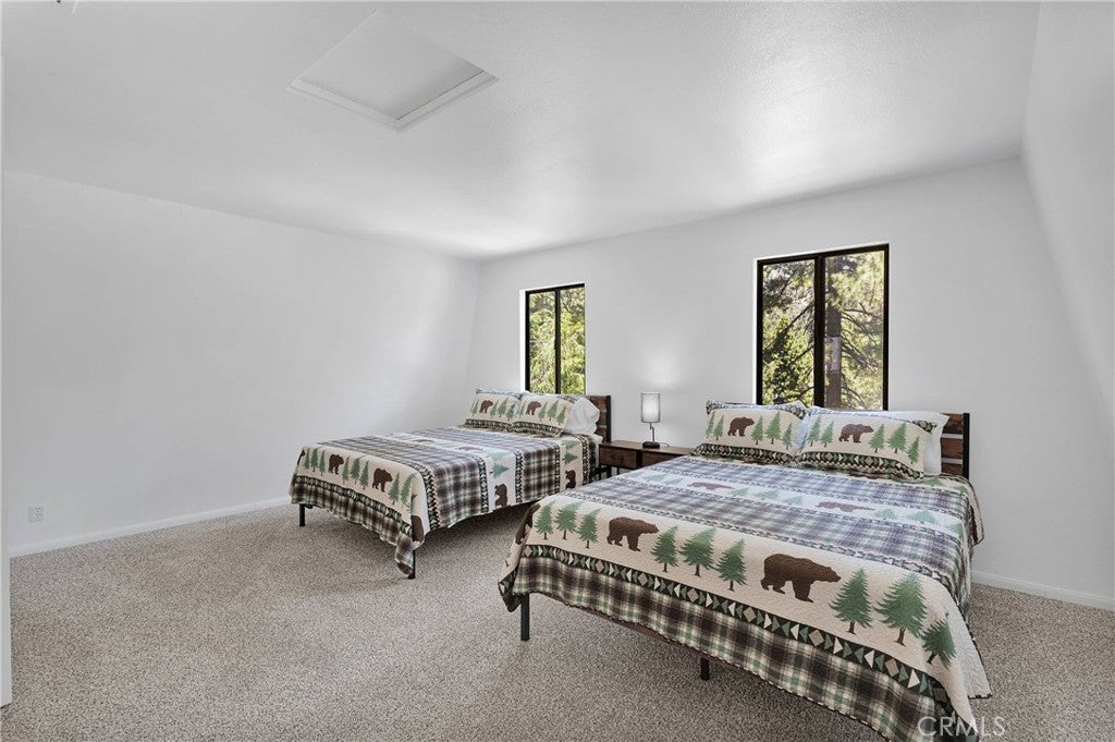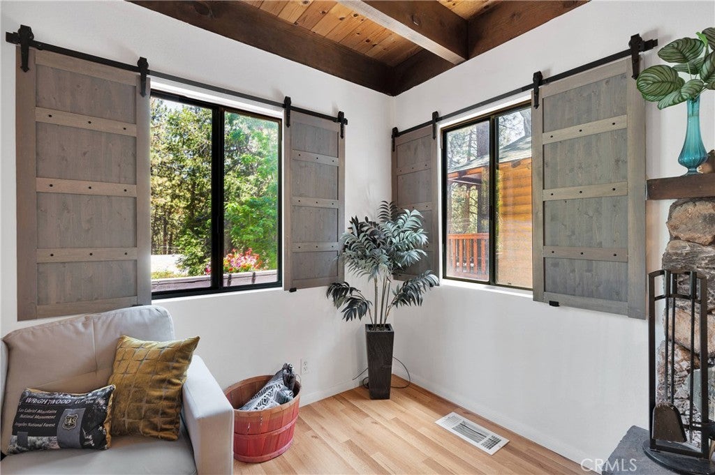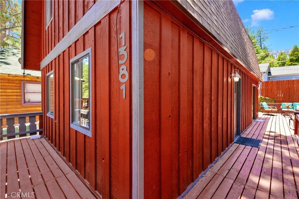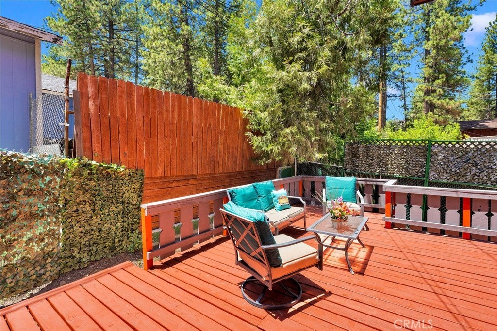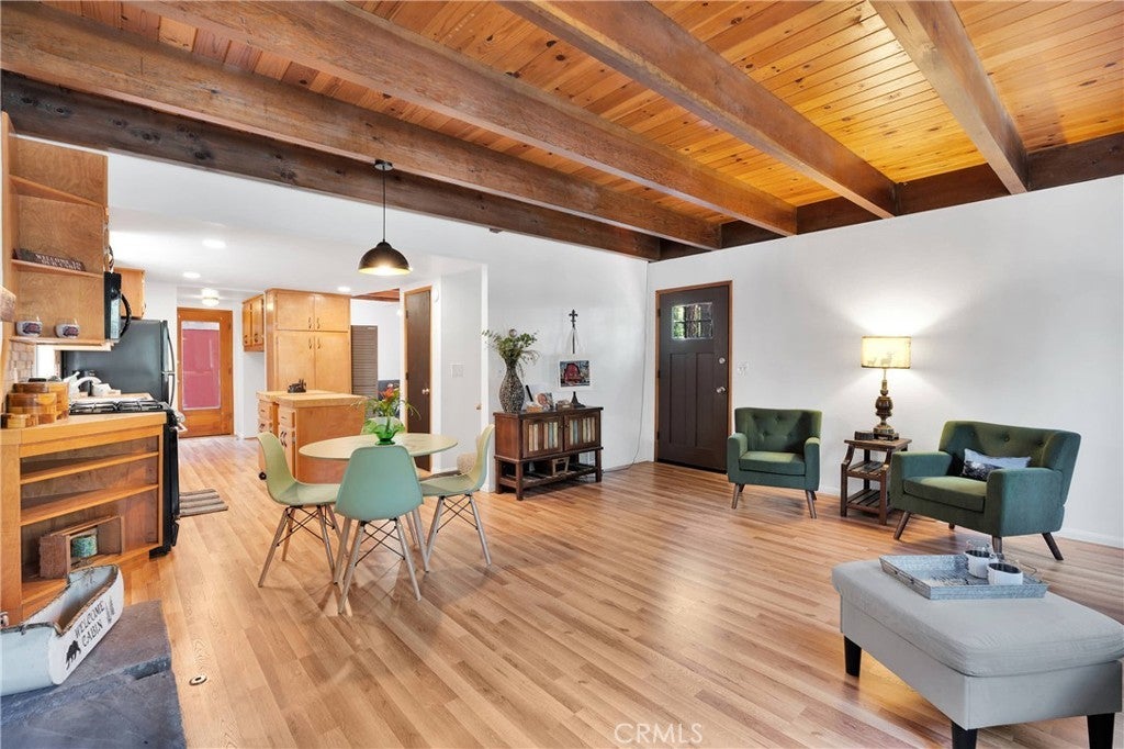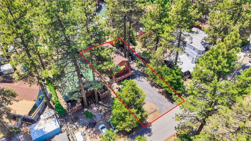 ‘ NEW MARKET PRICE “ STRATEGIC PRICE UPDATE ‘ VETERANS WELCOME !!! Hometown Hero Credit. Welcome home to your Wrightwood barndominium! With a unique gambrel-roof, it is brimming with rustic character and modern comforts. In the charming mountain community of Wrightwood. Village is within walking distance. This home has an expansive wrap around deck, patio area and perched higher above the street for privacy and stunning mountain views. This property invites you to relax and unwind on its expansive custom wrap around deck. This 2 story home features 2 bedrooms, one and a half baths., and a versatile bonus room downstairs- perfect for a third bedroom, home office, or home school space. Enter into a spacious light living room with a beautiful beamed and knotty pine high ceiling. Custom barn door style sliding shutters. On those wonderful winter nights, light up the natural rock wood burning fire place and gather around. Waterproof wood style flooring. The open concept kitchen is a chef's dream with Birchwood cabinets with custom hardware. Butcher block counters with tile back splash. Tons of storage and built in shelving. Two movable butcher block islands on wheels with storage, Built in pantry with pull out drawers.Recessed lighting. Dual pane windows. Laundry area down hall way with bathroom across with Travertine tile work. A glass door leads to the outside. . Slider doors lead onto the deck. Upstairs there are two bedrooms and a full spacious remodeled bathroom with custom tile counters which extends all the way around the bath tub and shower. with two shower heads. Front bedroom os very spacious with a large closet. Bed room on other side has a lighted closet. . Step out onto your custom wrap around deck and relax with a great sitting area. Think of dining Al Fresco on our beautiful summer nights. An 8 X 10 shed for extra storage on the back deck. Or maybe a potential play room. Property is cross fenced Plenty of parking. Basement storage. This home is turn key and ready for you to move in. This more than a home a home -- Come experience the peace, privacy, and charm of Wrightwood living. Come enjoy all the mountain activities in all four seasons. Mt. High is right up the road. Become a member of the Wrightwood Country Club.. There is a waiting list. Wrightwood Elementary is right down the road. Concrete septic tank.