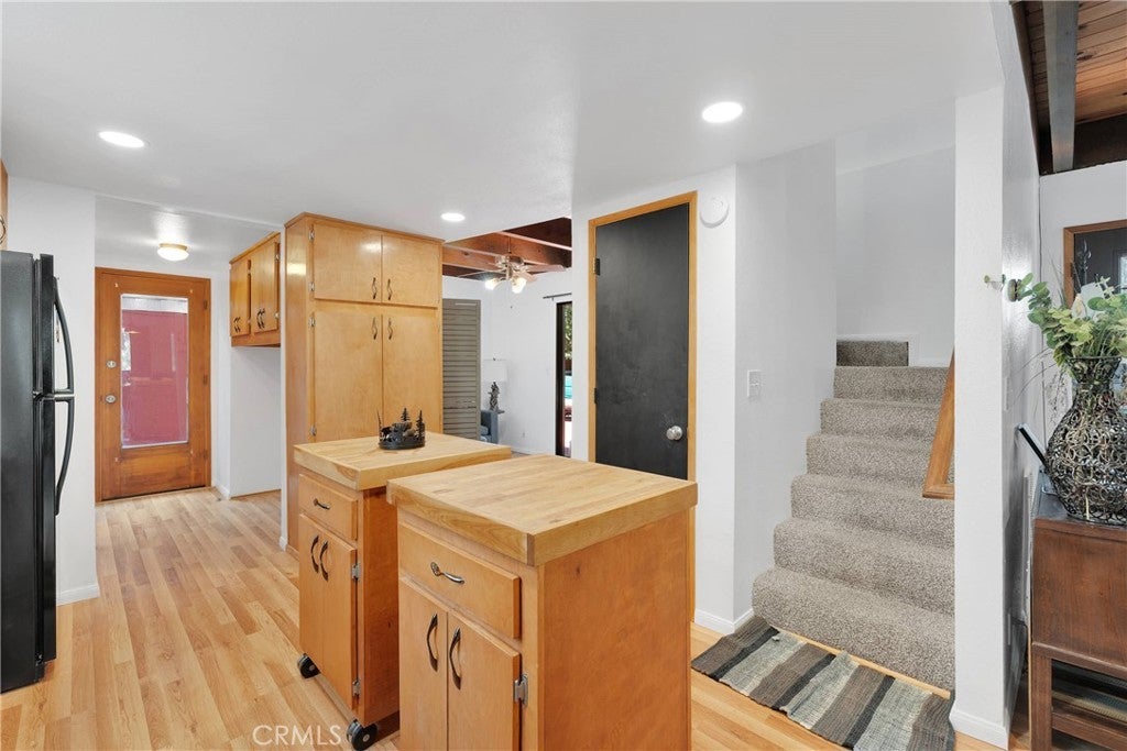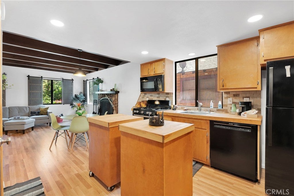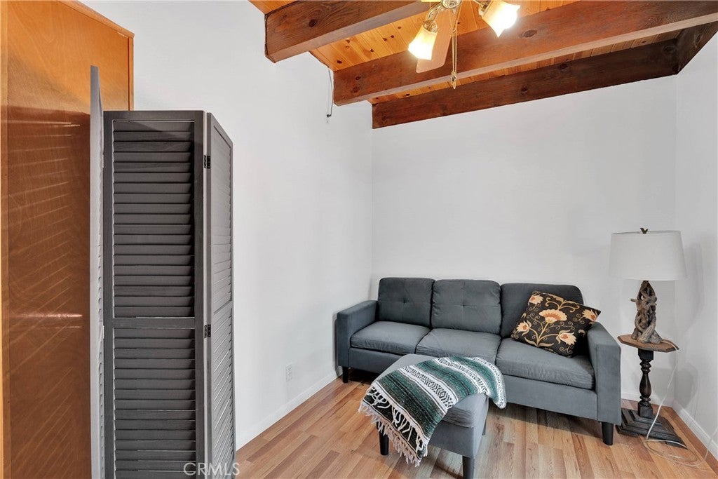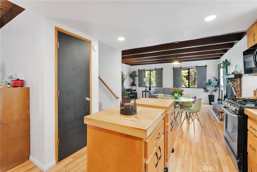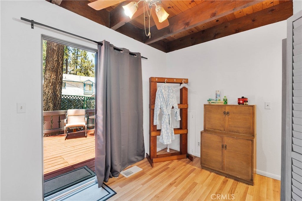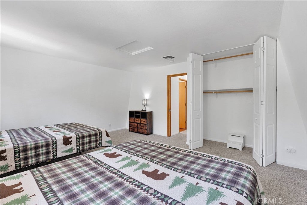 ‘ NEW MARKET PRICE “ STRATEGIC PRICE UPDATE ‘ VETERANS WELCOME !!! Hometown Hero Credit. Welcome home to your Wrightwood barndominium! With a unique gambrel-roof, it is brimming with rustic character and modern comforts. In the charming mountain community of Wrightwood. Village is within walking distance. This home has an expansive wrap around deck, patio area and perched higher above the street for privacy and stunning mountain views. This property invites you to relax and unwind on its expansive custom wrap around deck. This 2 story home features 2 bedrooms, one and a half baths., and a versatile bonus room downstairs- perfect for a third bedroom, home office, or home school space. Enter into a spacious light living room with a beautiful beamed and knotty pine high ceiling. Custom barn door style sliding shutters. On those wonderful winter nights, light up the natural rock wood burning fire place and gather around. Waterproof wood style flooring. The open concept kitchen is a chef's dream with Birchwood cabinets with custom hardware. Butcher block counters with tile back splash. Tons of storage and built in shelving. Two movable butcher block islands on wheels with storage, Built in pantry with pull out drawers.Recessed lighting. Dual pane windows. Laundry area down hall way with bathroom across with Travertine tile work. A glass door leads to the outside. . Slider doors lead onto the deck. Upstairs there are two bedrooms and a full spacious remodeled bathroom with custom tile counters which extends all the way around the bath tub and shower. with two shower heads. Front bedroom os very spacious with a large closet. Bed room on other side has a lighted closet. . Step out onto your custom wrap around deck and relax with a great sitting area. Think of dining Al Fresco on our beautiful summer nights. An 8 X 10 shed for extra storage on the back deck. Or maybe a potential play room. Property is cross fenced Plenty of parking. Basement storage. This home is turn key and ready for you to move in. This more than a home a home -- Come experience the peace, privacy, and charm of Wrightwood living. Come enjoy all the mountain activities in all four seasons. Mt. High is right up the road. Become a member of the Wrightwood Country Club.. There is a waiting list. Wrightwood Elementary is right down the road. Concrete septic tank.