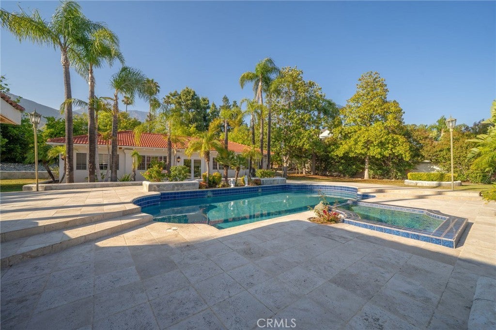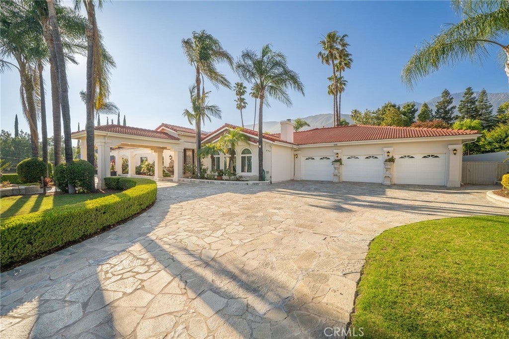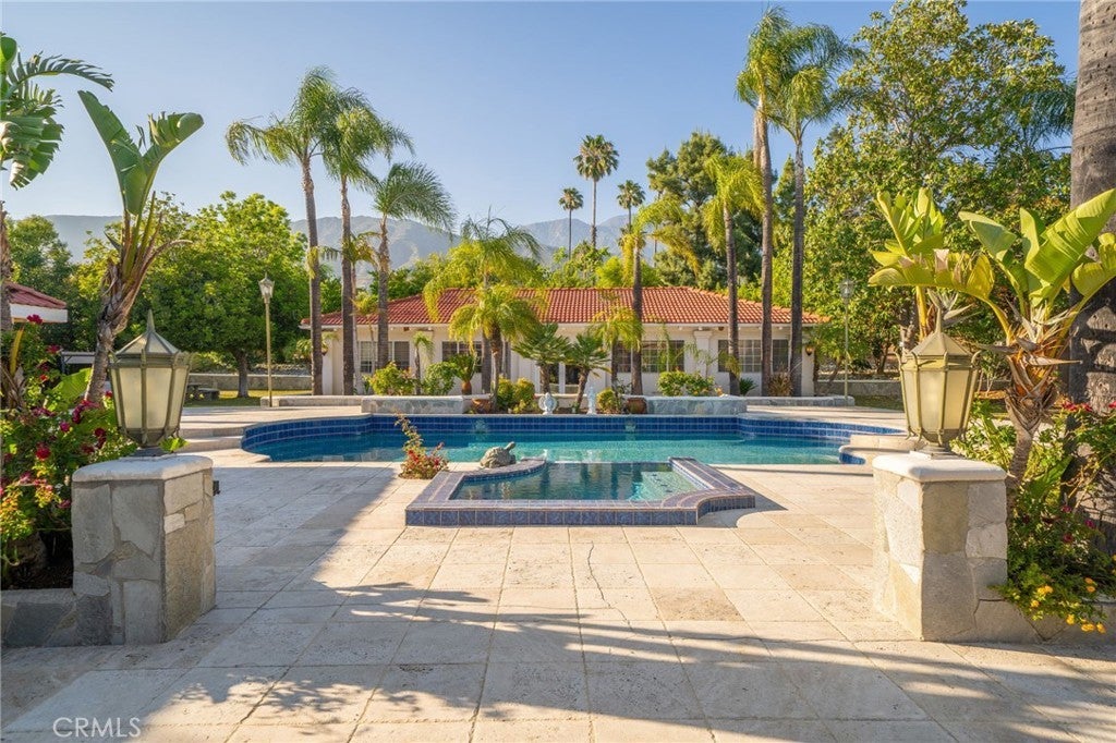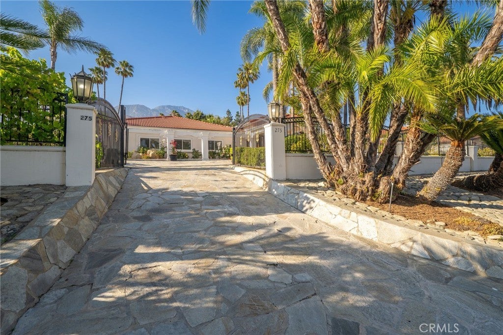 Welcome to 275 E. 24th Street, an exquisite, privately gated Single-Story Mediterranean Villa with Permitted Two Bedroom Guest House nestled in the prestigious San Antonio Heights. This rare estate offers the perfect blend of luxury, comfort, and privacy, situated on an expansive 40,000 SF flat lot framed by lush, mature tropical landscaping. Extensively remodeled in 1990, the main residence boasts 5,534 SF of elegant living space, featuring 5 bedrooms, 6 bathrooms, and a private office. From the moment you arrive, a circular driveway and grand gated entrance welcome you to soaring ceilings with skylights allowing natural light, a formal living room with marble flooring, and panoramic views of the stunning backyard oasis. The chef’s kitchen is a dream with granite countertops, a large center island, stainless steel appliances, custom cabinetry, built-in desk, and direct views of the pool. Entertain with ease in the inviting family room with a built-in bar, sink, and wine fridge, or host formal gatherings in the elegant dining area. The luxurious primary suite offers a serene retreat with a double-door entry, cozy fireplace, walk-in closet, wet bar, and spa-inspired bathroom complete with jetted tub and oversized shower. Additional highlights include multiple ensuite bedrooms, an in-law suite with its own private living area and bathroom, and a dedicated office with built-ins. A major bonus is the Permitted 2012 built Single-Story Guest House, offering 1,182 SF with two bedrooms, one bathroom, living room with built-ins, kitchenette, oversized shower, and a private sauna, perfect for guests, extended family, or rental income. Step outside to your own resort-style paradise, featuring a sparkling pool and spa, expansive patios, manicured lawn areas, tropical gardens, and a covered outdoor kitchen with its own pool bathroom with shower. Additional amenities include an indoor laundry room, circular driveway, 3-car attached garage, and ample off-street parking. This is truly a one-of-a-kind estate offering luxury, versatility, and unforgettable outdoor living. Don’t miss your chance to own a piece of paradise in Upland!