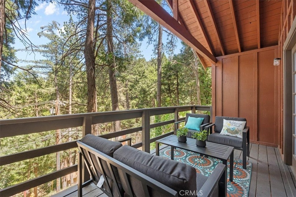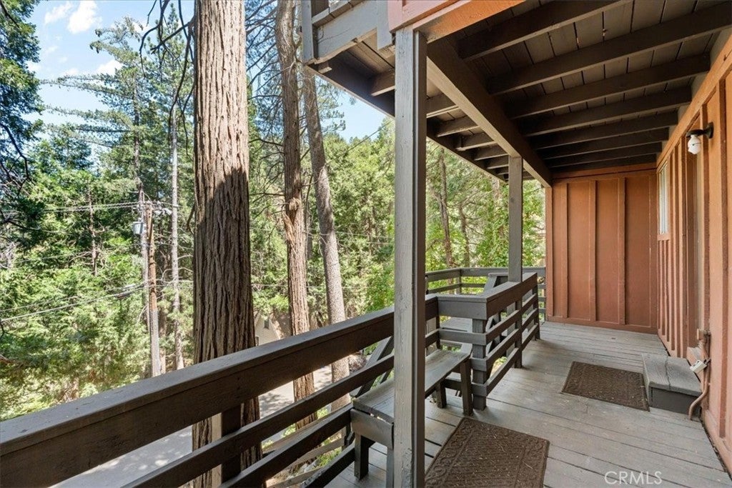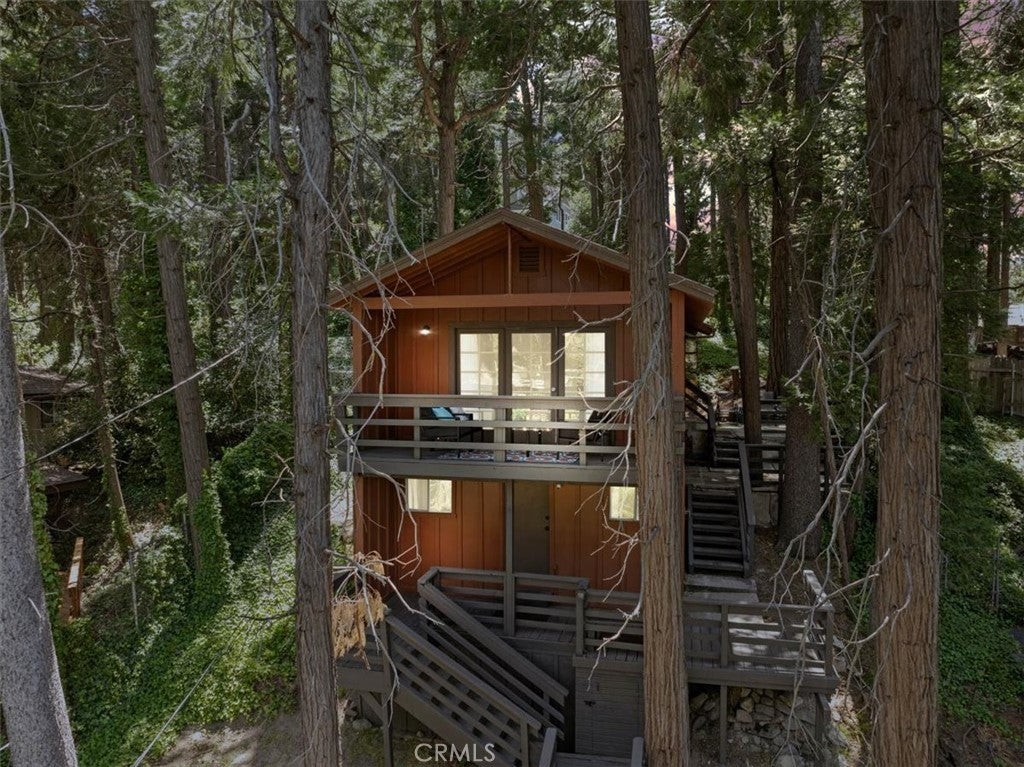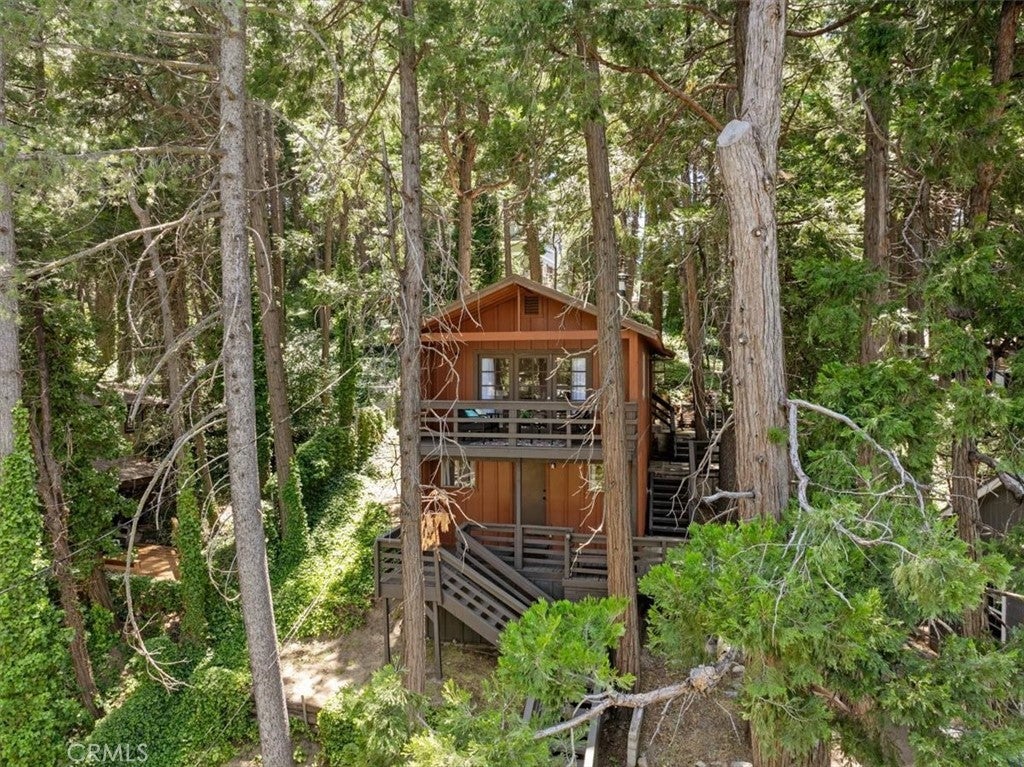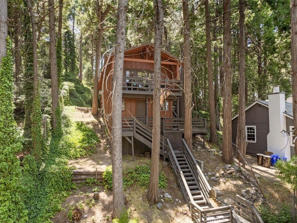 WELCOME TO THE BIRD HOUSE — Charming Crestline Mountain Retreat. Discover comfort, character, and stunning natural surroundings in this inviting multi-level home tucked away in the Crestline mountains. Designed to capture the beauty of its setting, this property offers a peaceful escape while remaining close to town conveniences and year-round recreation. The entry level features a private bedroom with convenient access to the basement, offering flexibility for guests, a home office, storage, or potential expansion. Upstairs, the bright and open main living area includes a second bedroom, a beautifully remodeled bathroom, and a well-appointed kitchen equipped with newer stainless steel appliances. The living room is centered around a classic wood-burning stove, creating a warm and cozy atmosphere during cool mountain evenings. Step outside onto the balcony and enjoy sweeping views of the surrounding forest and mountains—a perfect spot for morning coffee, sunset watching, or quiet relaxation. The home sits on a spacious, secluded lot surrounded by mature trees, providing privacy and a true mountain-living experience. Private walking trails wind through the property, ideal for peaceful nature strolls, exploring, or simply breathing in the fresh mountain air. A large deck offers additional outdoor space for entertaining or unwinding while taking in the natural beauty of the area. Additional features include ceiling fans throughout the home for year-round comfort and a layout that maximizes both indoor and outdoor living options. Located just minutes from Lake Gregory and downtown Crestline, the property offers easy access to local dining, shops, and a wide variety of seasonal activities. Enjoy hiking, fishing, swimming, and paddle boarding during the warmer months, and take advantage of nearby skiing and snowboarding in winter. Crestline’s vibrant community events—such as Jubilee Days, the annual 4th of July parade, and weekly farmers markets—add to the appeal of this charming mountain town. As an added bonus, this home offers front-row views of the spectacular Fourth of July fireworks over Lake Gregory, providing a unique and memorable experience right from the property. Whether you’re searching for a full-time residence, a relaxing vacation retreat, or an attractive investment opportunity, The Bird House is a special find that beautifully blends comfort, nature, and mountain charm.